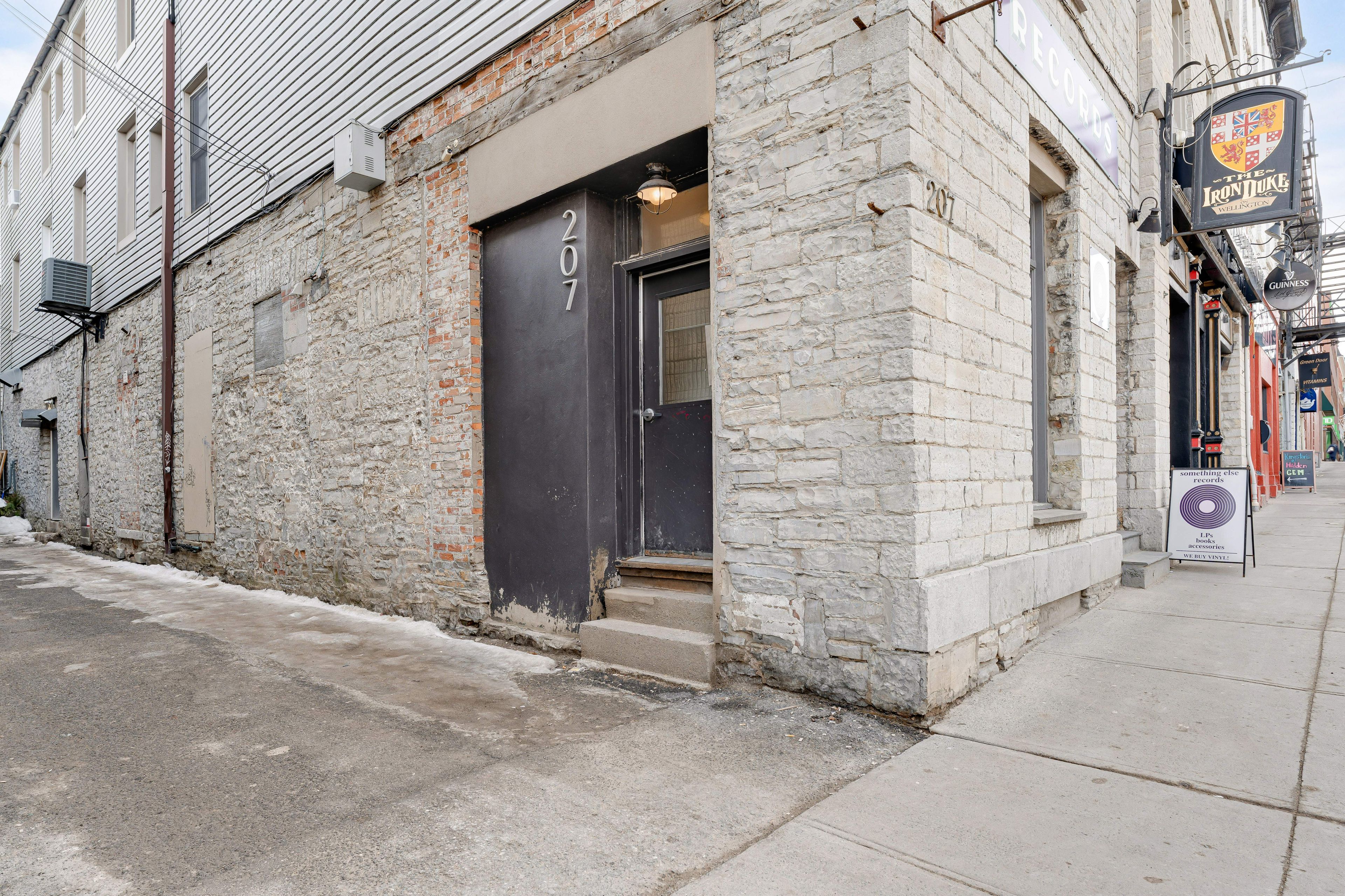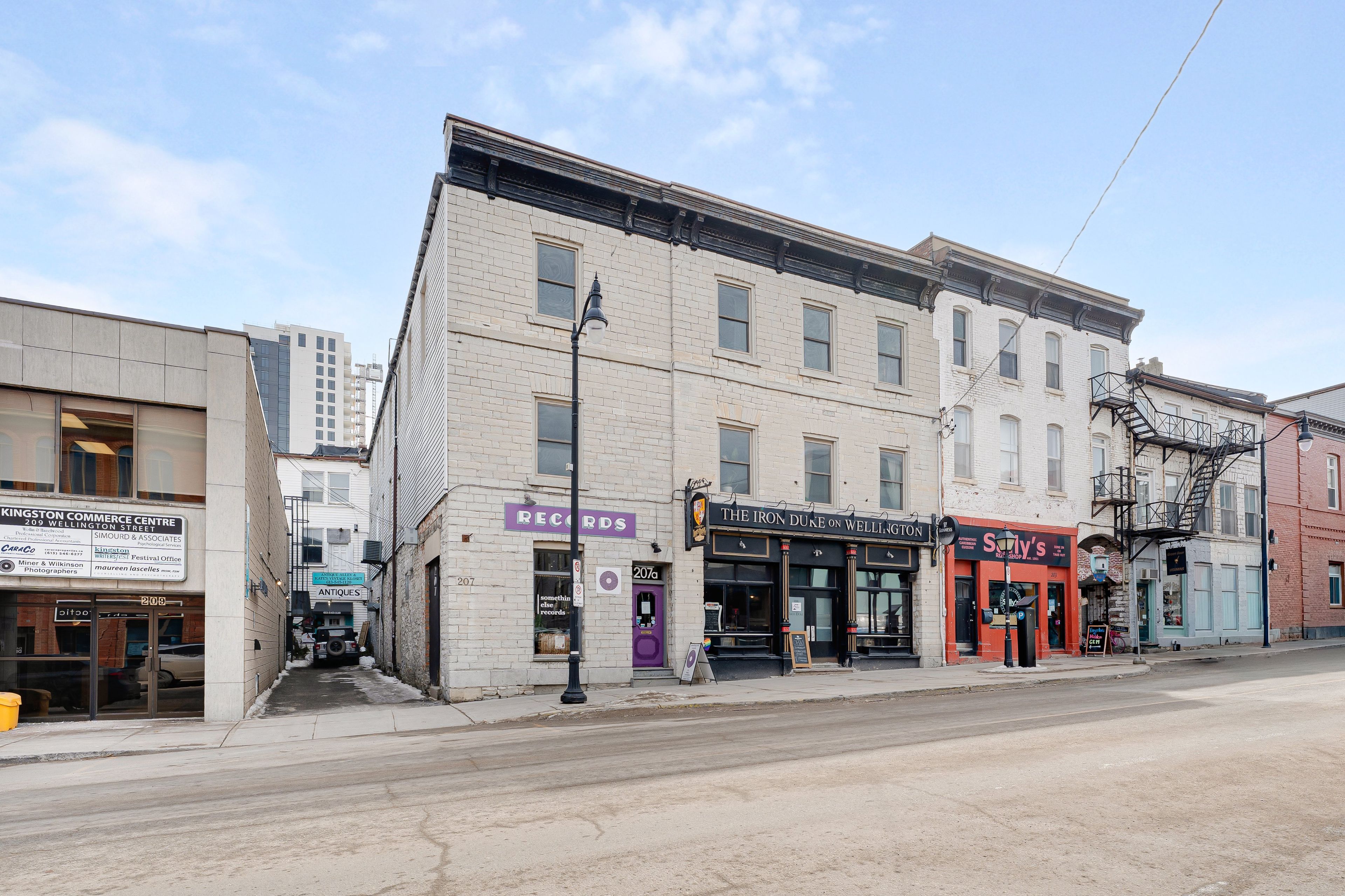 3-storey mixed-use investment property in downtown Kingston. 14 units across 12,723 sf: 2 NNN commercial tenants plus 12 residential suites (15 bedrooms). Tenants pay own utilities. Ground-floor commercial comprises a pub/restaurant (approx. 2,600 sf) and a retail unit (approx. 1,147 sf), with TMI recoveries. The building presents exceptionally well with thoughtful upgrades throughout. High-ceiling residential suites feature hardwood floors, updated kitchens with stone countertops and stainless steel appliances, oversized heritage-scale windows, and exposed beam details in select units. Dedicated residential entrance with smart video intercom, on-site laundry, and renovated common corridors. Select upper-floor suites offer waterfront views. Zoned DT1. Steps to Market Square, Slush Puppie Place, City Hall, Queen's University, and Kingston's renowned waterfront. Heritage-designated limestone building, c.1885. Financial details provided under NDA to qualified parties. Additional information www.207wellington.com