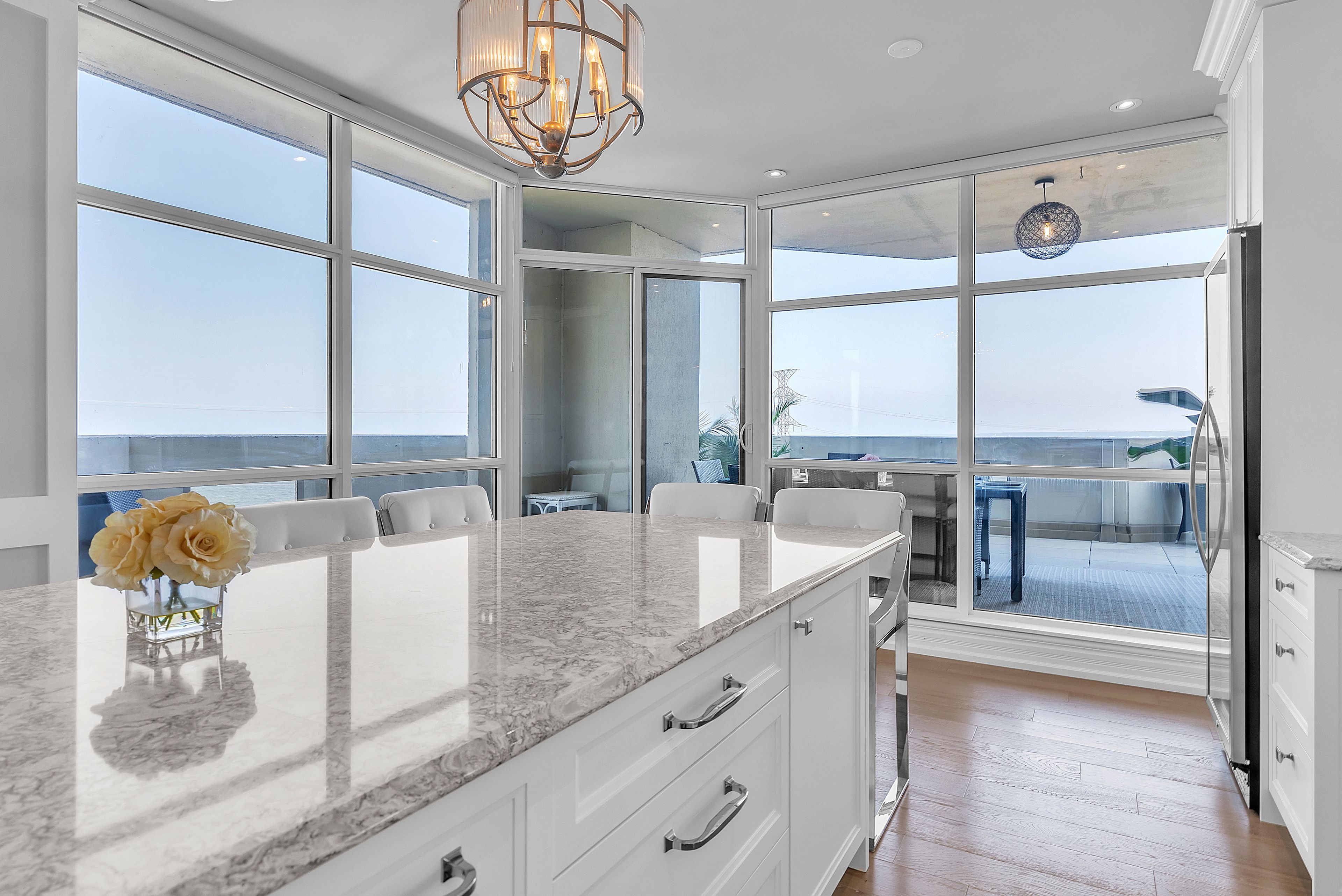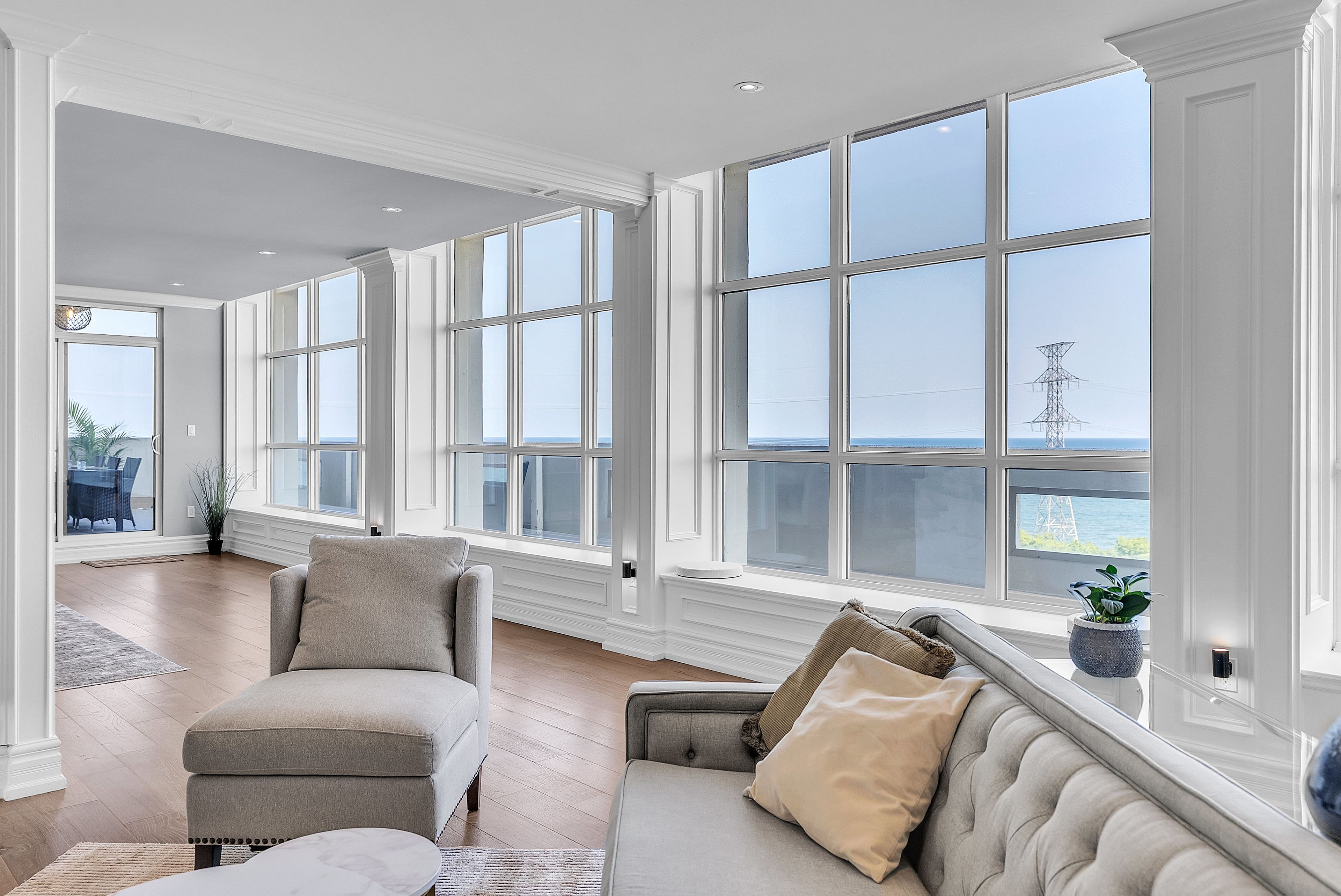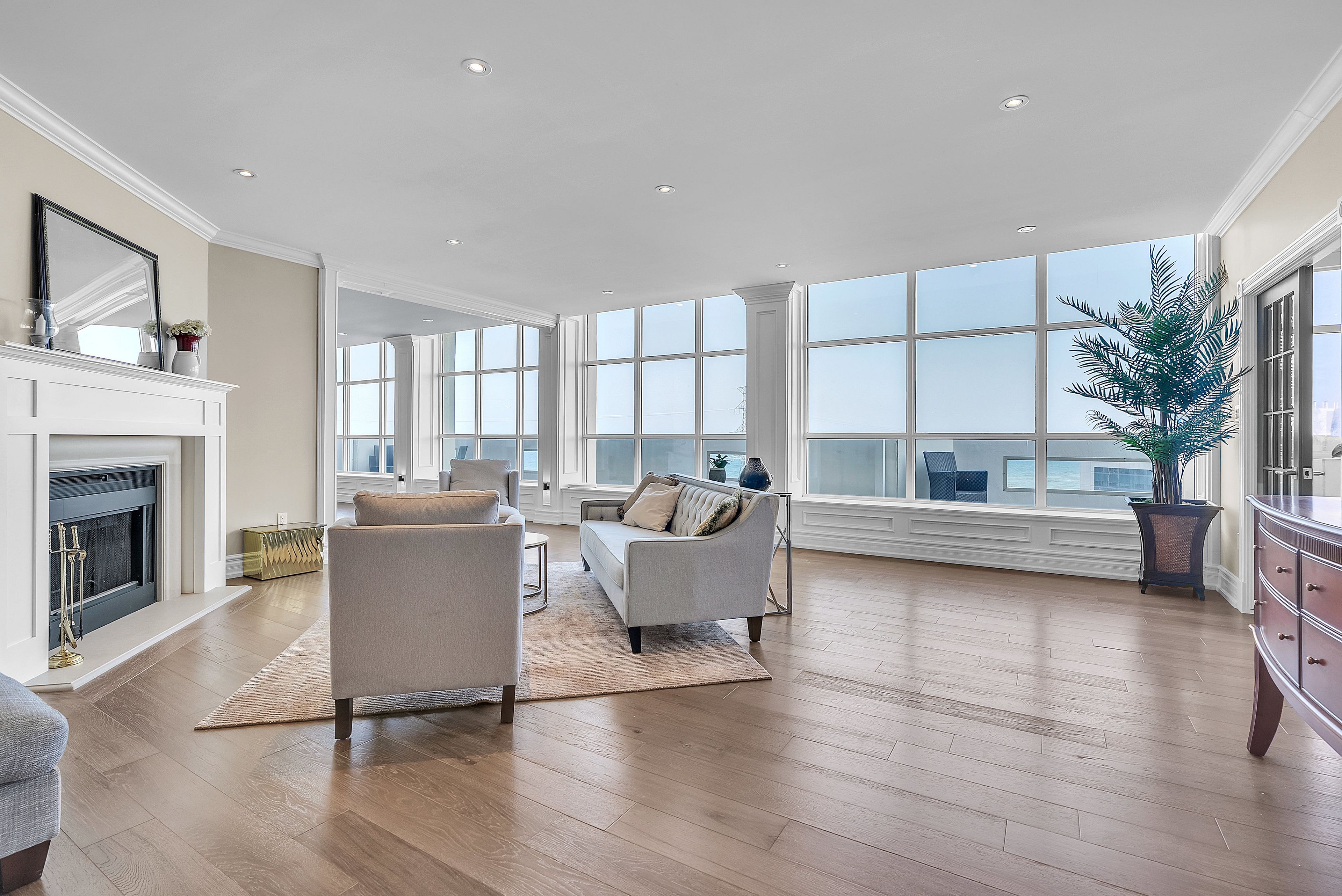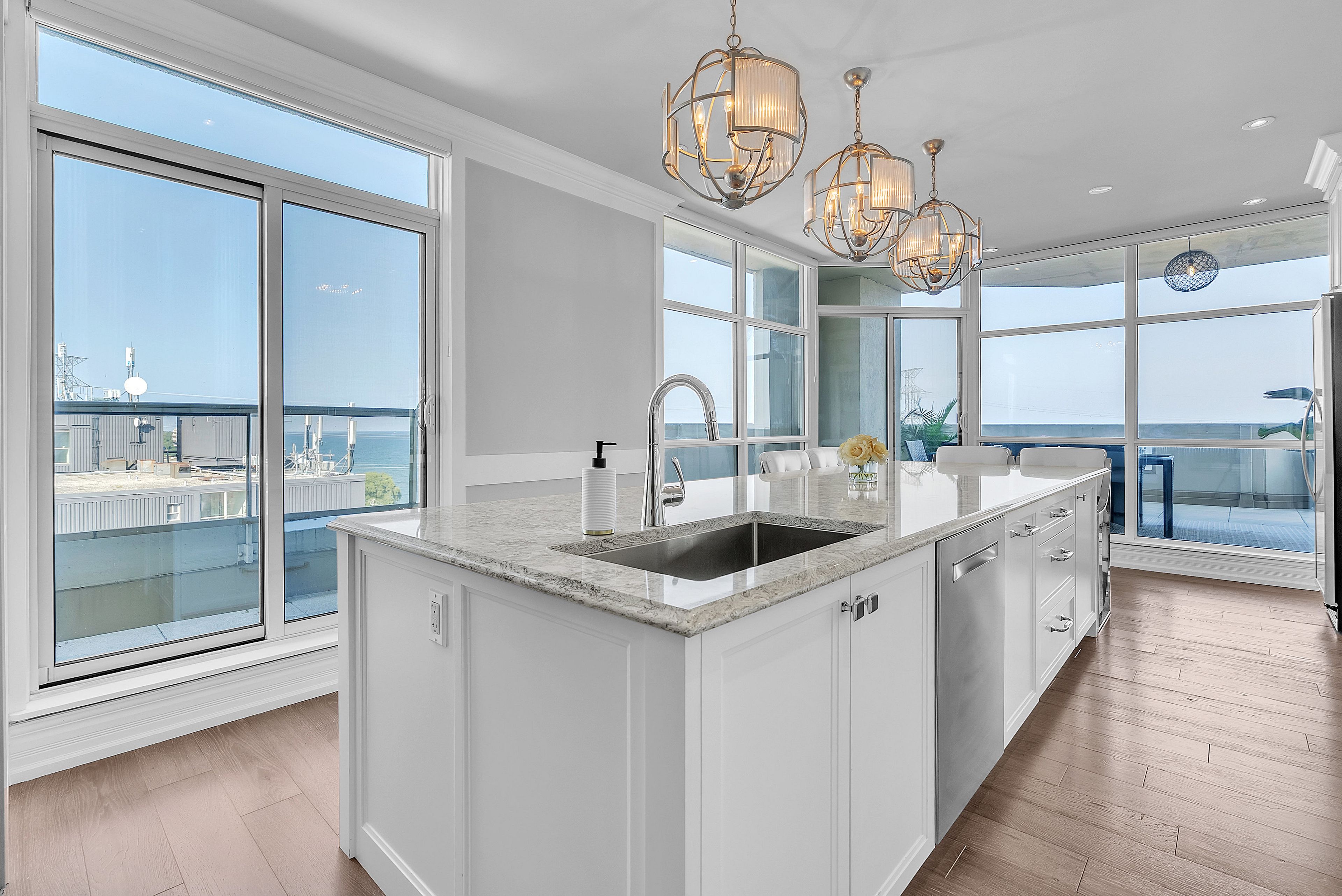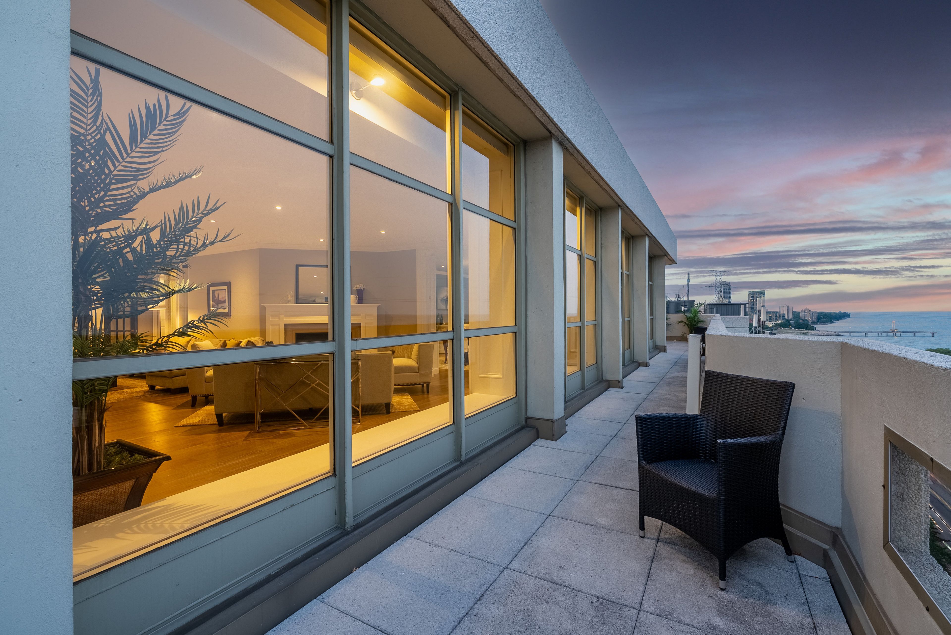 This extraordinary penthouse is the only residence on the top floor of this fabulous tower, offering unmatched privacy and exclusivity. With more than 4,000 sq ft of refined single-level living and nearly 1300 sq ft wraparound terrace, it captures breathtaking views of Lake Ontario, the Burlington skyline, and the Skyway Bridge. Through the grand unit door, the impressive entry foyer sets the tone with its skylight, custom millwork, and generous closets. Beyond, the home unfolds with soaring ceilings, engineered hardwood floors, and luminous natural light streaming through walls of spectacular windows and multiple skylights. Expansive principal rooms flow seamlessly, ideal for both grand entertaining and intimate everyday living. The open-concept living and dining areas are complemented by a fireplace and sophisticated wet bar, and offer easy access to the terrace for effortless indoor-outdoor living. The gourmet kitchen blends style and function, featuring stone counters, a dining island, stainless appliances, and windows on two sides framing captivating lake views. Two sprawling, stately bedrooms each enjoy lavish ensuites, walk-in closets, and their own private terraces. A richly appointed office with custom built-ins and a skylit den with coffered ceiling add elegance and versatility. Practicality is equally considered in this exquisite home with a powder room, ample in-suite storage, a large locker, and three premium underground parking spaces. Monthly condo fees include all utilities except hydro, offering simplicity and peace of mind. The building itself is impeccably maintained, with on-site superintendent, outdoor pool, gym, party room, workshop, underground visitor parking, and a warm wood-panelled lobby. Steps from Spencer Smith Park, the waterfront, hospital, and downtown Burlington's shops and restaurants, this remarkable residence is among the city's most prestigious offerings.
