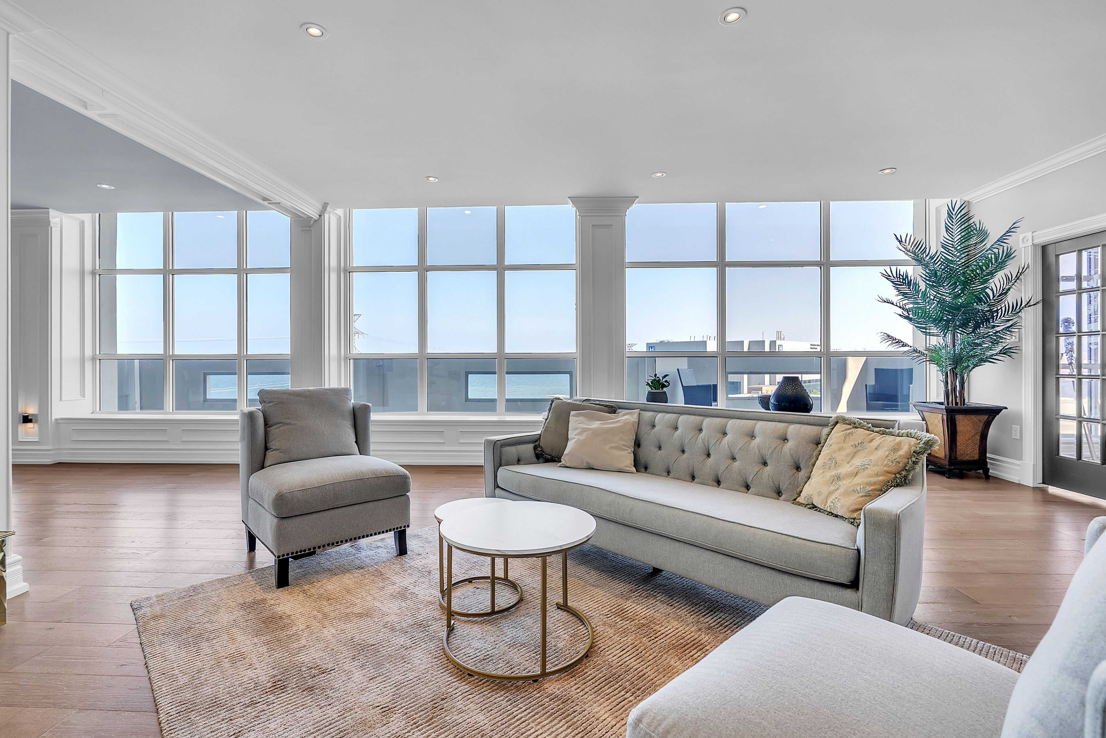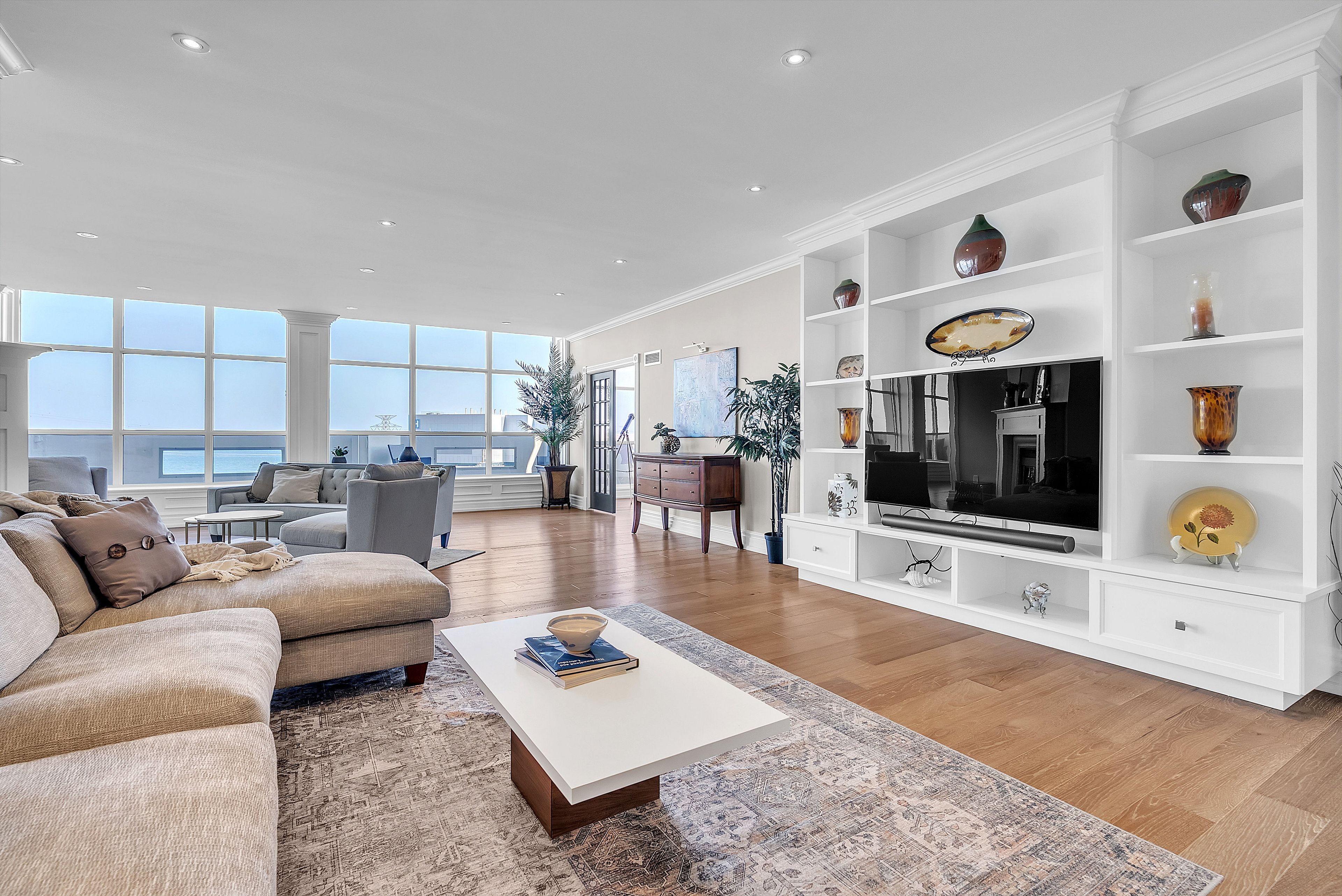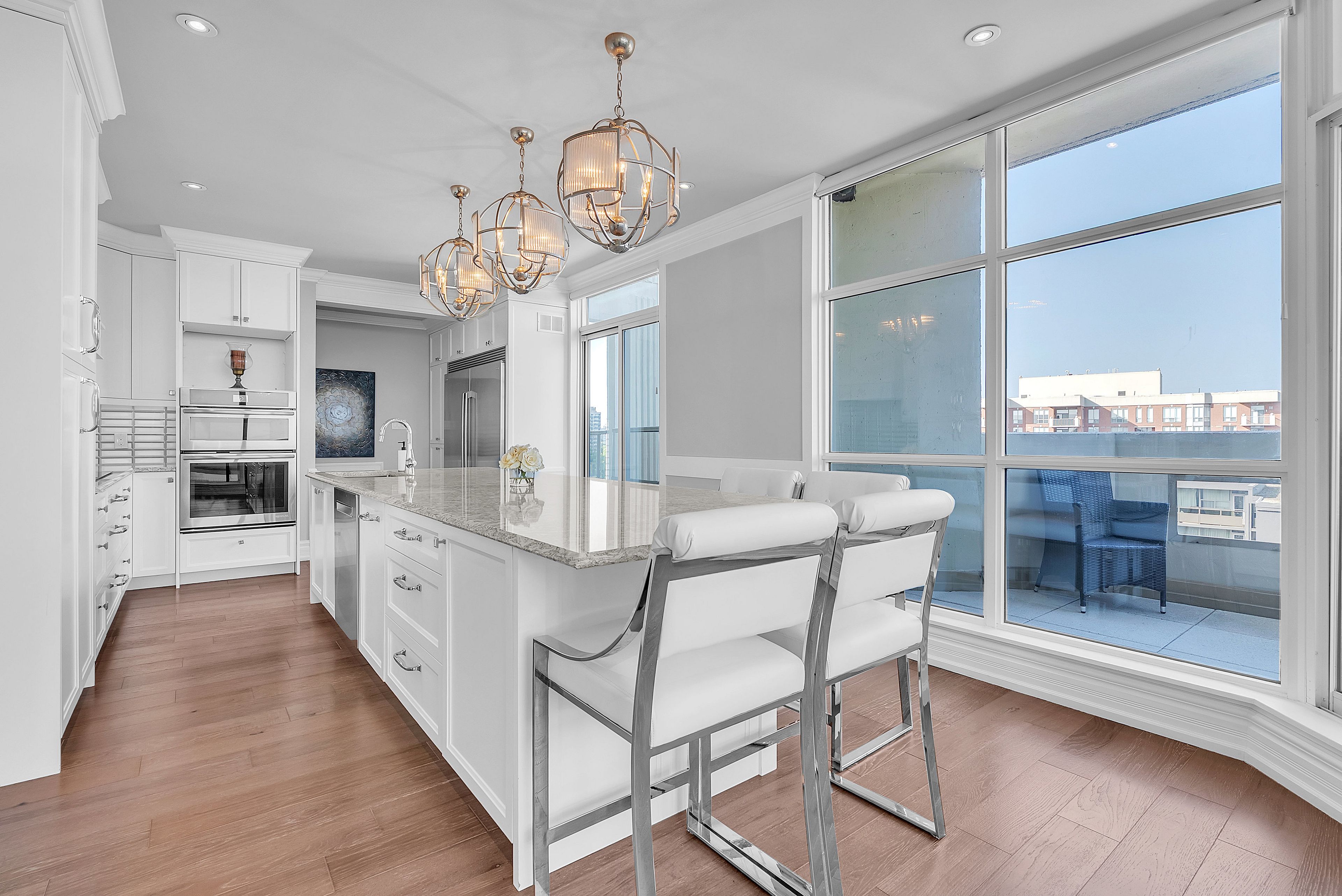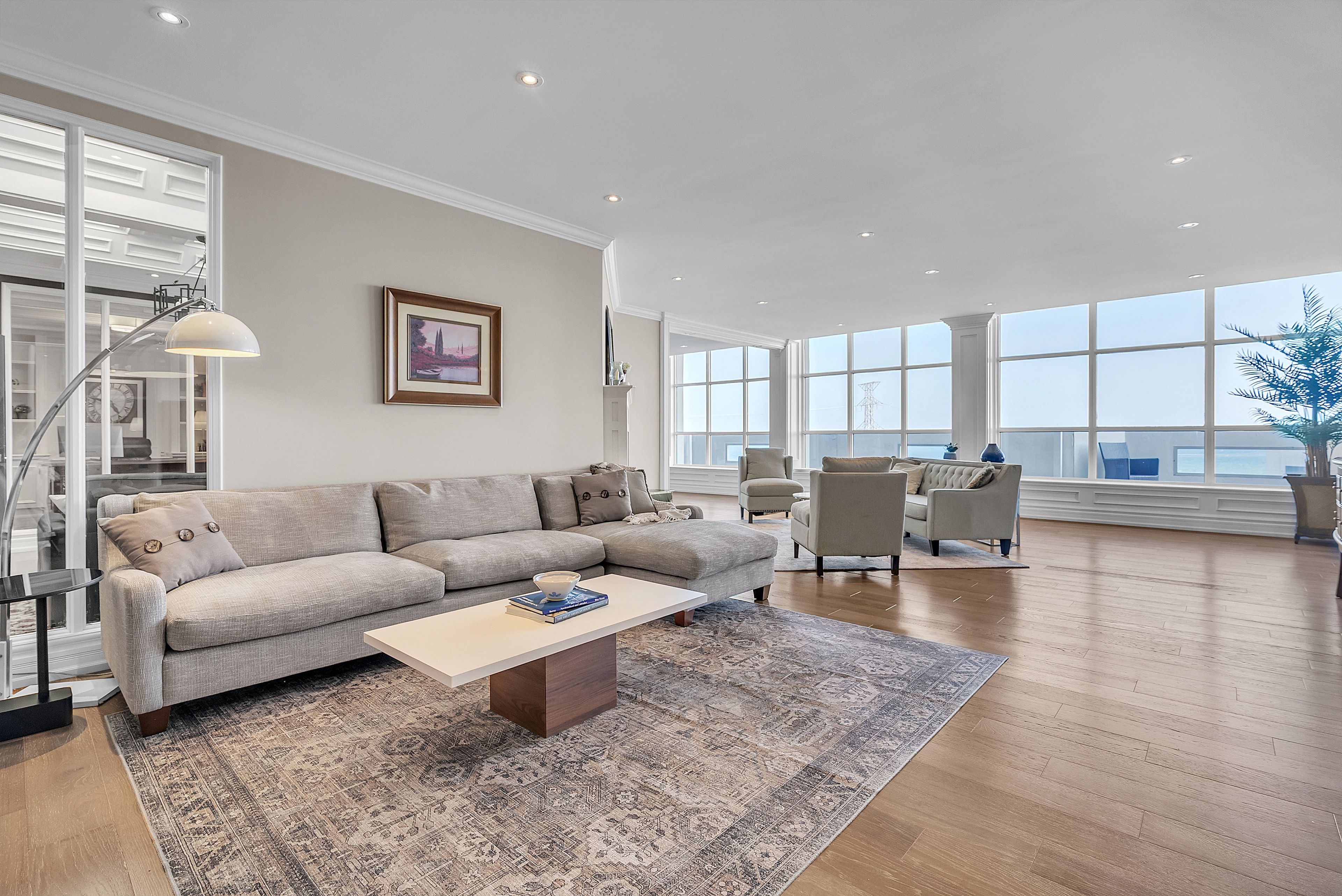 This extraordinary penthouse is the only residence on the top floor of this fabulous tower, offering unmatched privacy and exclusivity. With more than 4,000 sq ft of refined single-level living and nearly 1300 sq ft wraparound terrace, it captures breathtaking views of Lake Ontario, the Burlington skyline, and the Skyway Bridge. Through the grand unit door, the impressive entry foyer sets the tone with its skylight, custom millwork, and generous closets. Beyond, the home unfolds with soaring ceilings, engineered hardwood floors, and luminous natural light streaming through walls of spectacular windows and multiple skylights. Expansive principal rooms flow seamlessly, ideal for both grand entertaining and intimate everyday living. The open-concept living and dining areas are complemented by a fireplace and sophisticated wet bar, and offer easy access to the terrace for effortless indoor-outdoor living. The gourmet kitchen blends style and function, featuring stone counters, a dining island, stainless appliances, and windows on two sides framing captivating lake views. Two sprawling, stately bedrooms each enjoy lavish ensuites, walk-in closets, and their own private terraces. A richly appointed office with custom built-ins and a skylit den with coffered ceiling add elegance and versatility. Practicality is equally considered in this exquisite home with a powder room, ample in-suite storage, a large locker, and three premium underground parking spaces. Monthly condo fees include all utilities except hydro, offering simplicity and peace of mind. The building itself is impeccably maintained, with on-site superintendent, outdoor pool, gym, party room, workshop, underground visitor parking, and a warm wood-panelled lobby. Steps from Spencer Smith Park, the waterfront, hospital, and downtown Burlington's shops and restaurants, this remarkable residence is among the city's most prestigious offerings.