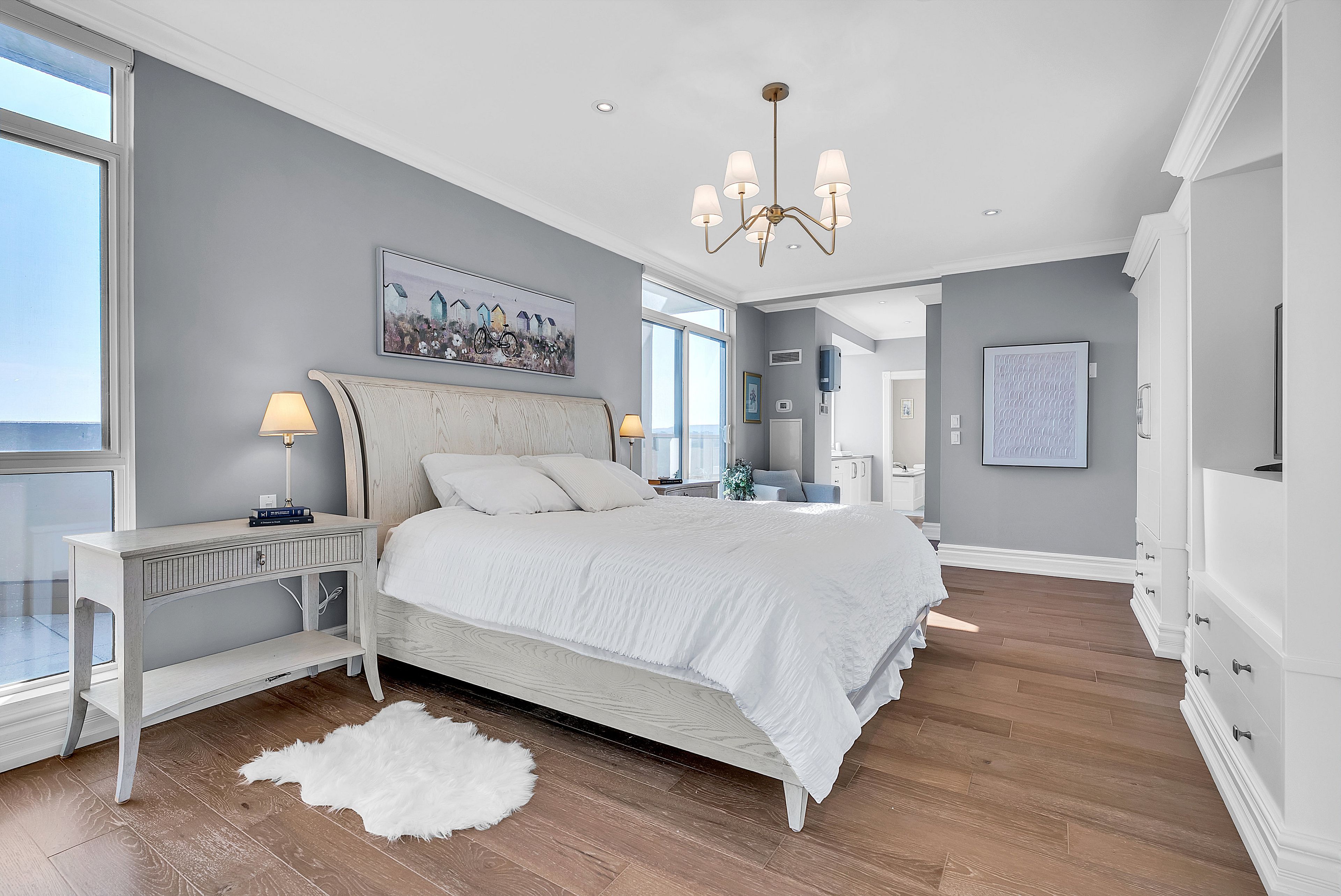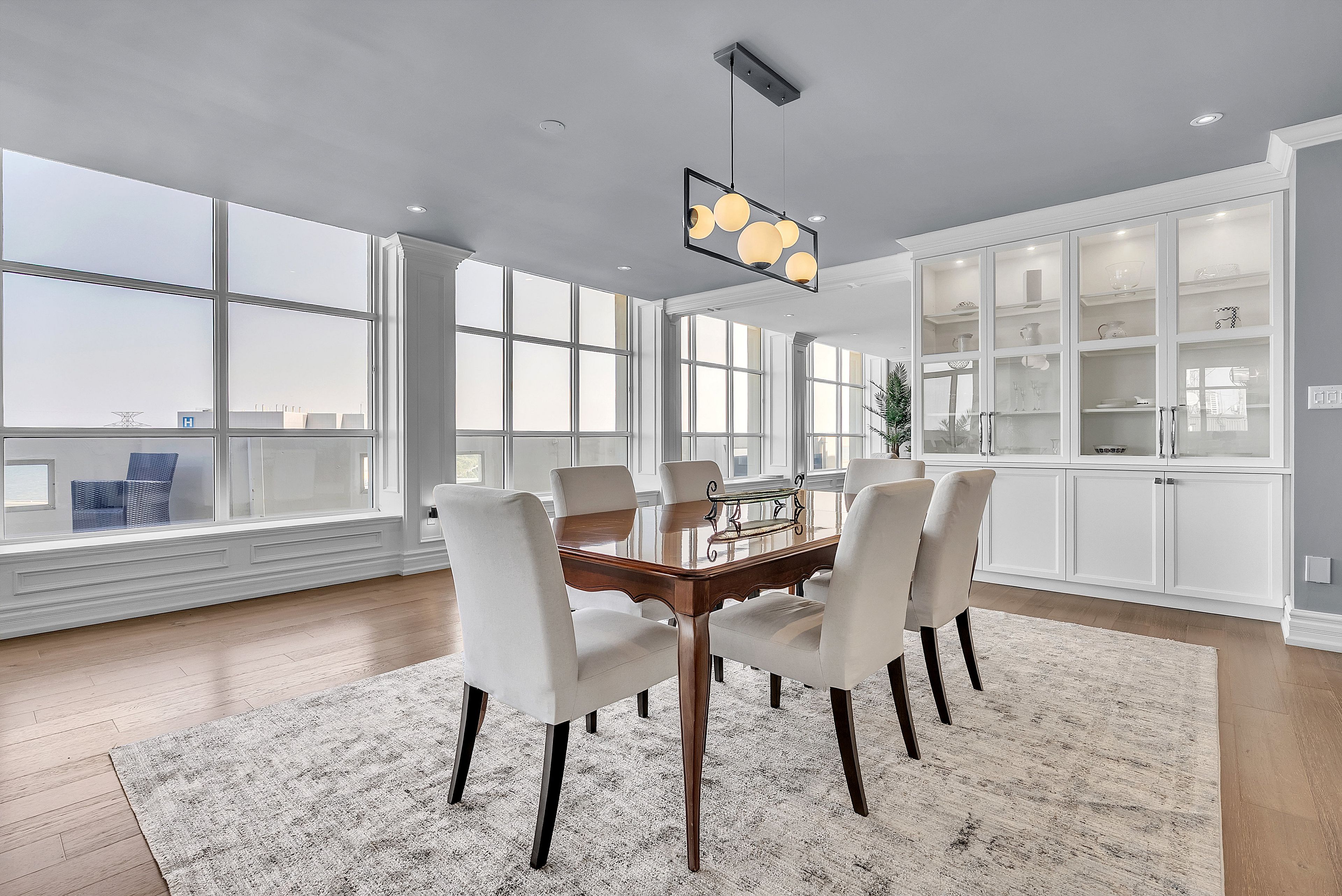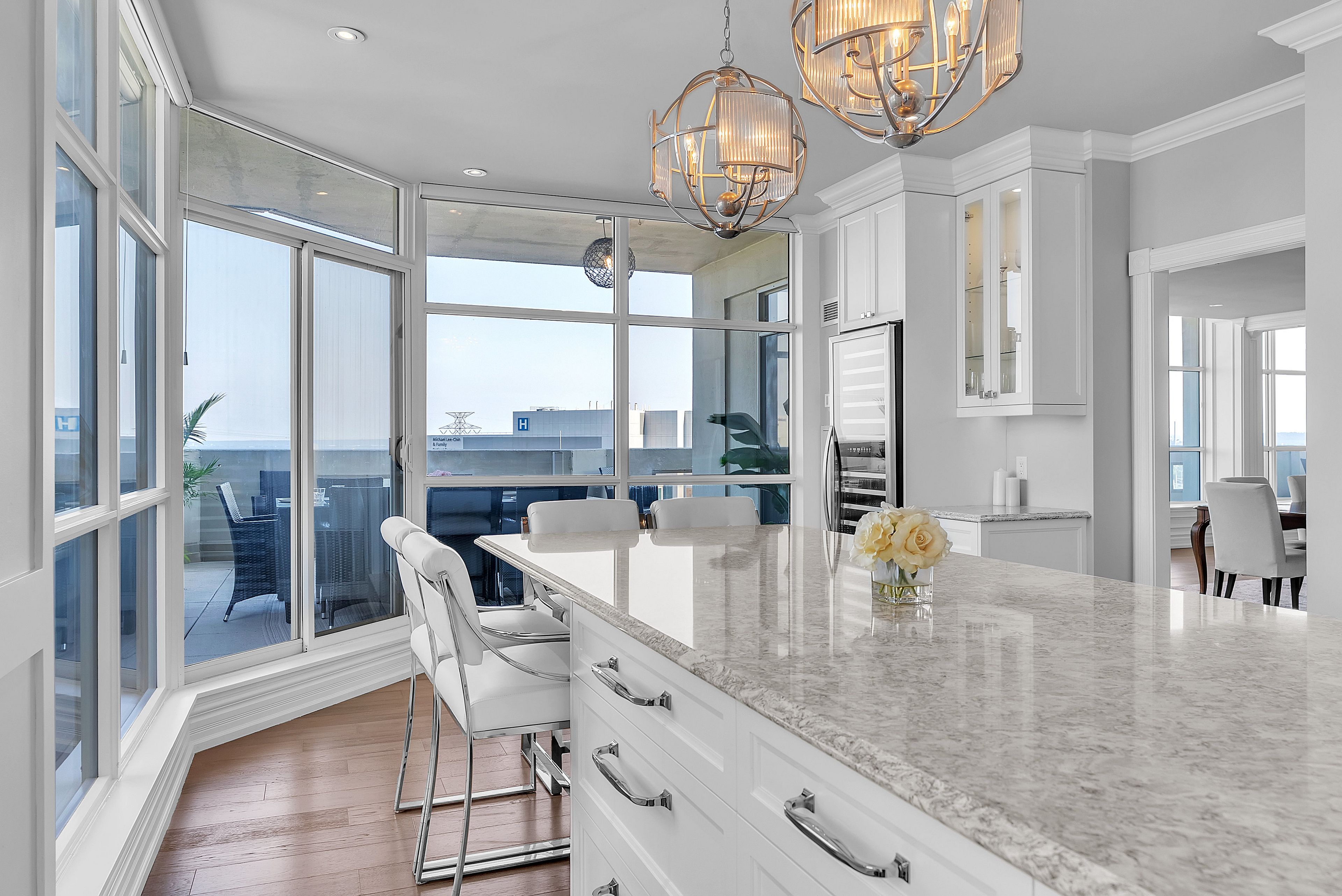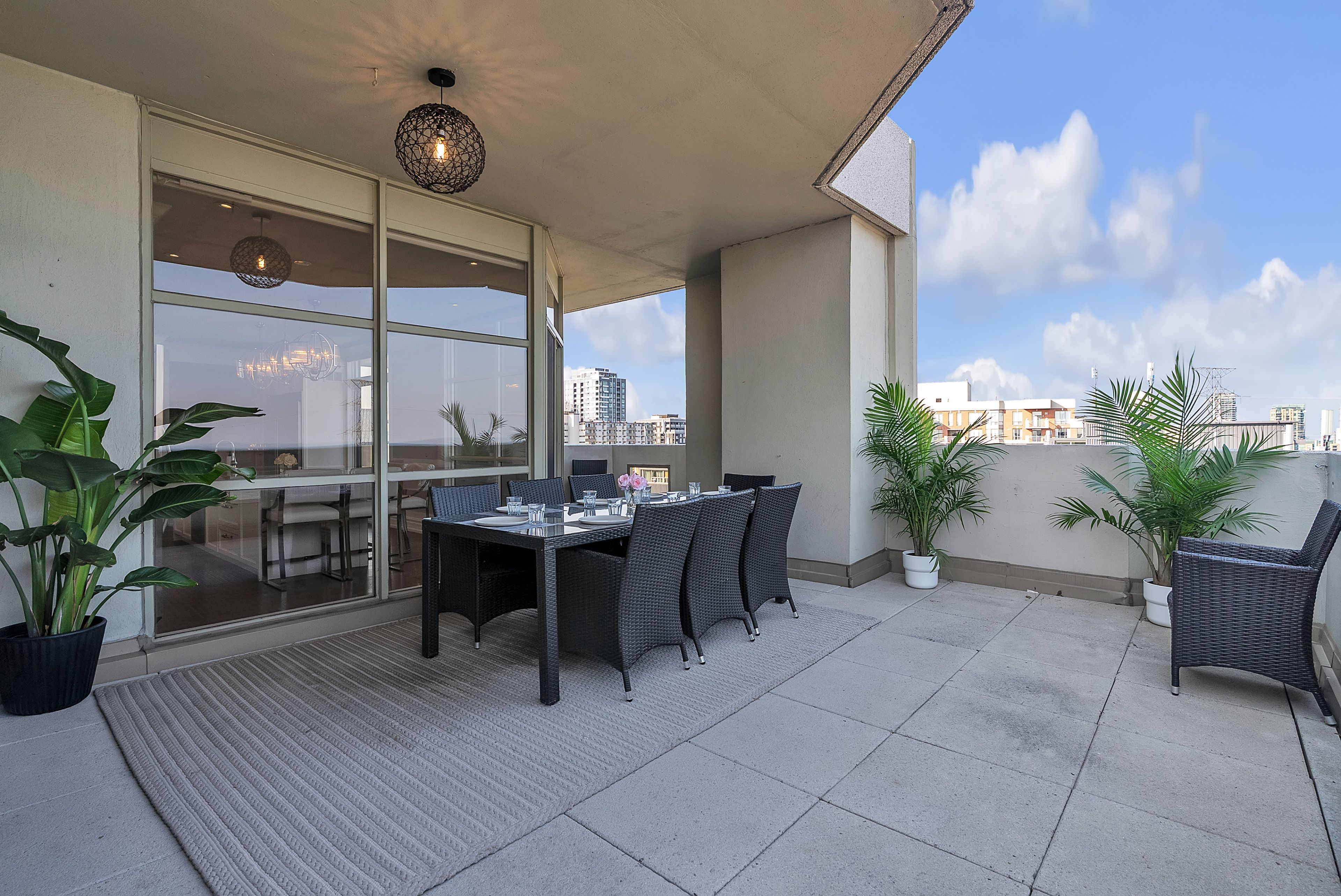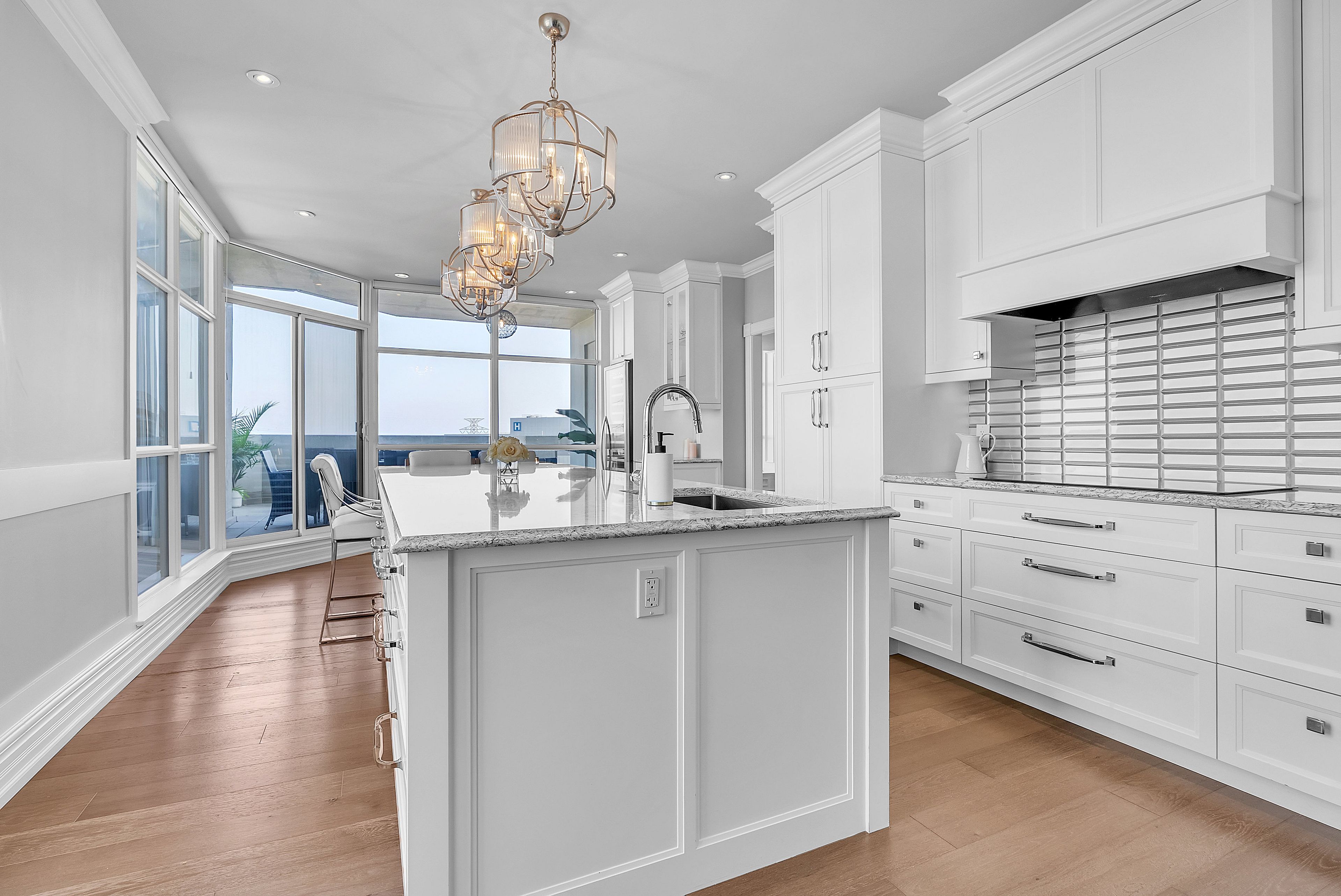 This extraordinary penthouse is the only residence on the top floor of this fabulous tower, offering unmatched privacy and exclusivity. With more than 4,000 sq ft of refined single-level living and nearly 1300 sq ft wraparound terrace, it captures breathtaking views of Lake Ontario, the Burlington skyline, and the Skyway Bridge. Through the grand unit door, the impressive entry foyer sets the tone with its skylight, custom millwork, and generous closets. Beyond, the home unfolds with soaring ceilings, engineered hardwood floors, and luminous natural light streaming through walls of spectacular windows and multiple skylights. Expansive principal rooms flow seamlessly, ideal for both grand entertaining and intimate everyday living. The open-concept living and dining areas are complemented by a fireplace and sophisticated wet bar, and offer easy access to the terrace for effortless indoor-outdoor living. The gourmet kitchen blends style and function, featuring stone counters, a dining island, stainless appliances, and windows on two sides framing captivating lake views. Two sprawling, stately bedrooms each enjoy lavish ensuites, walk-in closets, and their own private terraces. A richly appointed office with custom built-ins and a skylit den with coffered ceiling add elegance and versatility. Practicality is equally considered in this exquisite home with a powder room, ample in-suite storage, a large locker, and three premium underground parking spaces. Monthly condo fees include all utilities except hydro, offering simplicity and peace of mind. The building itself is impeccably maintained, with on-site superintendent, outdoor pool, gym, party room, workshop, underground visitor parking, and a warm wood-panelled lobby. Steps from Spencer Smith Park, the waterfront, hospital, and downtown Burlington's shops and restaurants, this remarkable residence is among the city's most prestigious offerings.