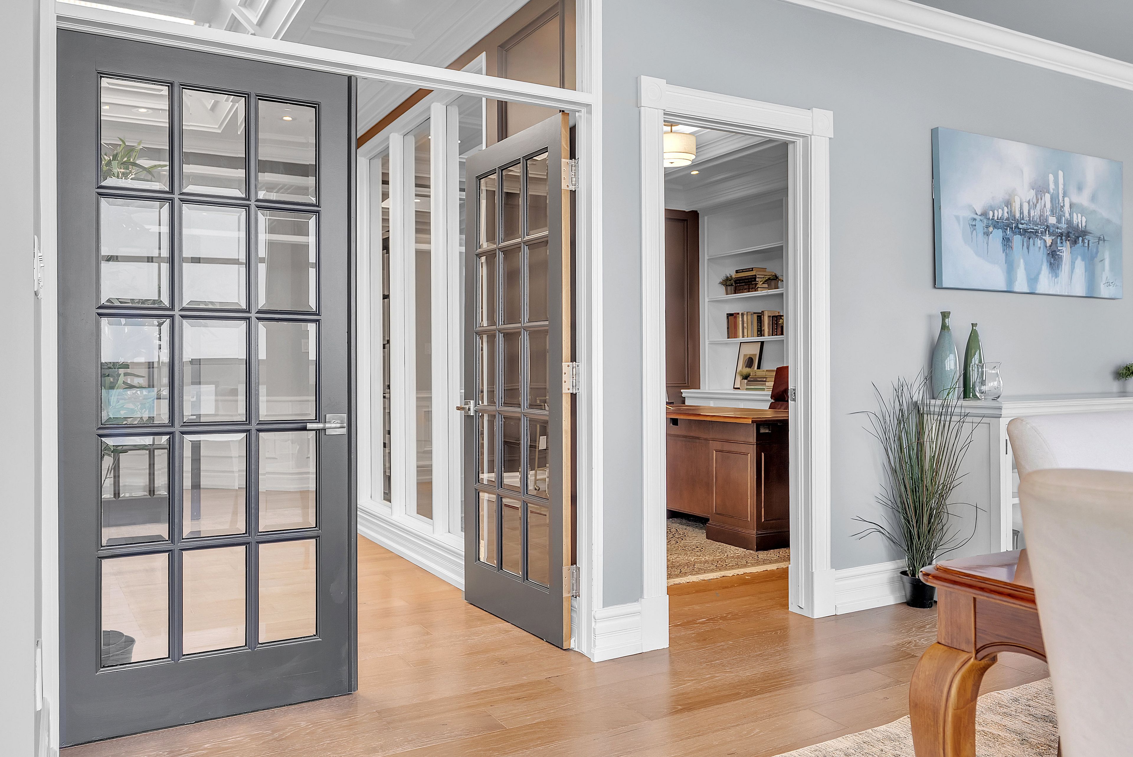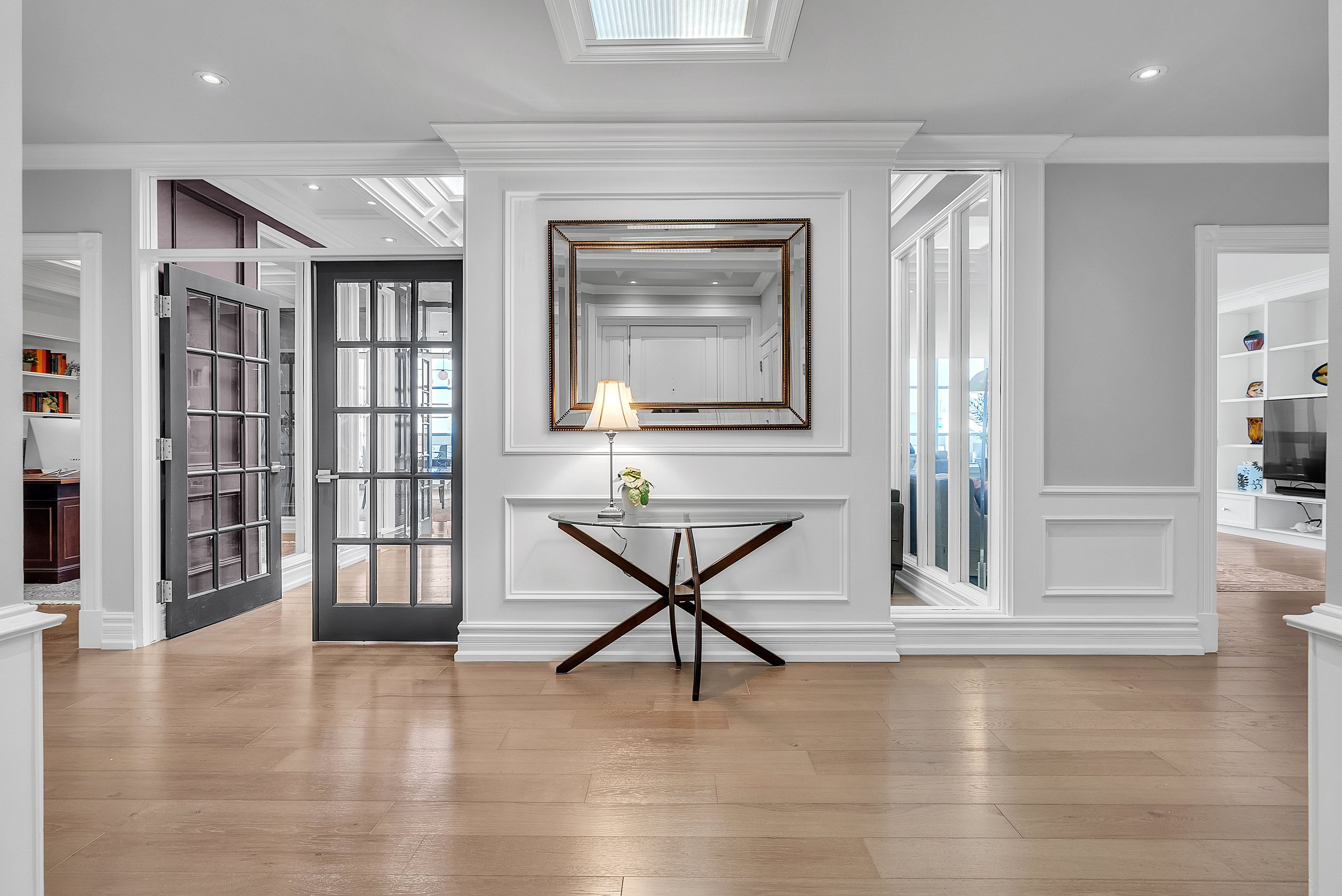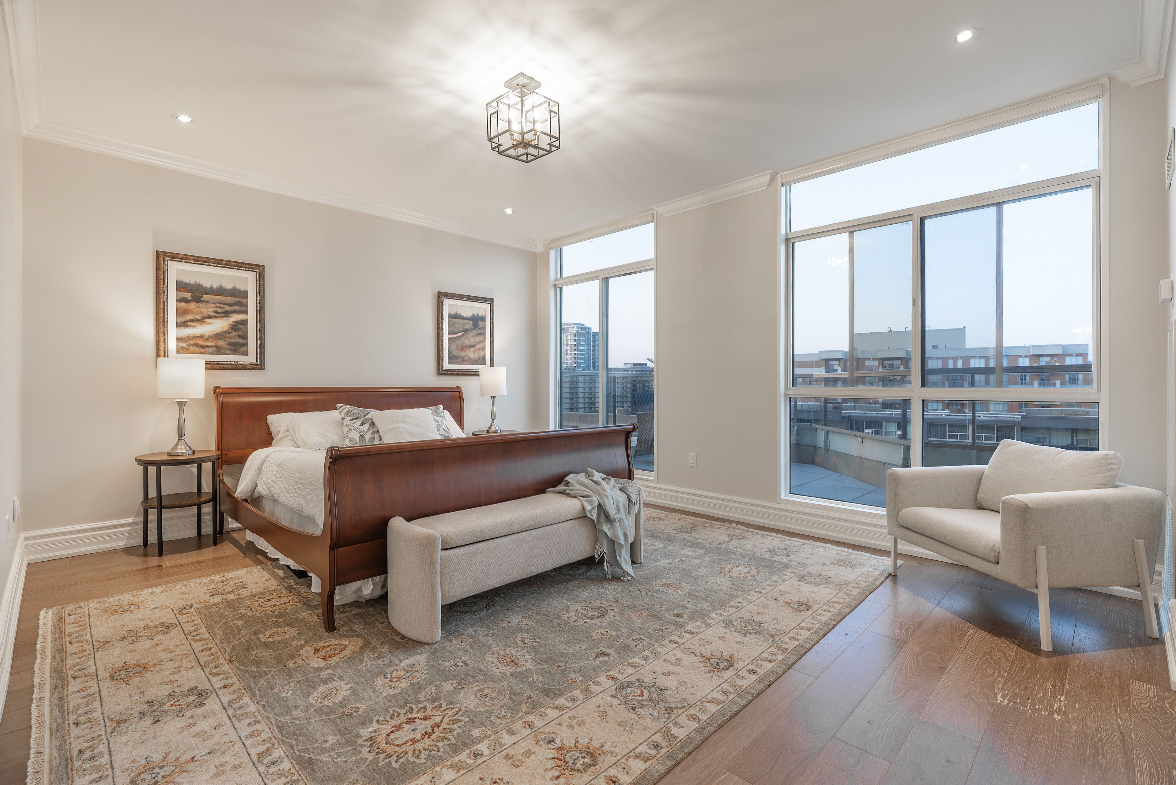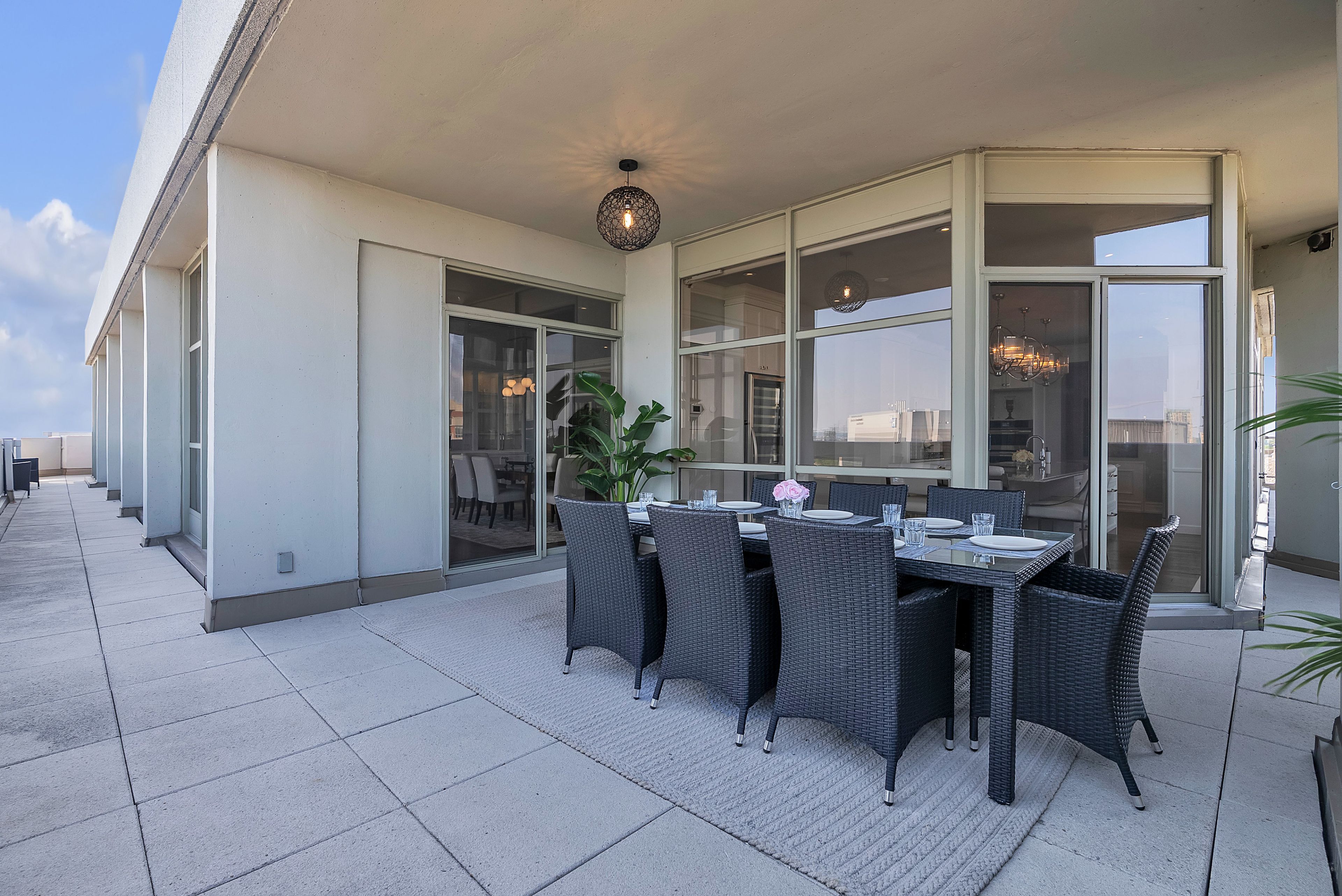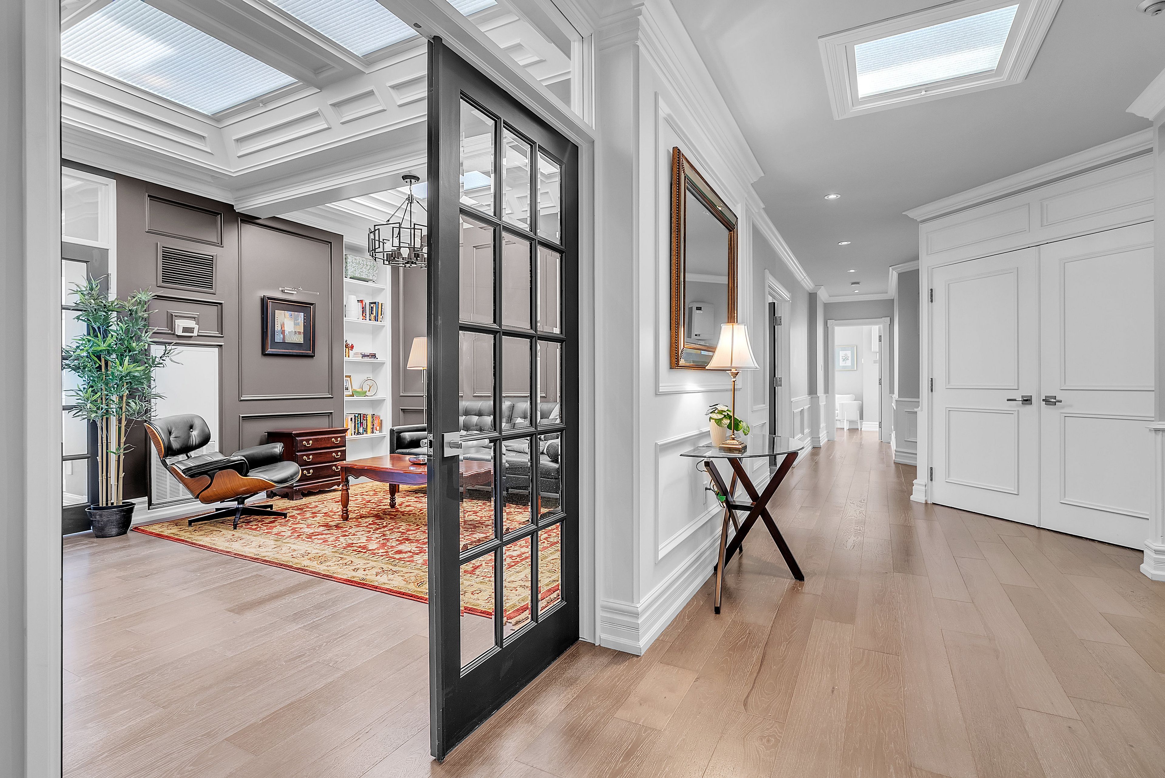 This extraordinary penthouse is the only residence on the top floor of this fabulous tower, offering unmatched privacy and exclusivity. With more than 4,000 sq ft of refined single-level living and nearly 1300 sq ft wraparound terrace, it captures breathtaking views of Lake Ontario, the Burlington skyline, and the Skyway Bridge. Through the grand unit door, the impressive entry foyer sets the tone with its skylight, custom millwork, and generous closets. Beyond, the home unfolds with soaring ceilings, engineered hardwood floors, and luminous natural light streaming through walls of spectacular windows and multiple skylights. Expansive principal rooms flow seamlessly, ideal for both grand entertaining and intimate everyday living. The open-concept living and dining areas are complemented by a fireplace and sophisticated wet bar, and offer easy access to the terrace for effortless indoor-outdoor living. The gourmet kitchen blends style and function, featuring stone counters, a dining island, stainless appliances, and windows on two sides framing captivating lake views. Two sprawling, stately bedrooms each enjoy lavish ensuites, walk-in closets, and their own private terraces. A richly appointed office with custom built-ins and a skylit den with coffered ceiling add elegance and versatility. Practicality is equally considered in this exquisite home with a powder room, ample in-suite storage, a large locker, and three premium underground parking spaces. Monthly condo fees include all utilities except hydro, offering simplicity and peace of mind. The building itself is impeccably maintained, with on-site superintendent, outdoor pool, gym, party room, workshop, underground visitor parking, and a warm wood-panelled lobby. Steps from Spencer Smith Park, the waterfront, hospital, and downtown Burlington's shops and restaurants, this remarkable residence is among the city's most prestigious offerings.