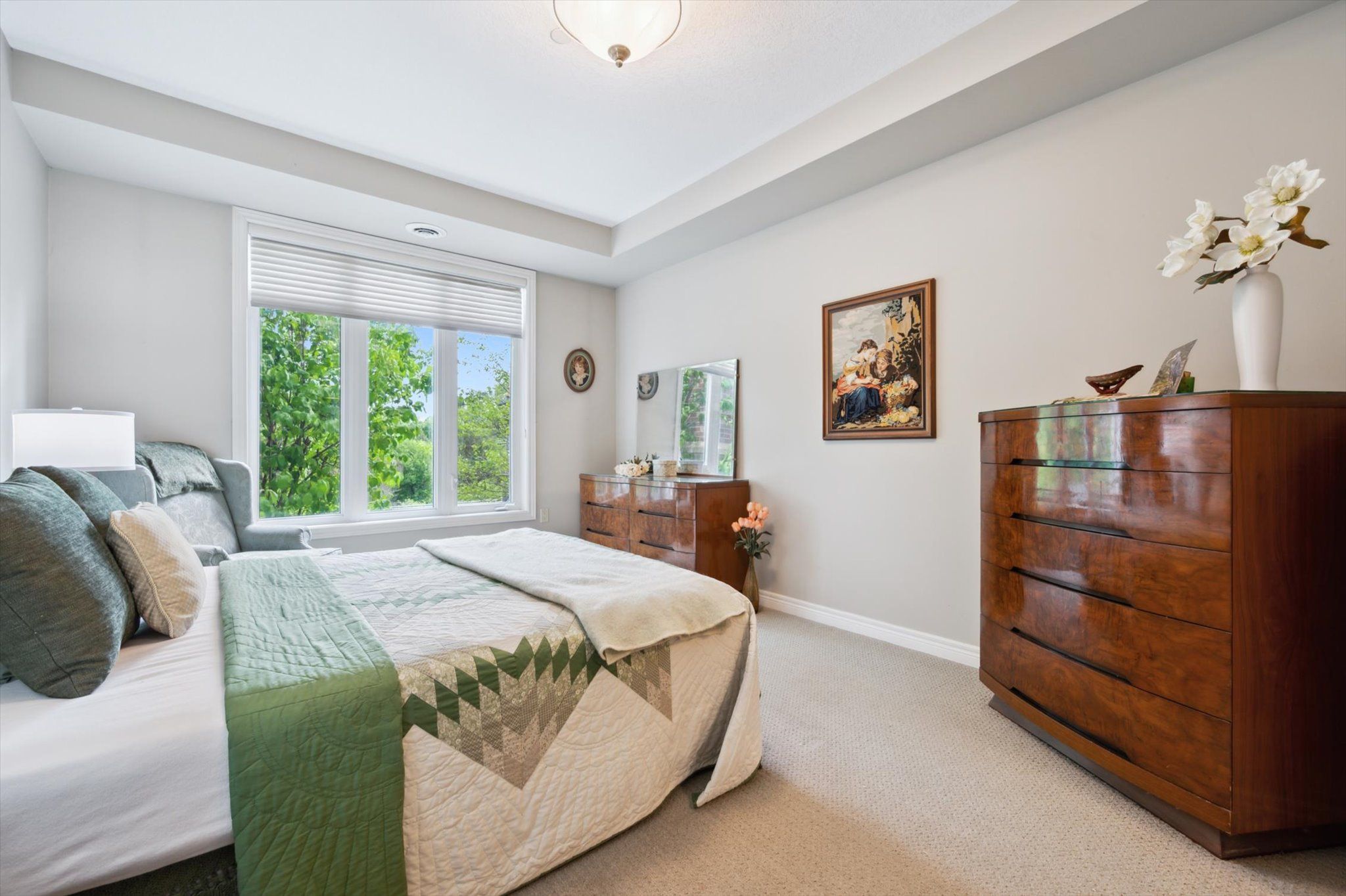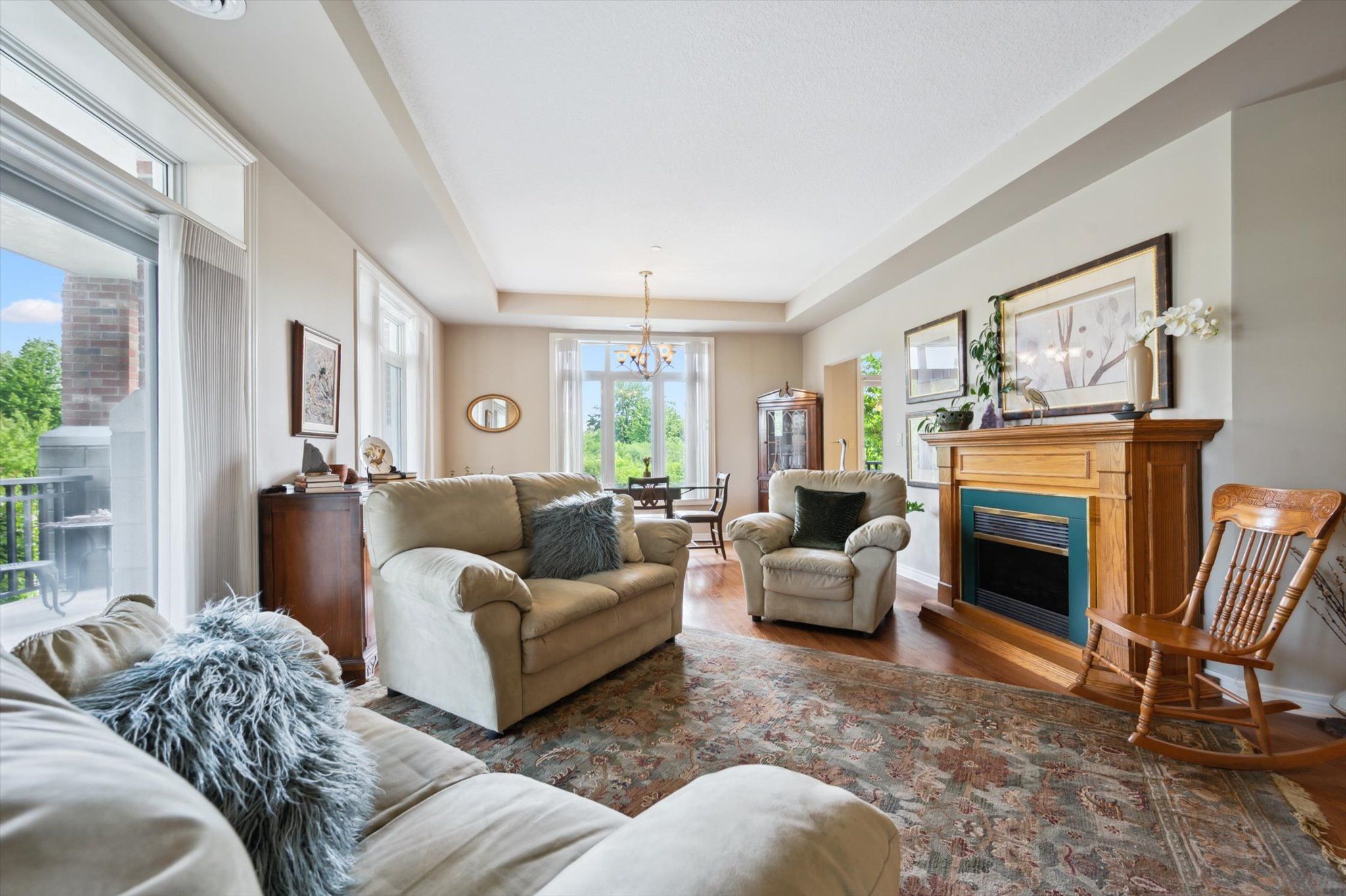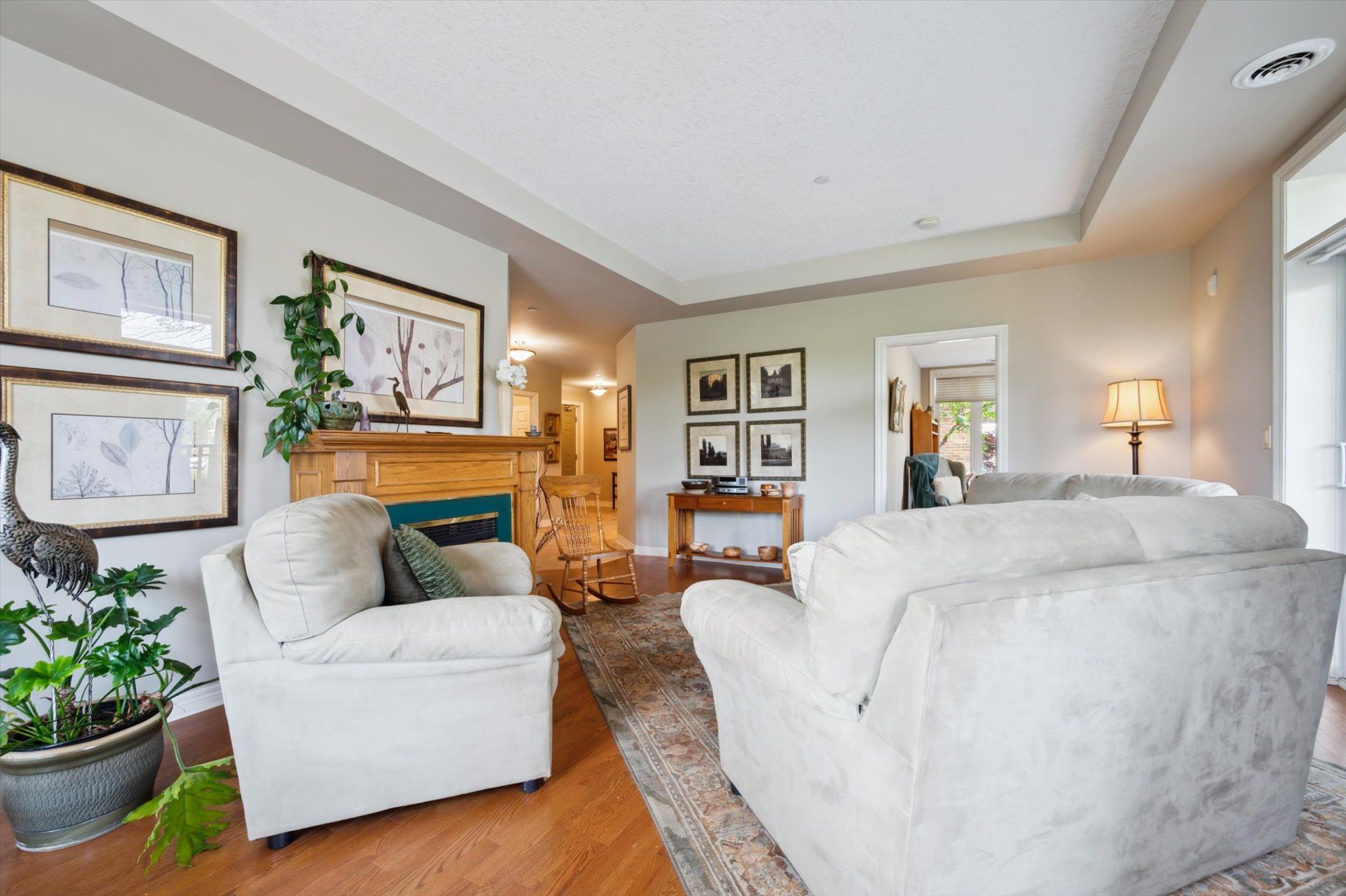 Great opportunity to enjoy retirement living at The Village By The Arboretum in Guelph, Premier 55+ Adult Lifestyle Community. This bright corner unit is on the ground floor with 2 private balconies surrounded by trees with windows on three sides. For the environmentally conscious, you will appreciate the natural controls for cooling in the summer and protection in the winter. For easy access, the underground parking location is right beside the elevator, ride up and Unit 112, is steps away on the first floor. Inside, this unit of 1492 sq ft, features an open concept design, living and dining area surrounded by bright windows and patio doors opening onto one of the balconies. The second balcony faces east. Open this set of patio doors and enjoy your morning coffee from the breakfast area as the sun rises. The primary bedroom offers a ensuite 4 piece bath and a large walk in closet, with window views to the east. The second bedroom can be used as a TV room so you can watch the setting sun from the large bright windows. You'll also find a separate den with two entrances, in-suite laundry, and ample closet space throughout. Additionally, there is a conveniently located large exclusive locker for more storage. As a resident of The Village, you'll have full access to the 28,000+ sq ft Village Centre, a welcoming centre to meet your neighbours with many activities available; an indoor pool, sauna, hot tub, fitness rooms, tennis & pickleball courts, billiards, library, and over 100 resident-led clubs and classes. Besides planning for the future, living in this very special ground floor condo, being surrounded by trees and songbirds outside your door, creates a new lifestyle with new memories.
