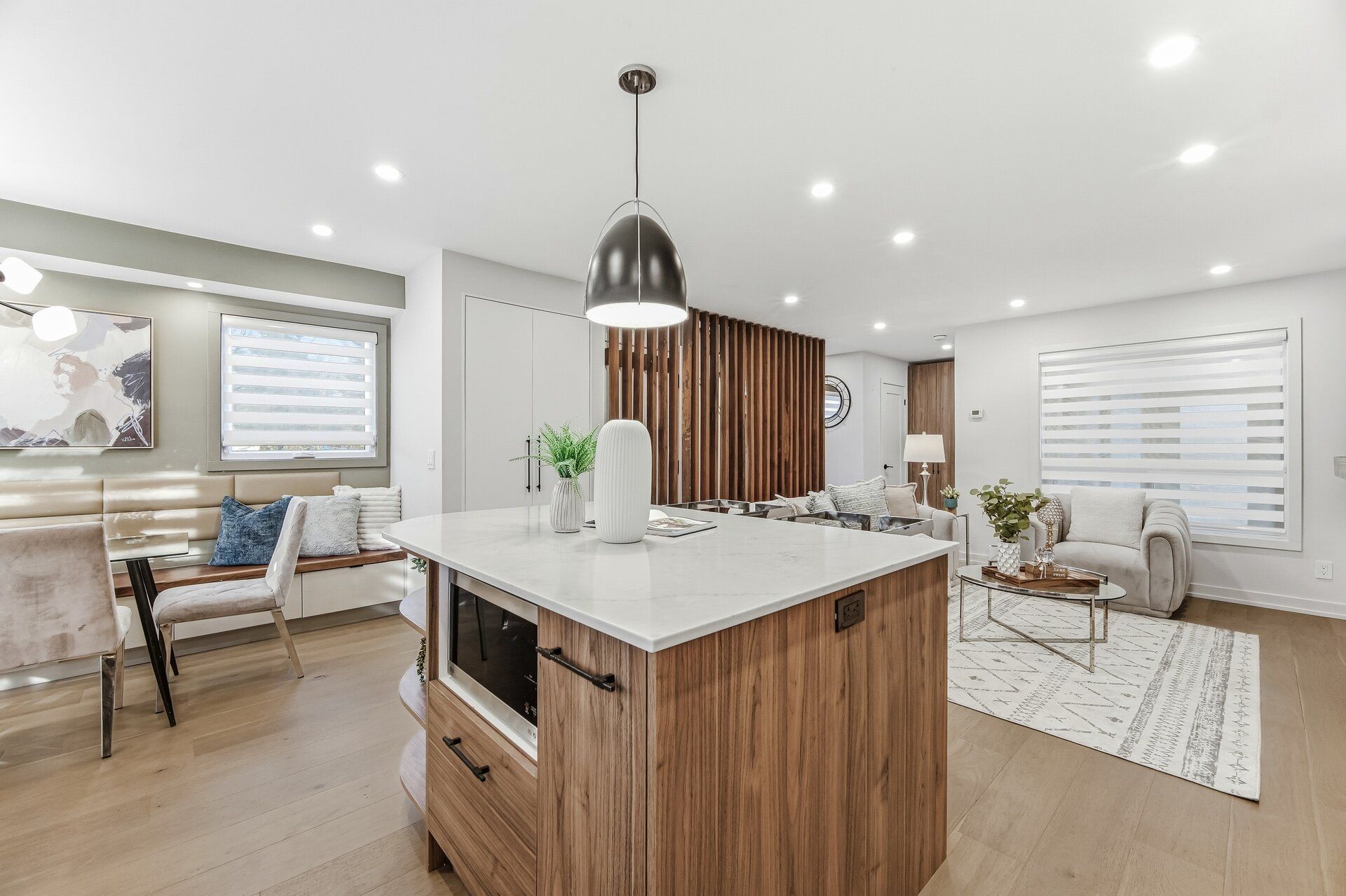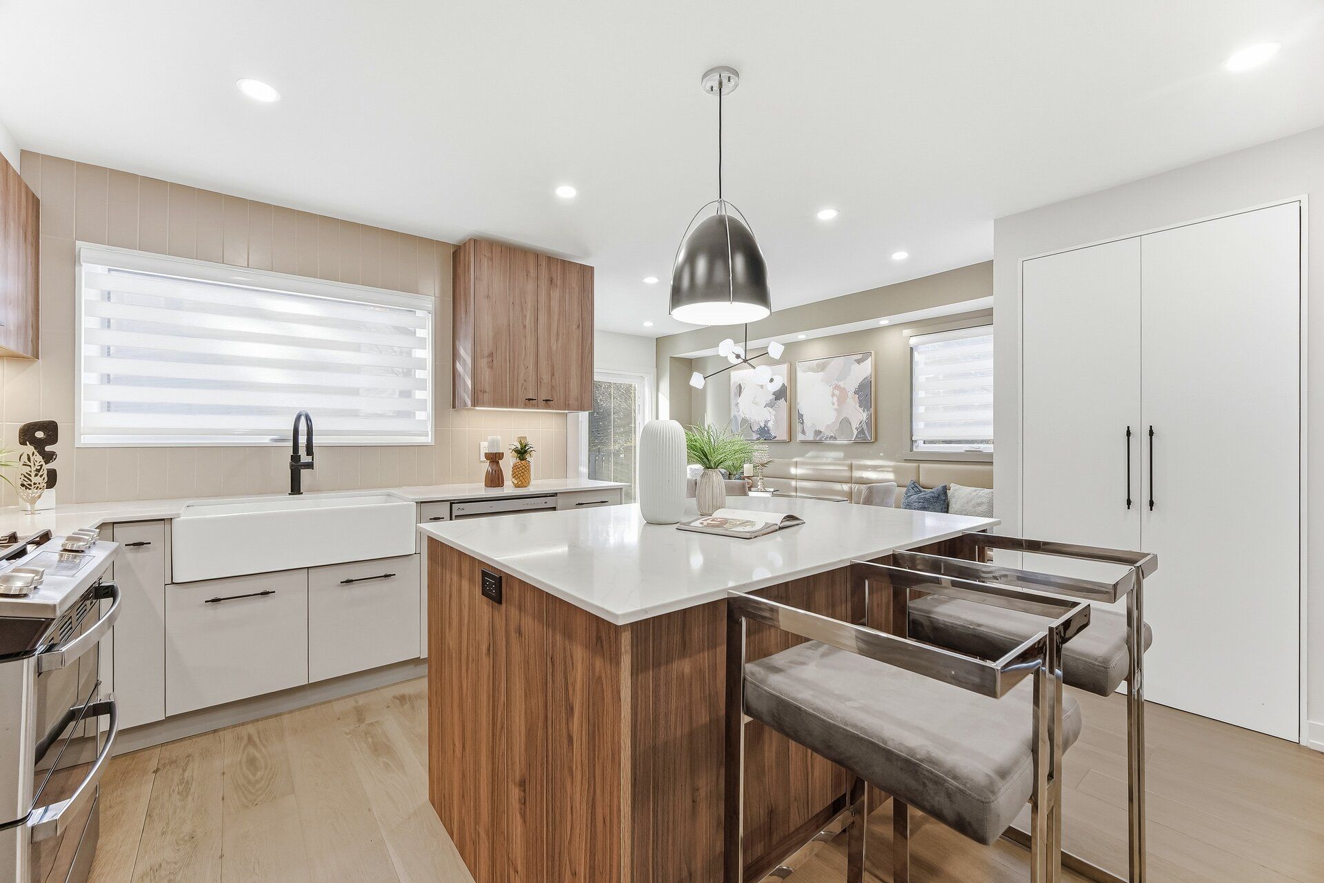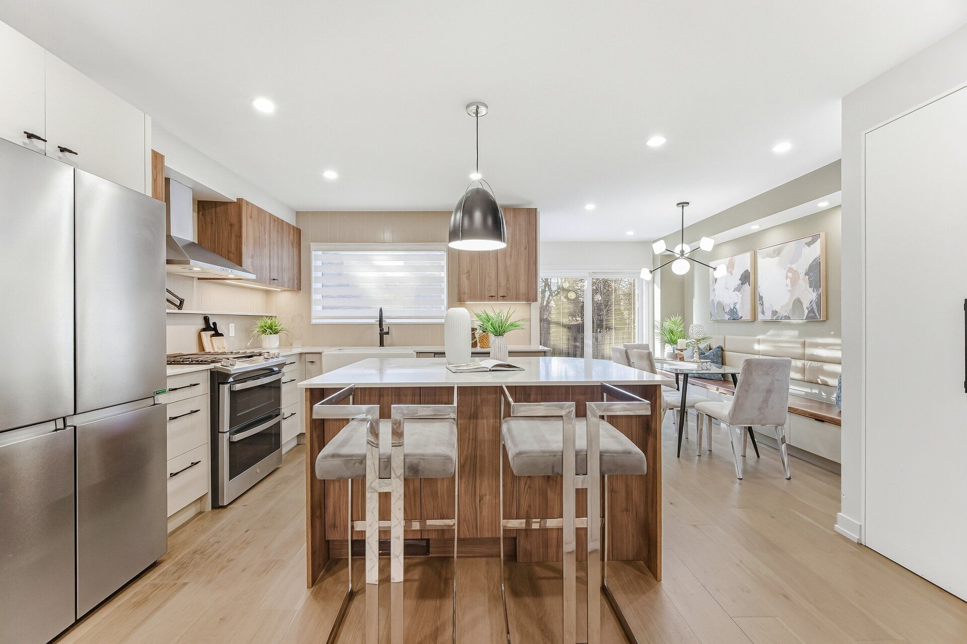 Welcome to this beautifully designed home which has been professionally renovated from top to bottom with high-quality materials, meticulous detail, and skilled craftsmanship. The functional main floor has too many upgrades to list. The chef's kitchen features quartz island and pantry, high end Franke (Swiss) sink and flush under-mount lighting. The Dining space features walnut bench seating, LED and accent lighting, and walk-out to the large yard. Heated floors are found in the entrance foyer and the main floor powder room. White oak hardwood floors run throughout the home; .The Living room boasts a gas fireplace, built-in shelving, and a stunning walnut beam feature wall. The second level offers 3 bedrooms, including a primary with his & hers custom built closets, a luxurious 3-piece ensuite & heated floors. The finished basement has an additional living room, bedroom and a 3 pc bath.