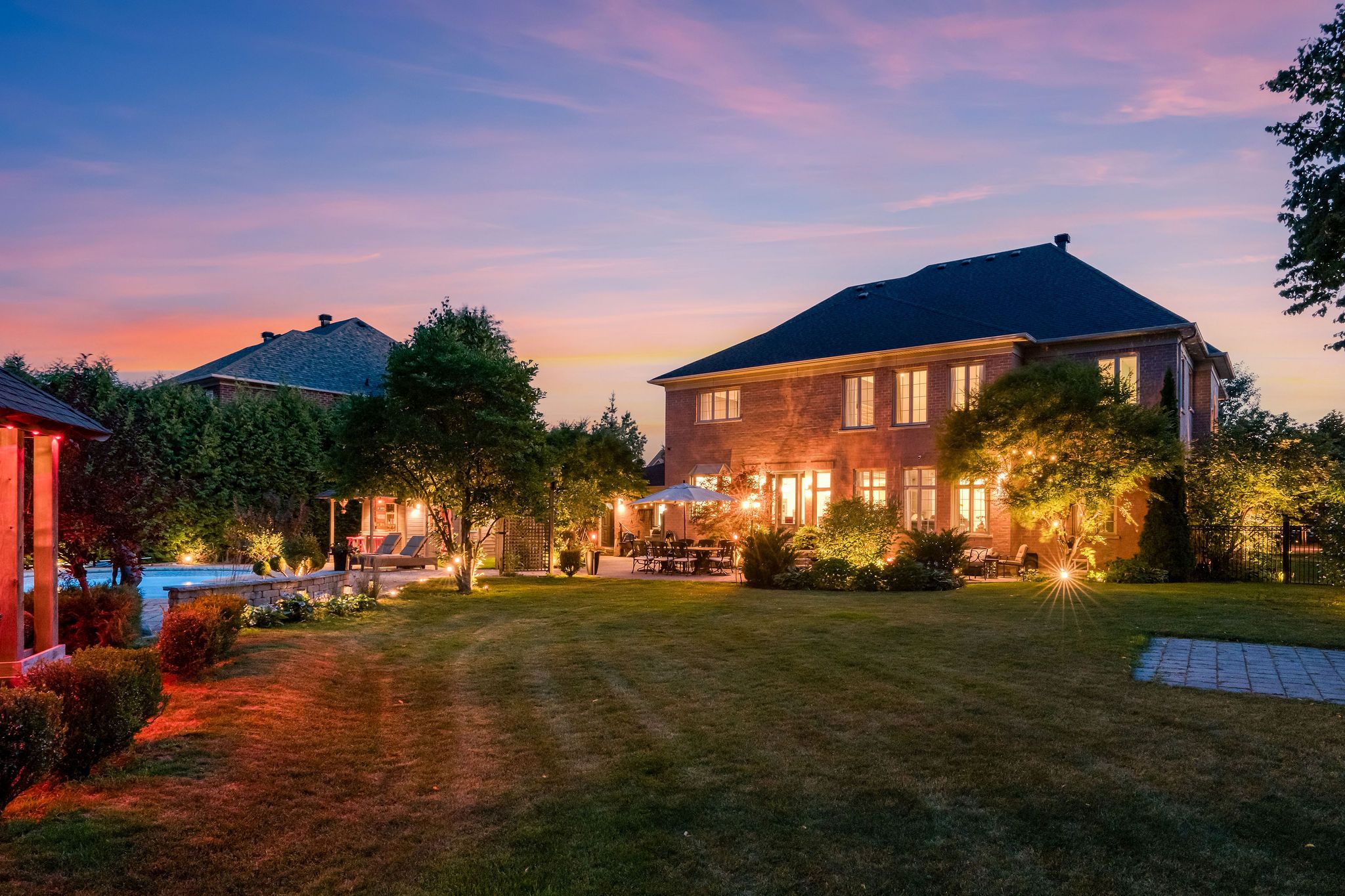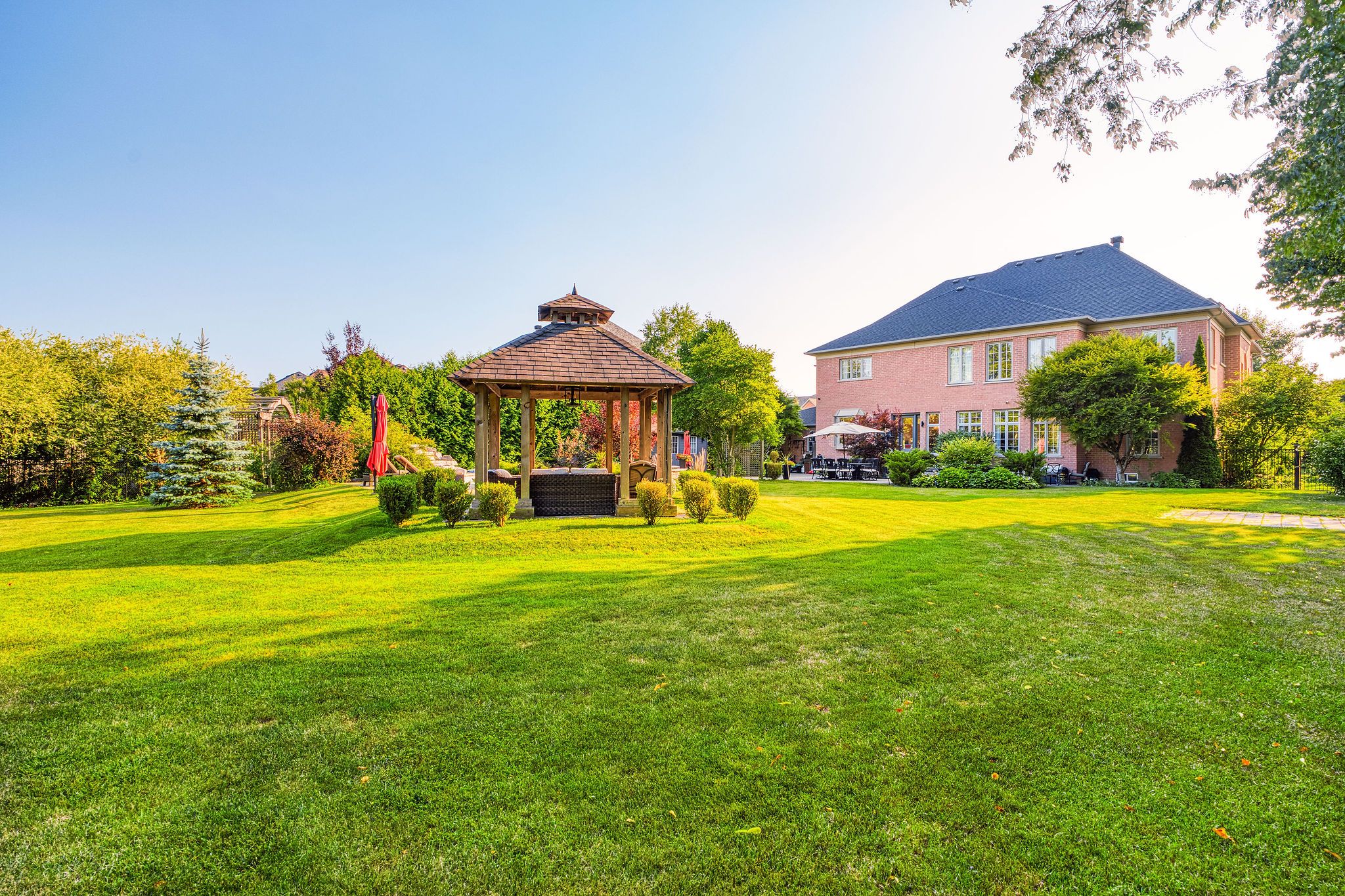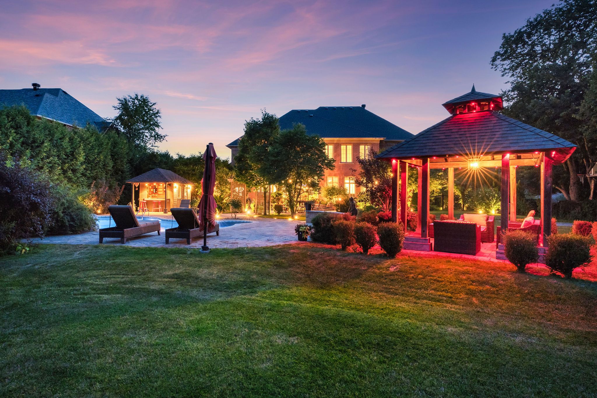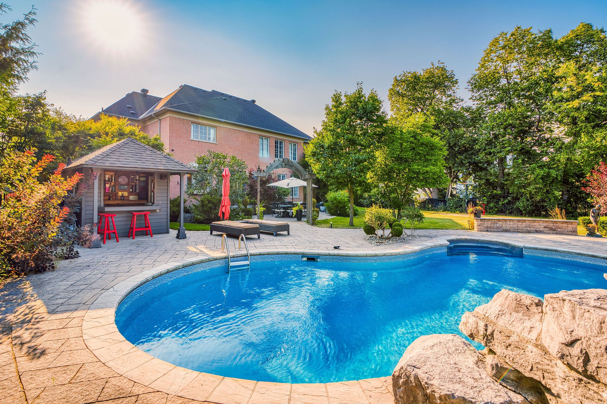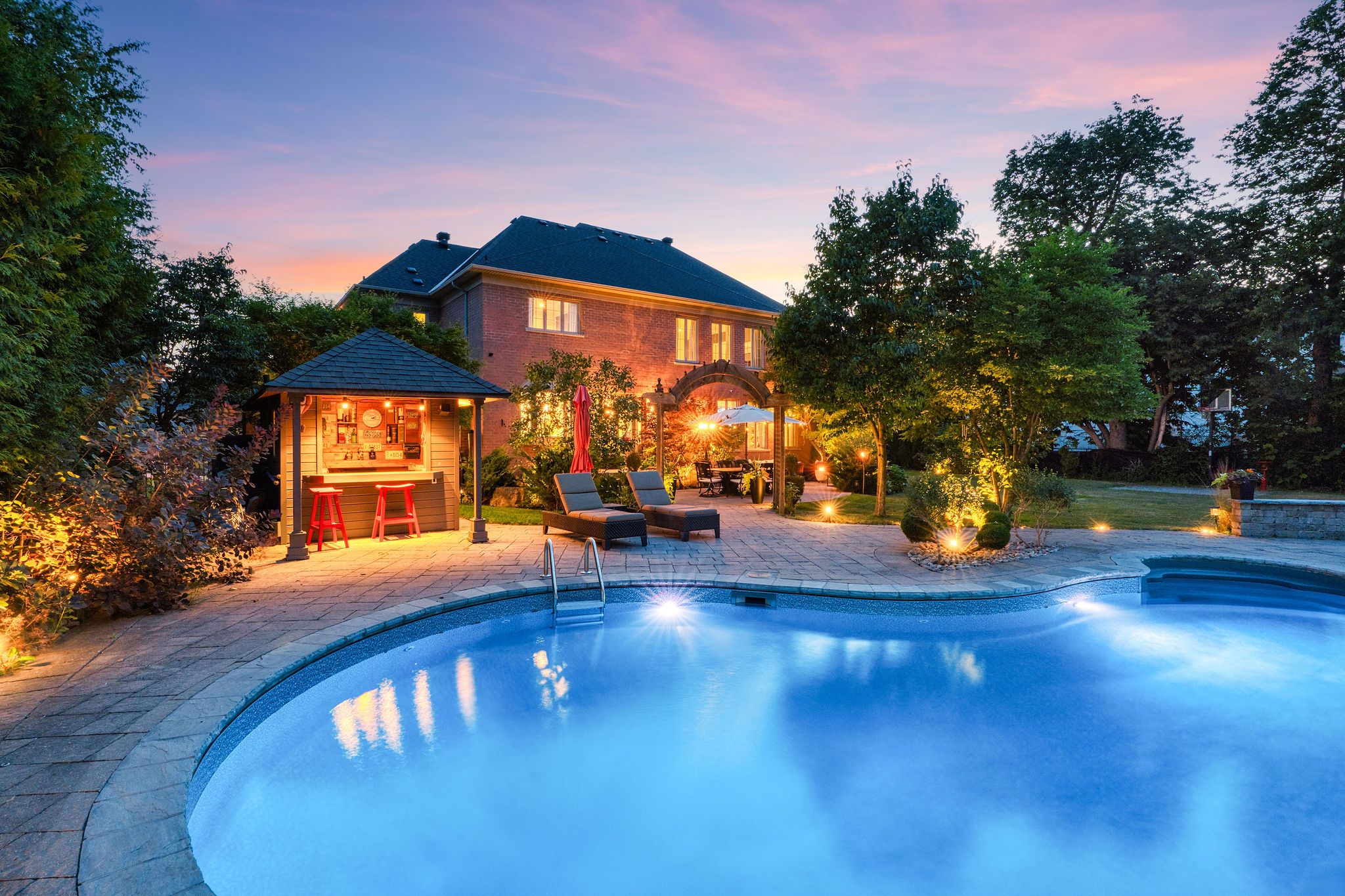 Perfectly positioned on a full ravine lot, 30 Bernadotte Drive offers an extraordinary blend of privacy, elegance, and modern comfort. This meticulously upgraded residence boasts 5 spacious bedrooms with every bedroom appointed with its own ensuite. Total 7 full washrooms, plus additional 2 powder rooms. Designed with both grand entertaining and intimate family living in mind, the homes thoughtful layout seamlessly combines sophistication with everyday functionality. From the moment you step through the front door, you are greeted by an abundance of natural light and uninterrupted views of the breathtaking garden. Sunlight pours in from every direction, creating a warm and uplifting atmosphere throughout the day. The connection to nature is ever-present from the sight of mature trees swaying gently outside to the birdsong that fills the air year-round. The heart of the home is the upgraded kitchen, complete with all new appliances, complemented by beautifully renovated bathrooms, including two powder rooms and a spa-inspired primary ensuite featuring a heated, massage bathtub. New tile flooring, custom closets in every bedroom, a freshly repainted interior, and a new roof further enhance the homes modern appeal. Comfort is assured with two furnaces one newer and the other well-maintained along with dual air conditioning units. The outdoor space is a true entertainers dream, featuring a sparkling pool, charming gazebo, and a dedicated pool house with a 3-piece washroom. Whether hosting a lively summer gathering or enjoying a quiet evening by the water, this backyard delivers the perfect ravine setting. Additional highlights include a 3+1 tandem car garage, and a fully finished basement with a wet bar, offering endless possibilities for recreation or extended family living. 30 Bernadotte Drive is more than just a home it is a serene sanctuary where luxury meets nature, providing a lifestyle of comfort, beauty, and tranquility.