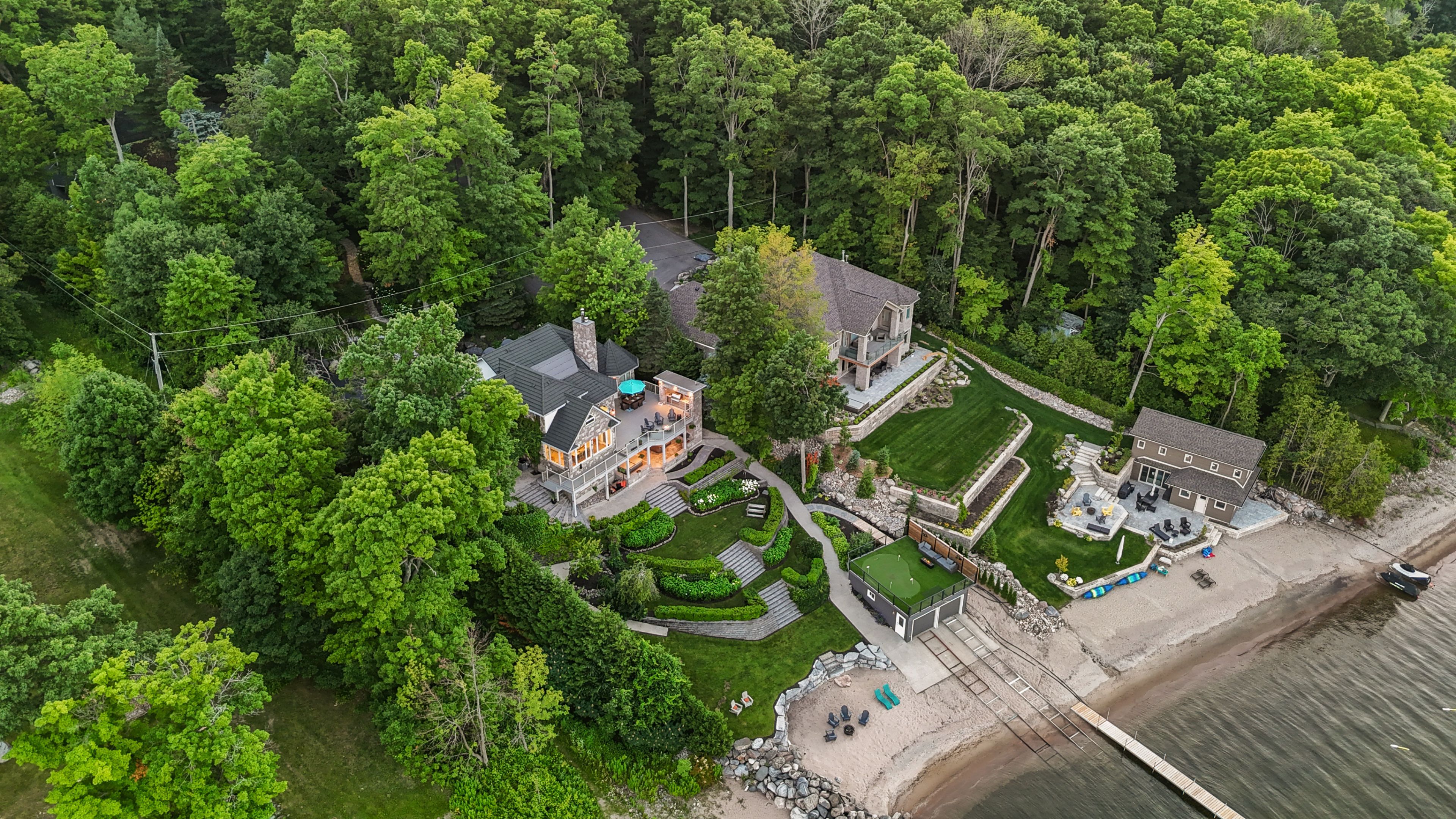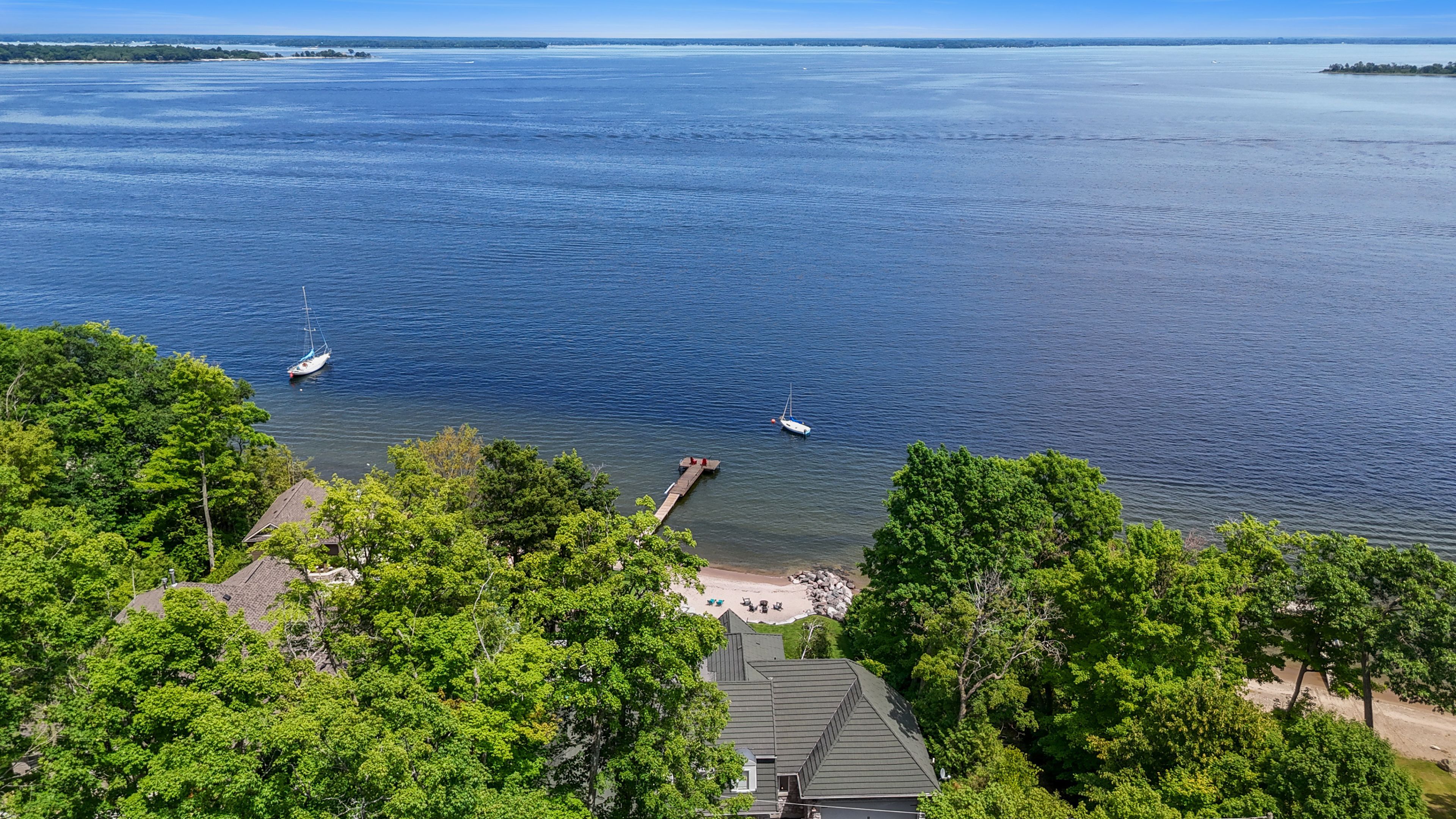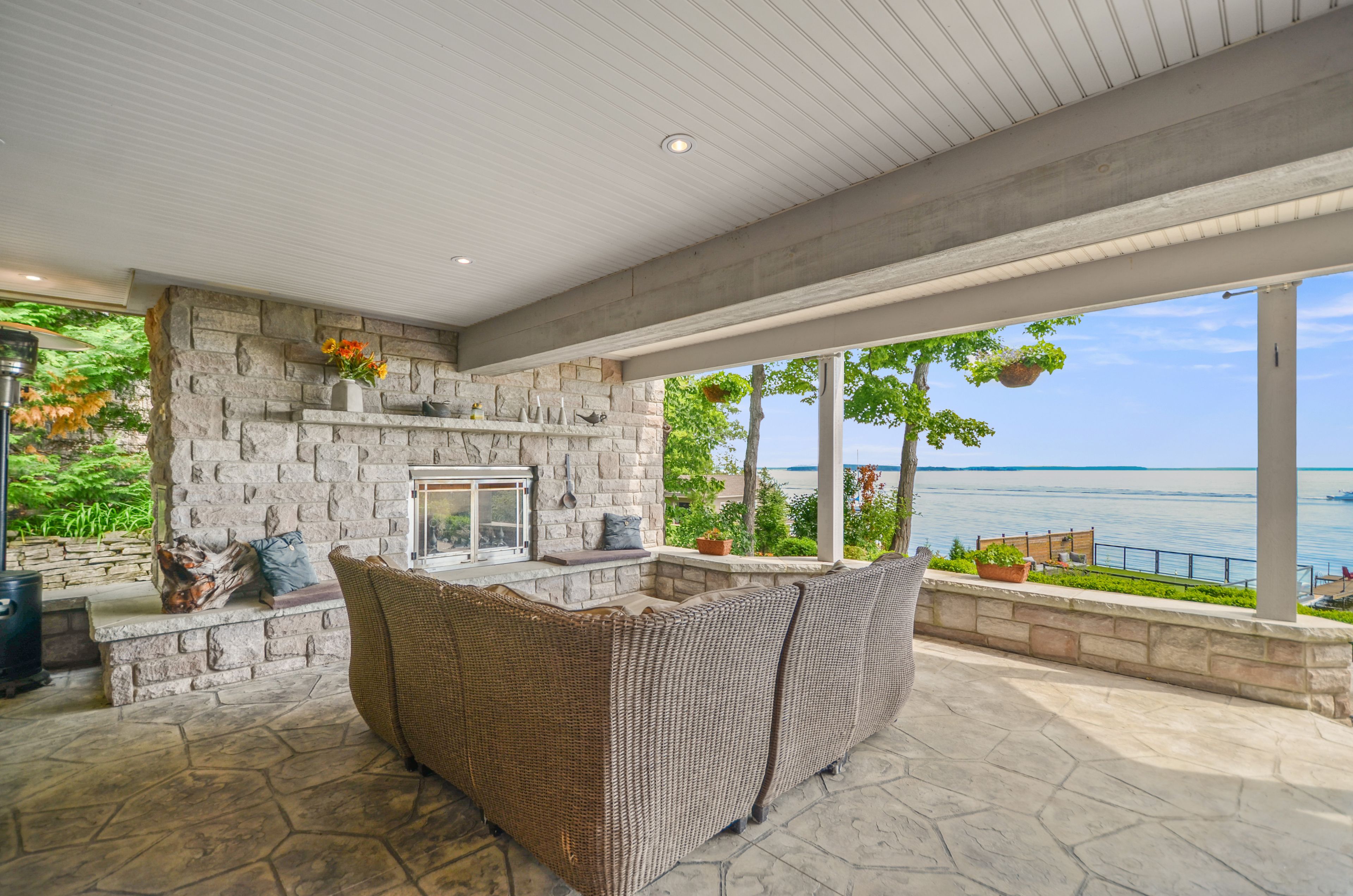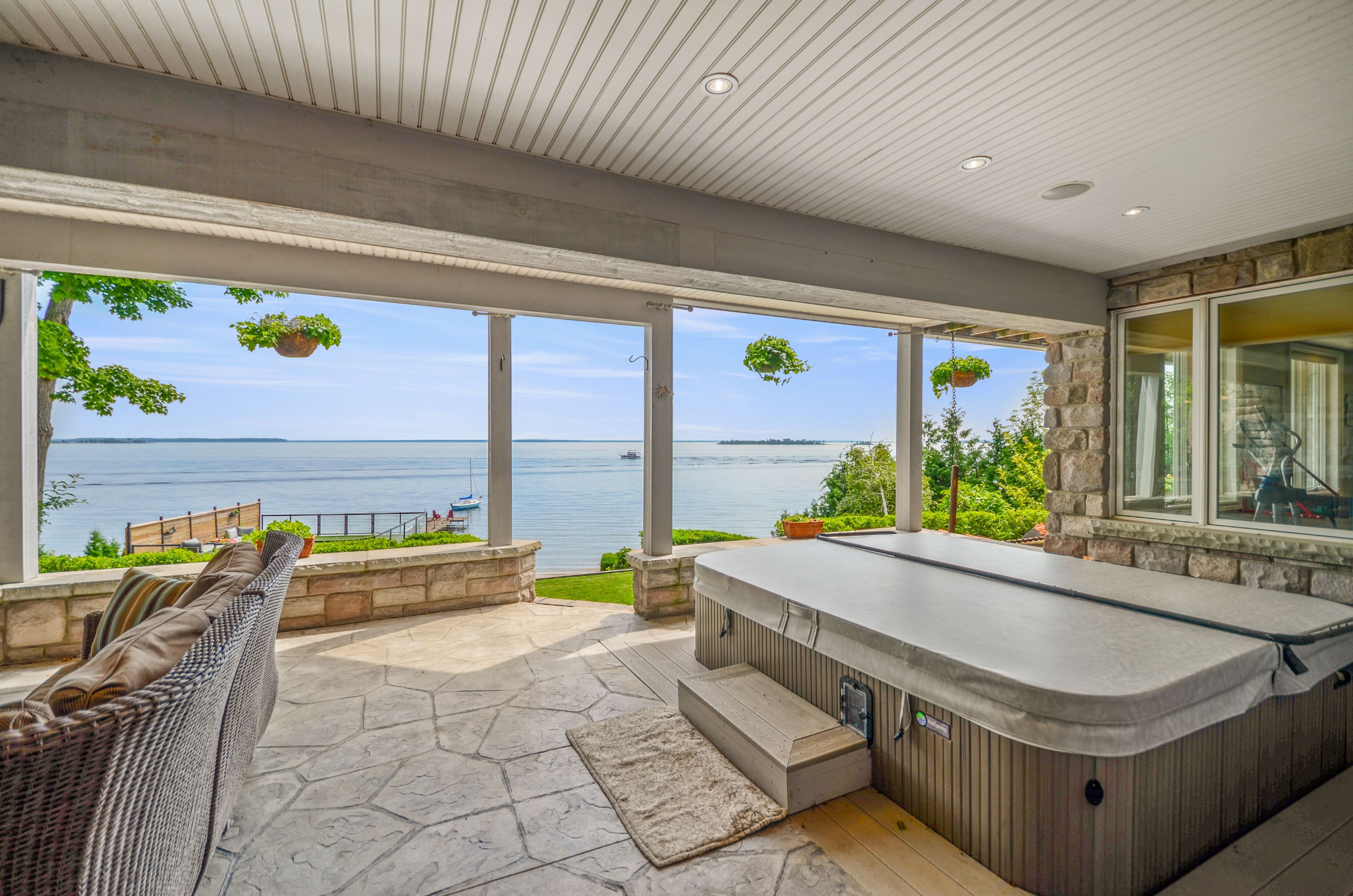 Perched majestically on Midland Point, this magnificent 4-bedroom, 5.5-bathroom estate commands 99 feet of pristine private Georgian Bay shoreline, offering an unparalleled canvas of panoramic water views and inspiring sunrises. Spanning 4,841 sq ft, this impeccably updated residence embodies sophisticated waterfront living. A culinary masterpiece awaits in the gourmet kitchen, featuring professional-grade appliances and a sprawling island, all designed to maximize the breathtaking bay vistas. Convenience meets luxury with a main floor primary suite and dedicated laundry. The expansive main deck is an entertainer's paradise, boasting an outdoor kitchen, a unique retractable garage door, and crystal-clear Invisirail for unobstructed views. The lower walk-out level transforms into a world of leisure, complete with a dedicated billiards room, an impressive office/library, a family room warmed by a fireplace, a private fitness area, and an exquisite wine cellar. Step directly from here into a covered three-season sanctuary, featuring a crackling wood fireplace and a bubbling hot tub. Enhancing this exceptional property are a contemporary 600+ sq ft street-front office with a 4-piece bath, ideal for remote work or a home business, and a charming 1-bedroom, 2-bathroom guest house, offering a cozy retreat with its own wood-burning fireplace. The waterfront truly defines this property, with a natural sandy beach, a welcoming fire pit, and a double dry boathouse equipped with a rail system for two vessels and a private dock. Above the boathouse, a private putting green offers a unique opportunity to refine your short game while soaking in the stellar views of the private beach and Midland Bay. As you arrive, meticulously manicured perennial gardens unfold, creating a serene, park-like drive that leads to the heart of this extraordinary home.