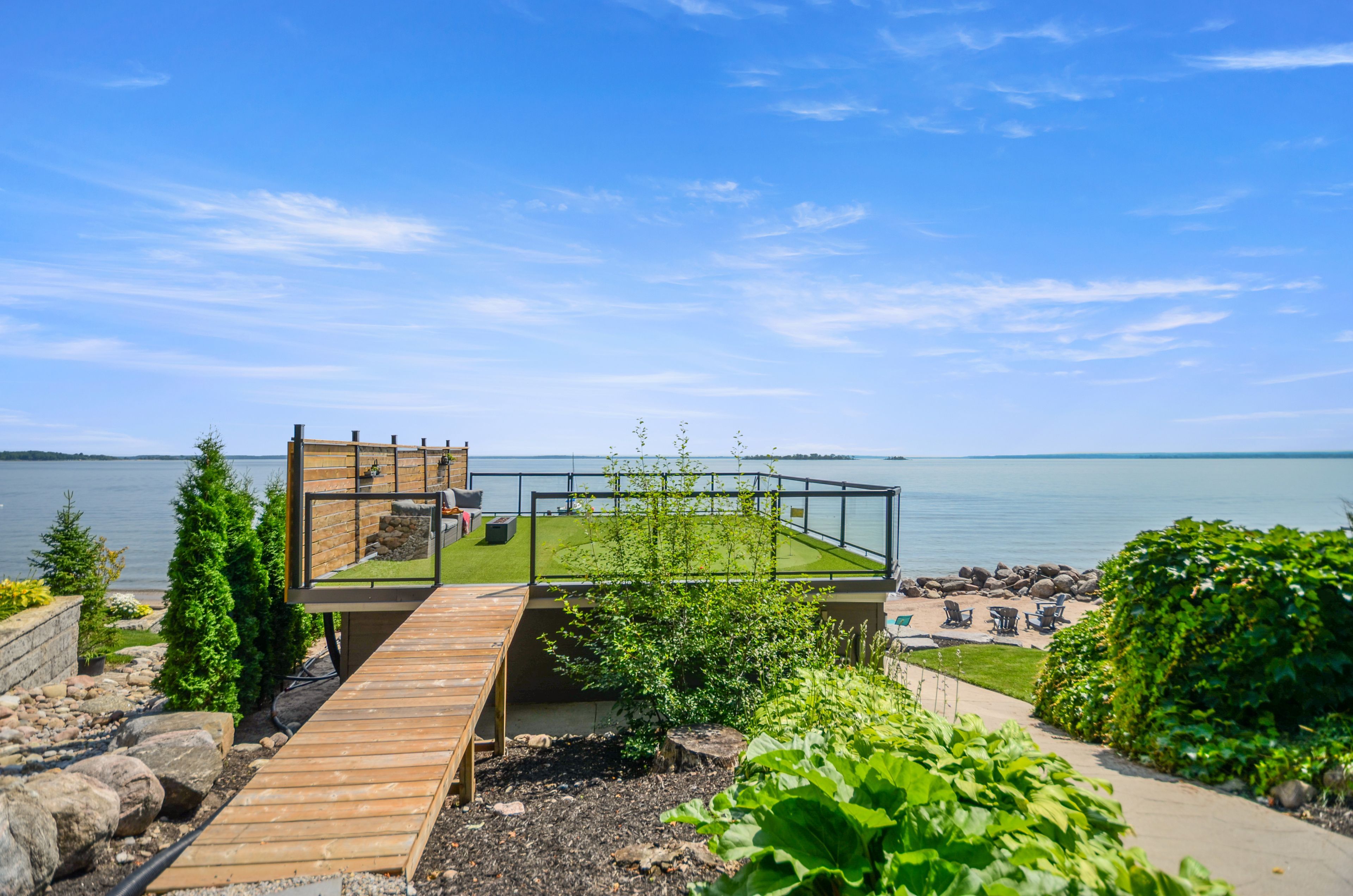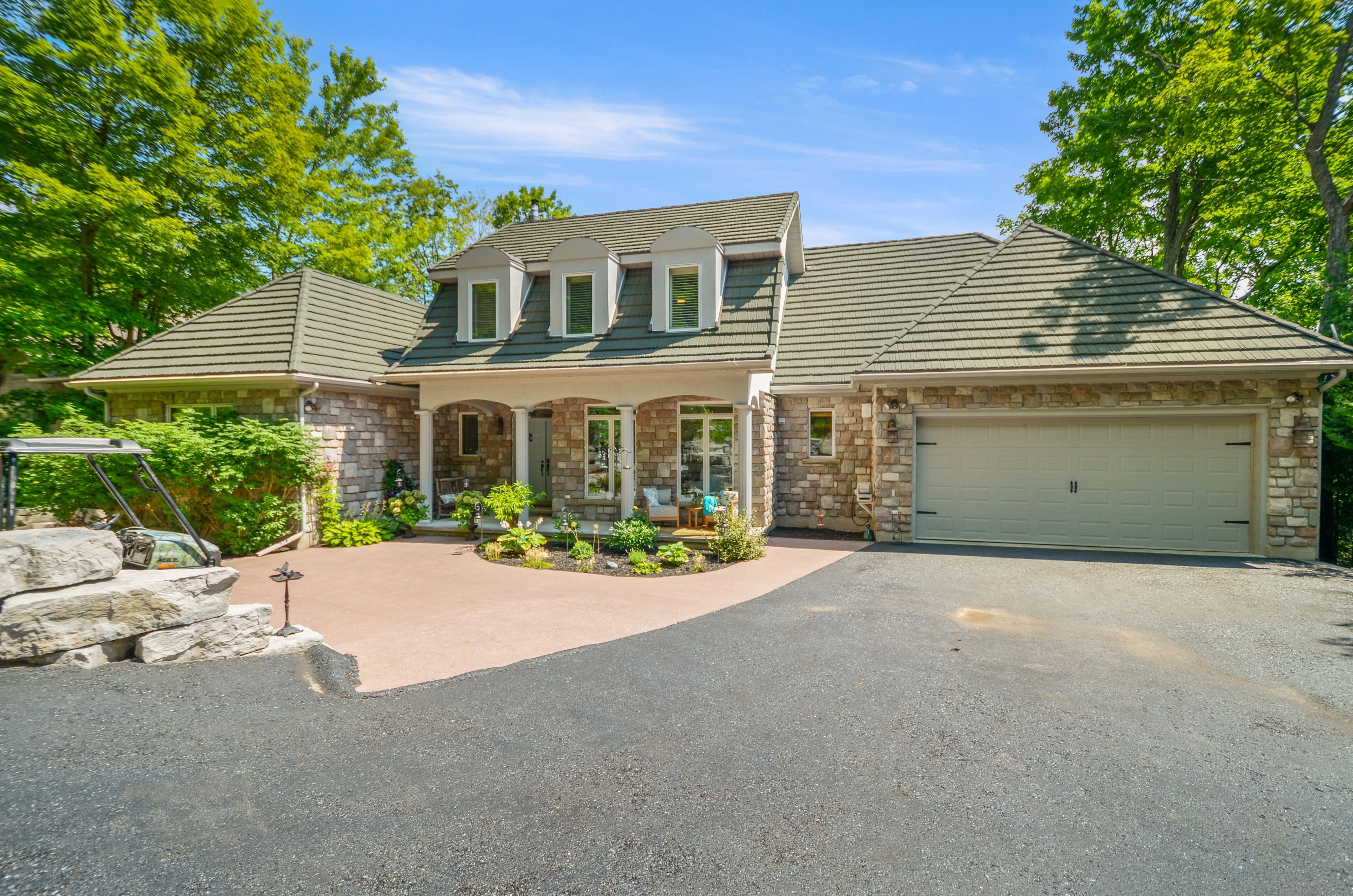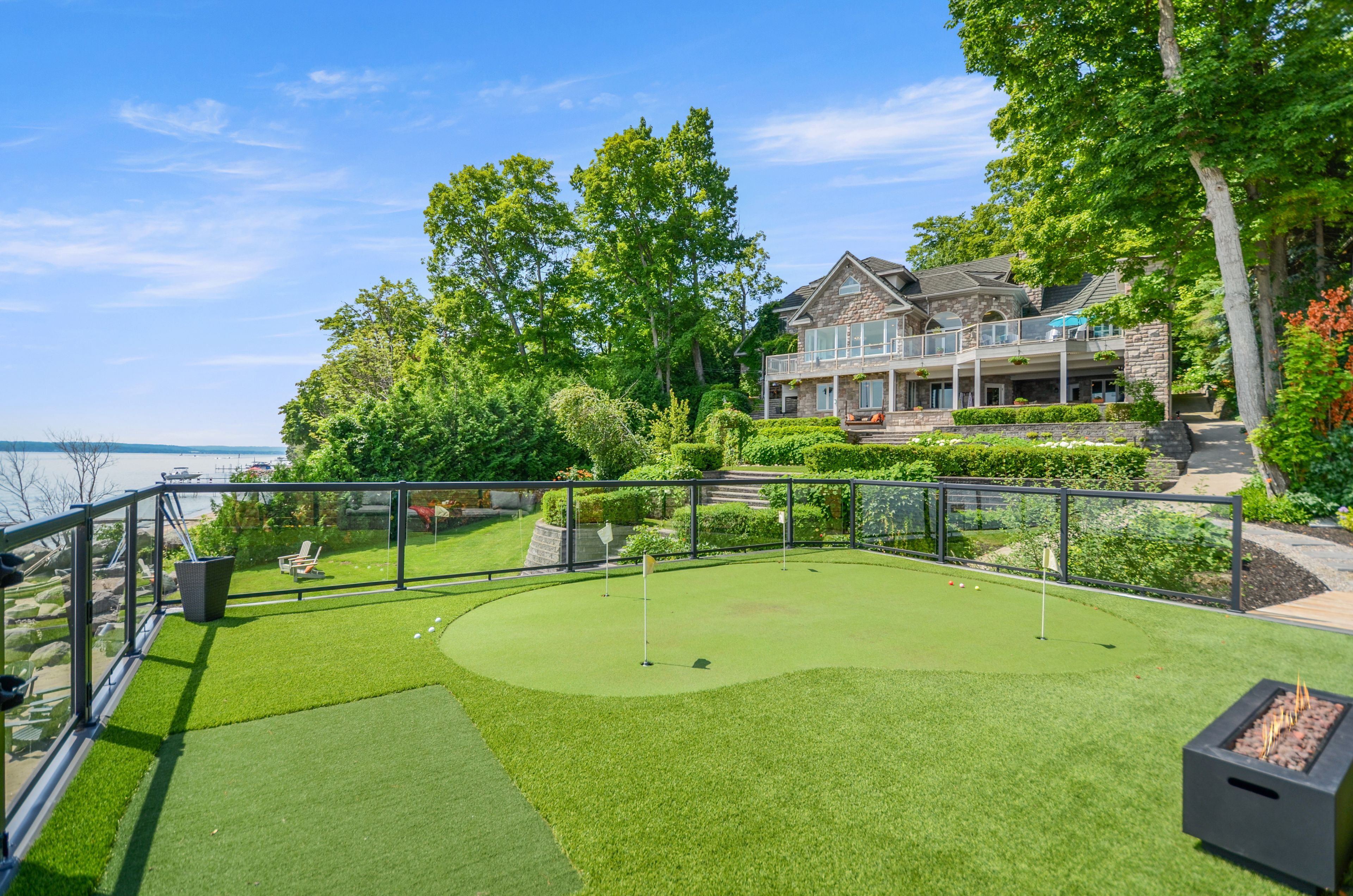 Perched majestically on Midland Point, this magnificent 4-bedroom, 5.5-bathroom estate commands 99 feet of pristine private Georgian Bay shoreline, offering an unparalleled canvas of panoramic water views and inspiring sunrises. Spanning 4,841 sq ft, this impeccably updated residence embodies sophisticated waterfront living. A culinary masterpiece awaits in the gourmet kitchen, featuring professional-grade appliances and a sprawling island, all designed to maximize the breathtaking bay vistas. Convenience meets luxury with a main floor primary suite and dedicated laundry. The expansive main deck is an entertainer's paradise, boasting an outdoor kitchen, a unique retractable garage door, and crystal-clear Invisirail for unobstructed views. The lower walk-out level transforms into a world of leisure, complete with a dedicated billiards room, an impressive office/library, a family room warmed by a fireplace, a private fitness area, and an exquisite wine cellar. Step directly from here into a covered three-season sanctuary, featuring a crackling wood fireplace and a bubbling hot tub. Enhancing this exceptional property are a contemporary 600+ sq ft street-front office with a 4-piece bath, ideal for remote work or a home business, and a charming 1-bedroom, 2-bathroom guest house, offering a cozy retreat with its own wood-burning fireplace. The waterfront truly defines this property, with a natural sandy beach, a welcoming fire pit, and a double dry boathouse equipped with a rail system for two vessels and a private dock. Above the boathouse, a private putting green offers a unique opportunity to refine your short game while soaking in the stellar views of the private beach and Midland Bay. As you arrive, meticulously manicured perennial gardens unfold, creating a serene, park-like drive that leads to the heart of this extraordinary home.