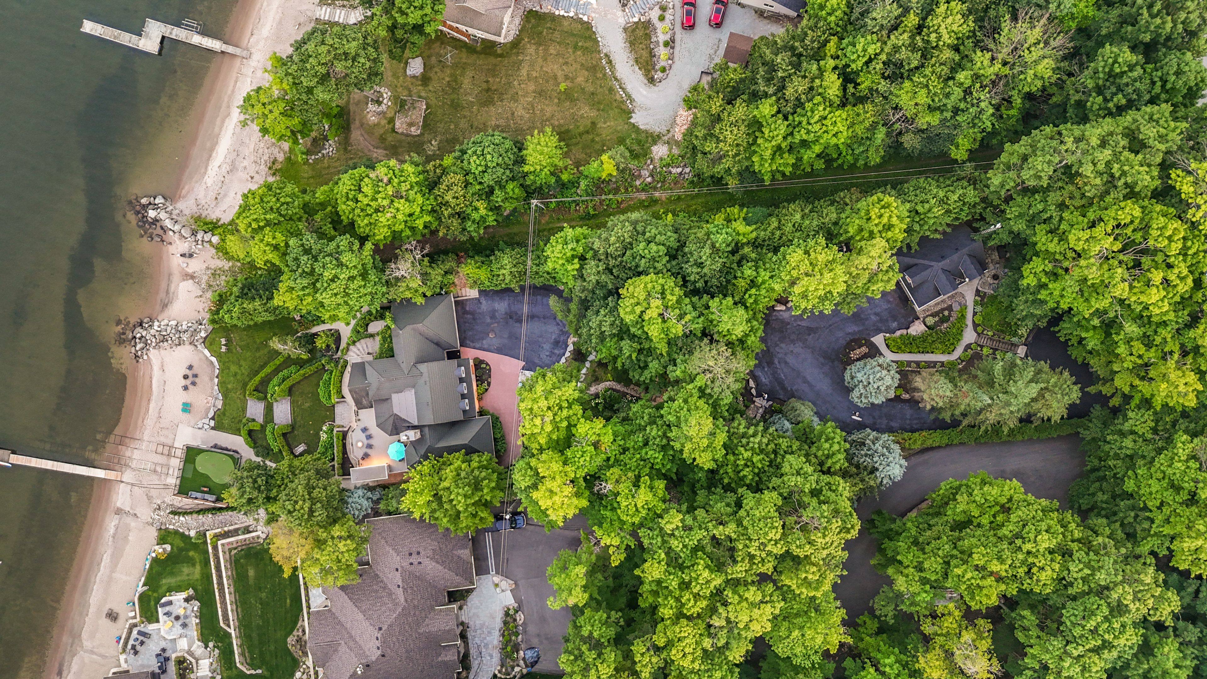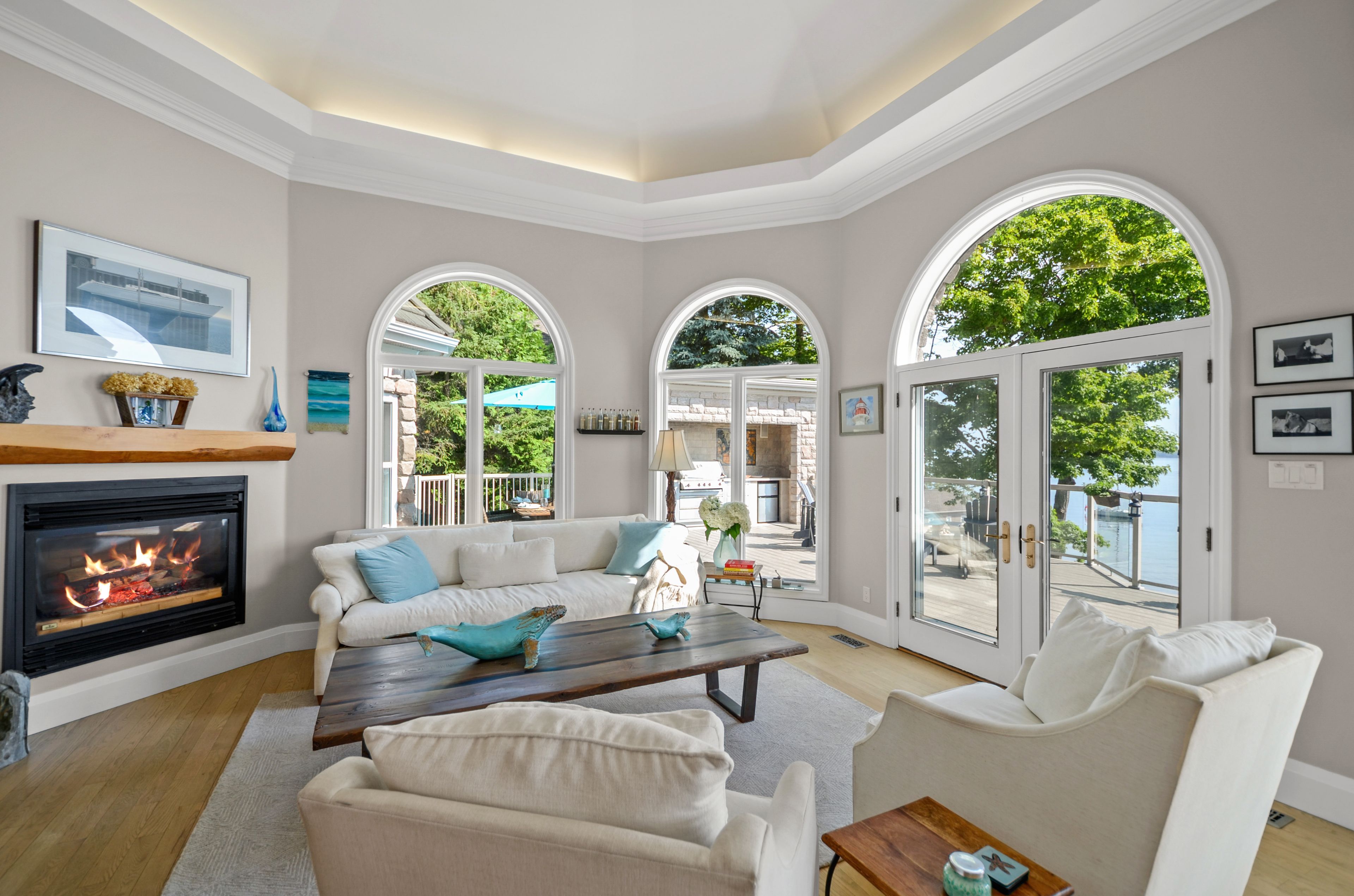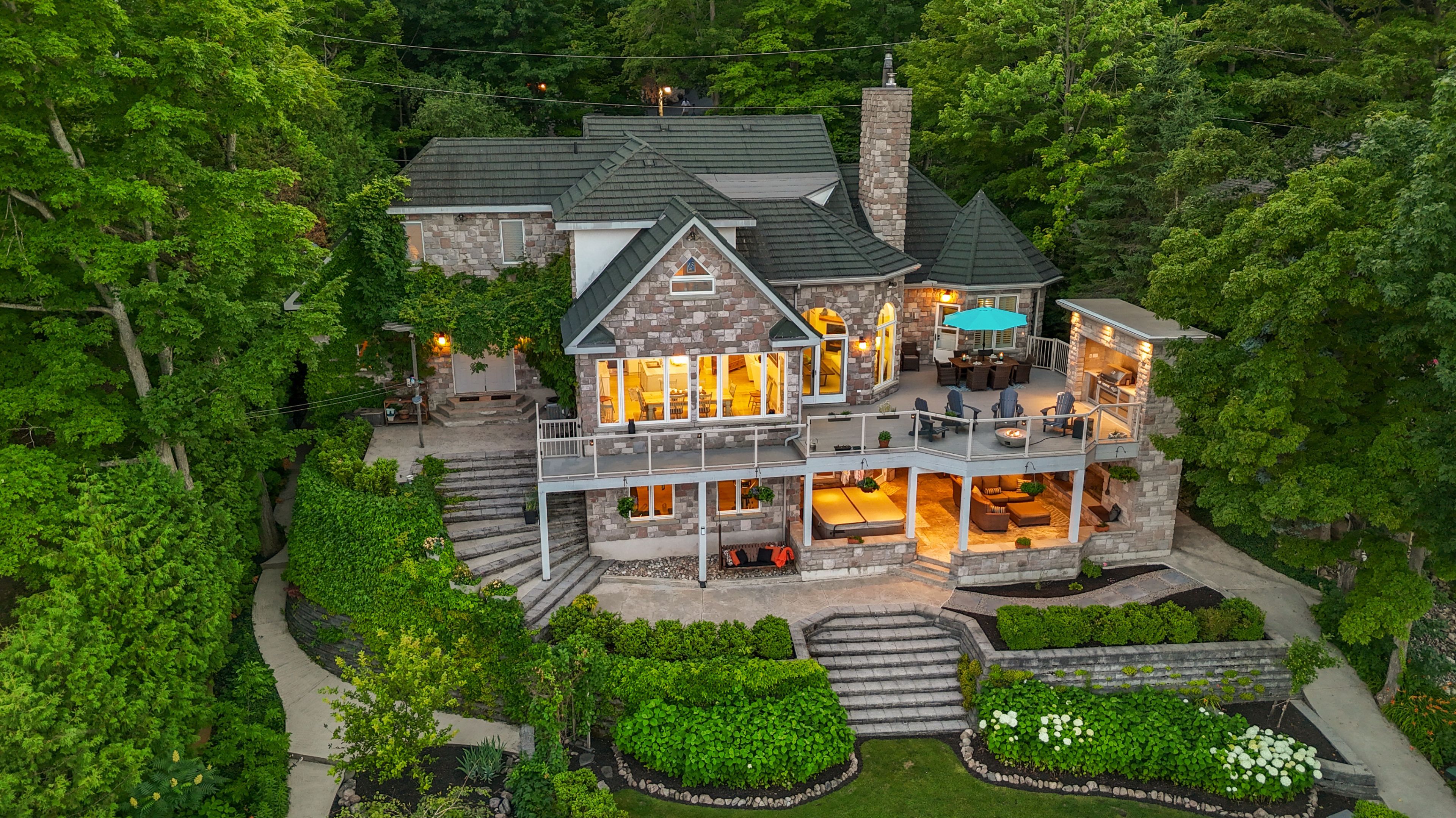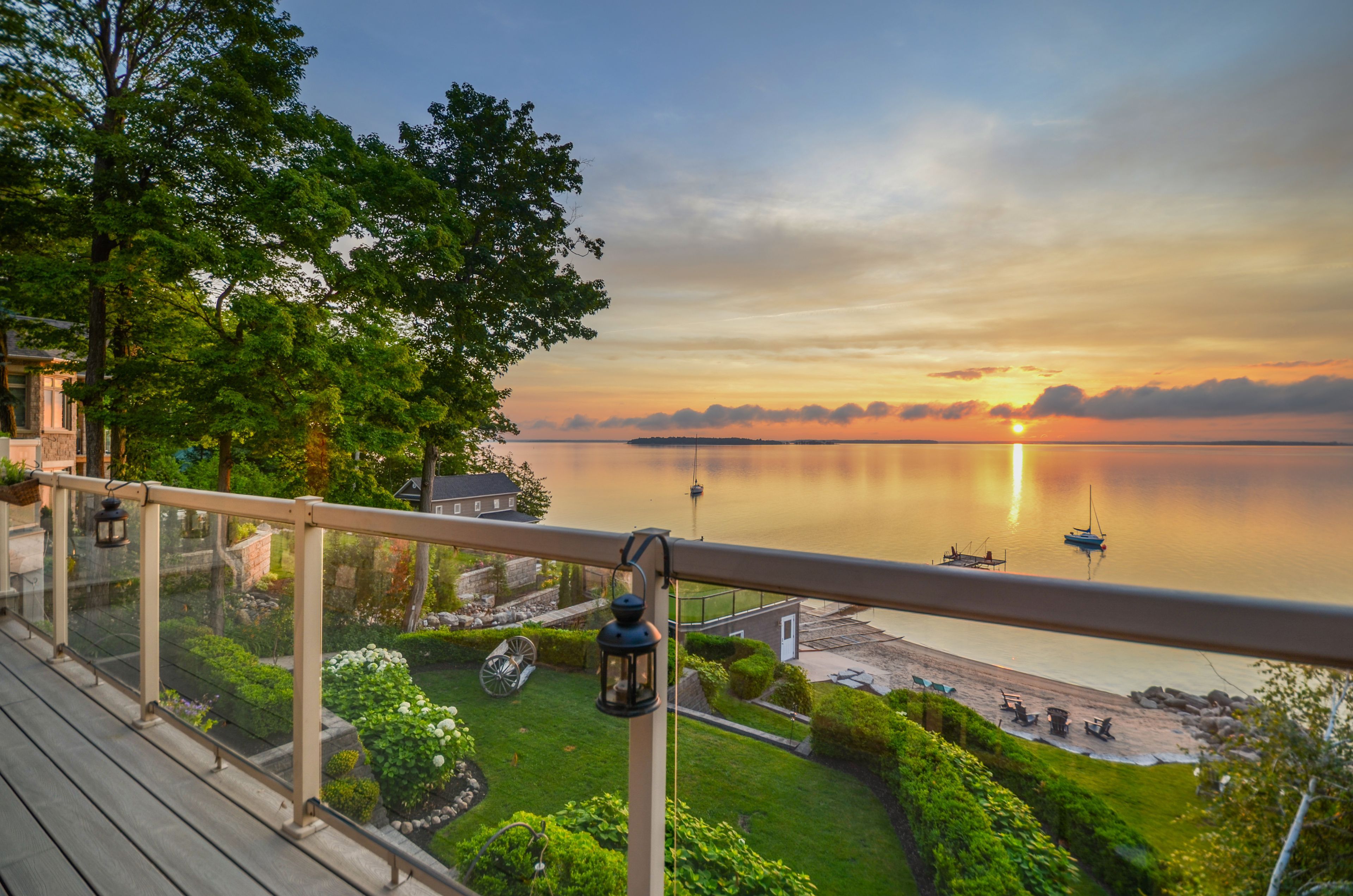 Perched majestically on Midland Point, this magnificent 4-bedroom, 5.5-bathroom estate commands 99 feet of pristine private Georgian Bay shoreline, offering an unparalleled canvas of panoramic water views and inspiring sunrises. Spanning 4,841 sq ft, this impeccably updated residence embodies sophisticated waterfront living. A culinary masterpiece awaits in the gourmet kitchen, featuring professional-grade appliances and a sprawling island, all designed to maximize the breathtaking bay vistas. Convenience meets luxury with a main floor primary suite and dedicated laundry. The expansive main deck is an entertainer's paradise, boasting an outdoor kitchen, a unique retractable garage door, and crystal-clear Invisirail for unobstructed views. The lower walk-out level transforms into a world of leisure, complete with a dedicated billiards room, an impressive office/library, a family room warmed by a fireplace, a private fitness area, and an exquisite wine cellar. Step directly from here into a covered three-season sanctuary, featuring a crackling wood fireplace and a bubbling hot tub. Enhancing this exceptional property are a contemporary 600+ sq ft street-front office with a 4-piece bath, ideal for remote work or a home business, and a charming 1-bedroom, 2-bathroom guest house, offering a cozy retreat with its own wood-burning fireplace. The waterfront truly defines this property, with a natural sandy beach, a welcoming fire pit, and a double dry boathouse equipped with a rail system for two vessels and a private dock. Above the boathouse, a private putting green offers a unique opportunity to refine your short game while soaking in the stellar views of the private beach and Midland Bay. As you arrive, meticulously manicured perennial gardens unfold, creating a serene, park-like drive that leads to the heart of this extraordinary home.