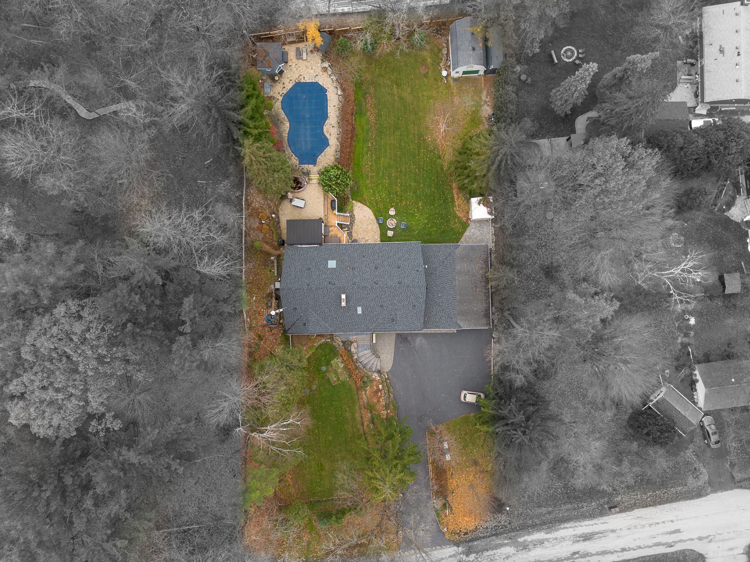 Tucked away on a quiet dead-end cul-de-sac court, this stunning raised bungalow combines elegance, comfort, and versatility with rare country-style privacy just steps from city living. Perfect for families, entertainers, or those seeking multi-generational living, this home offers an exceptional lifestyle. Inside, you'll find a spacious layout featuring 4 bedrooms above grade, including a primary suite with his-and-her closets and convenient semi-ensuite access. The home offers a luxurious 5-piece semi-ensuite bath plus a powder room with laundry, balancing style with everyday practicality. The heart of the home is the expansive gourmet kitchen with skylight, designed with both function and entertaining in mind. The adjoining dining area flows seamlessly to the backyard, creating a natural extension of your living space. Gather in the inviting family room with a cozy fireplace, or enjoy cinematic nights with the built-in drop-down screen. The lower level impresses with a second full kitchen, 3-piecebath, and a private dwelling unit with its own entrance-ideal for extended family, guests, or rental income. This self-contained suite features 1 bedroom, 1 bath, a kitchen, laundry, and storage. Car enthusiasts and professionals will love the double tandem heated garage, partially converted into a stylish hair salon while still offering generous storage. Additional parking is effortless with an attached carport and a driveway for 10+ vehicles. A large barn at the rear provides secure space for your collector car or extra storage. The backyard is a true resort-style retreat. Enjoy the pool, sauna, and cabana built by Jameson Pools in 2010, complemented by an outdoor fire pit-perfect for summer gatherings or quiet evenings under the stars. The expansive grounds invite both entertaining and private relaxation in equal measure. This property truly offers it all: luxury, functionality, and endless possibilities-all in an unparalleled setting.