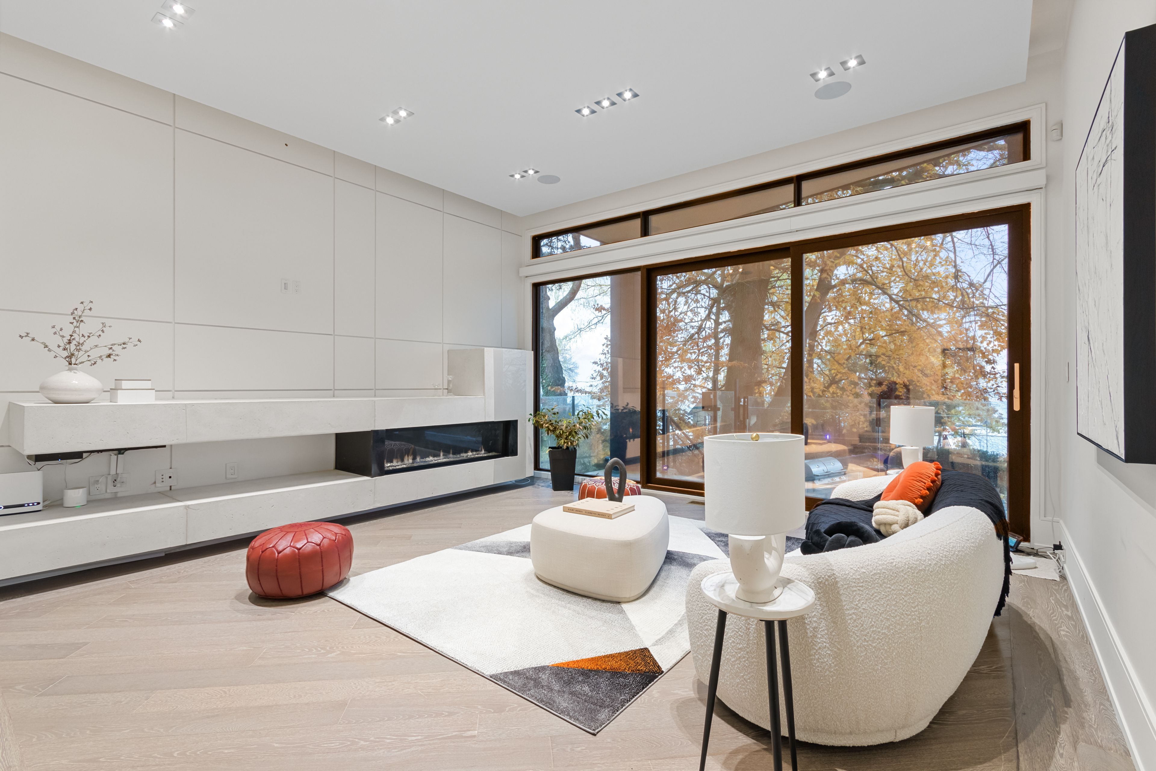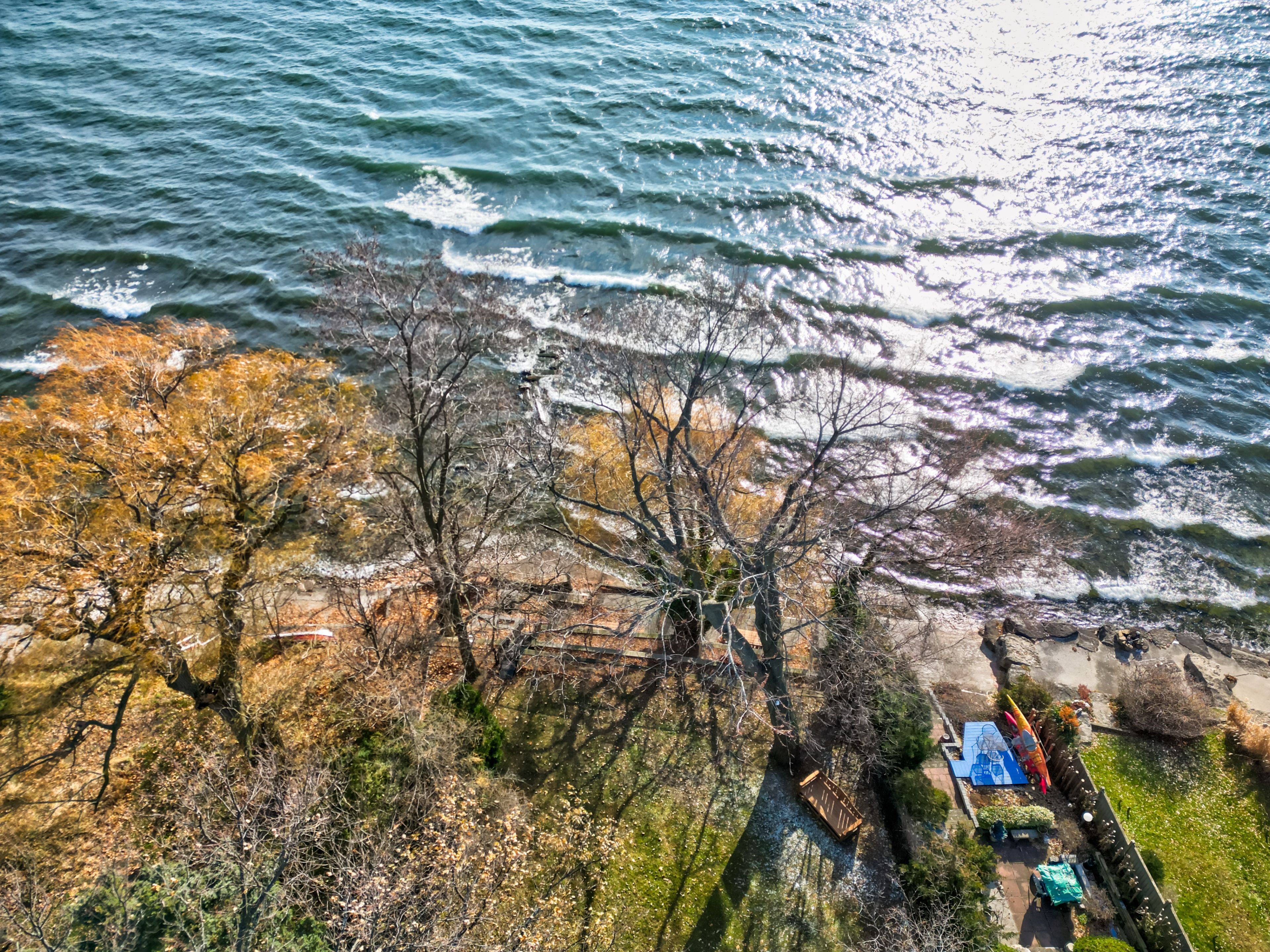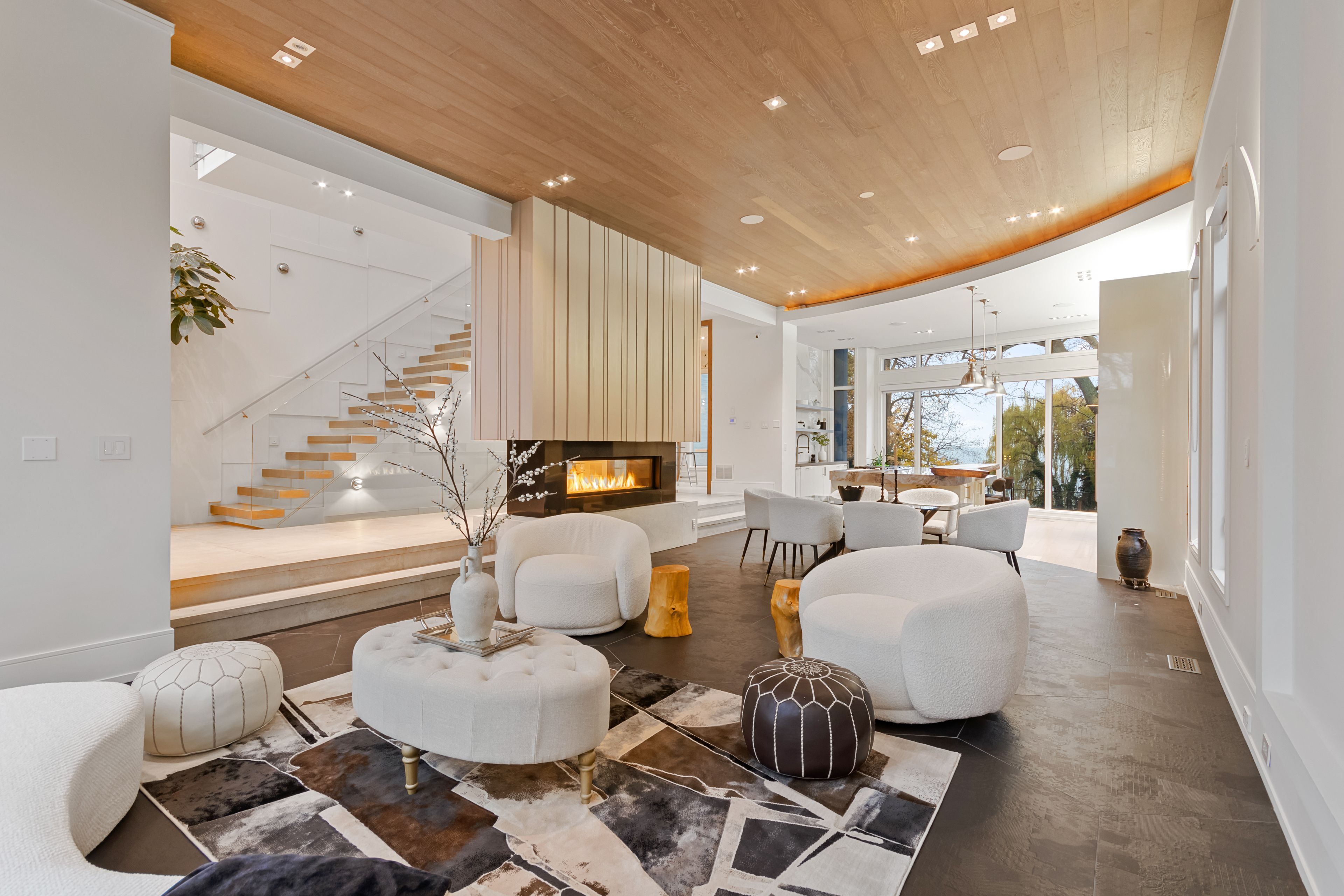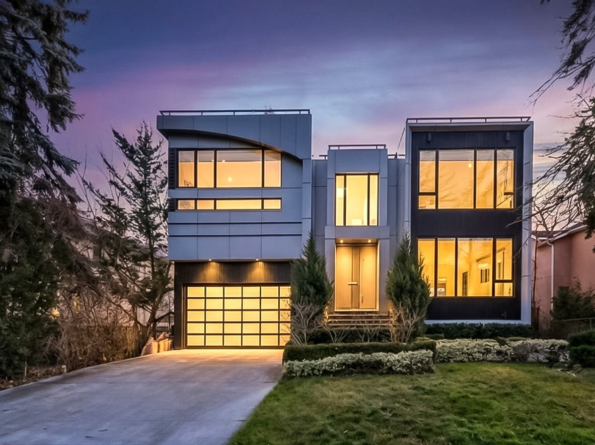 Set along South Etobicoke's prestigious lakefront corridor, this modern estate offers over 6,200 SF of refined interiors paired with resort-style amenities seldom available. Bold in presence and uncompromising in design, it sits behind mature trees with an architectural profile that frames uninterrupted Lake Ontario views. A dramatic open-to-above foyer introduces the home, featuring a floating glass staircase, overhead skylights, and a direct views of the water. The main level unfolds as a sequence of sophisticated living spaces defined by warm wood ceilings, gallery-like walls, and a sculptural double-sided linear fireplace. Near floor-to-ceiling windows wrap the home, inviting natural light and capturing the shoreline from every angle. The chef's kitchen delivers a magazine-worthy experience with Wolf and Sub-Zero appliances, bespoke cabinetry, a custom backsplash, and a striking central island. Adjacent living and dining zones create a fluid setting for elevated entertaining or intimate evenings. Above, 4 serene bedroom suites each offer a walk-in closet and ensuite. The lakefront primary retreat features a boutique dressing room, spa-calibre ensuite with heated floors and a freestanding tub overlooking the water, plus a private balcony for quiet reflections. The lower level extends the home's resort-like character with a recreation lounge, bar, gym, sauna, steam room, wine cellar, and an additional guest suite, opening seamlessly to the tiered backyard. Outdoors, multiple terraces, mature landscaping, a heated pool, a hot tub, and sweeping lake vistas create a breathtaking environment for year-round enjoyment. Additional comforts include a heated driveway, architectural millwork, integrated lighting, and a layout designed for both luxury living and effortless hosting. Moments from waterfront trails, marinas, golf, and downtown Toronto, this estate offers a rare opportunity to own an impeccably crafted lakefront home.