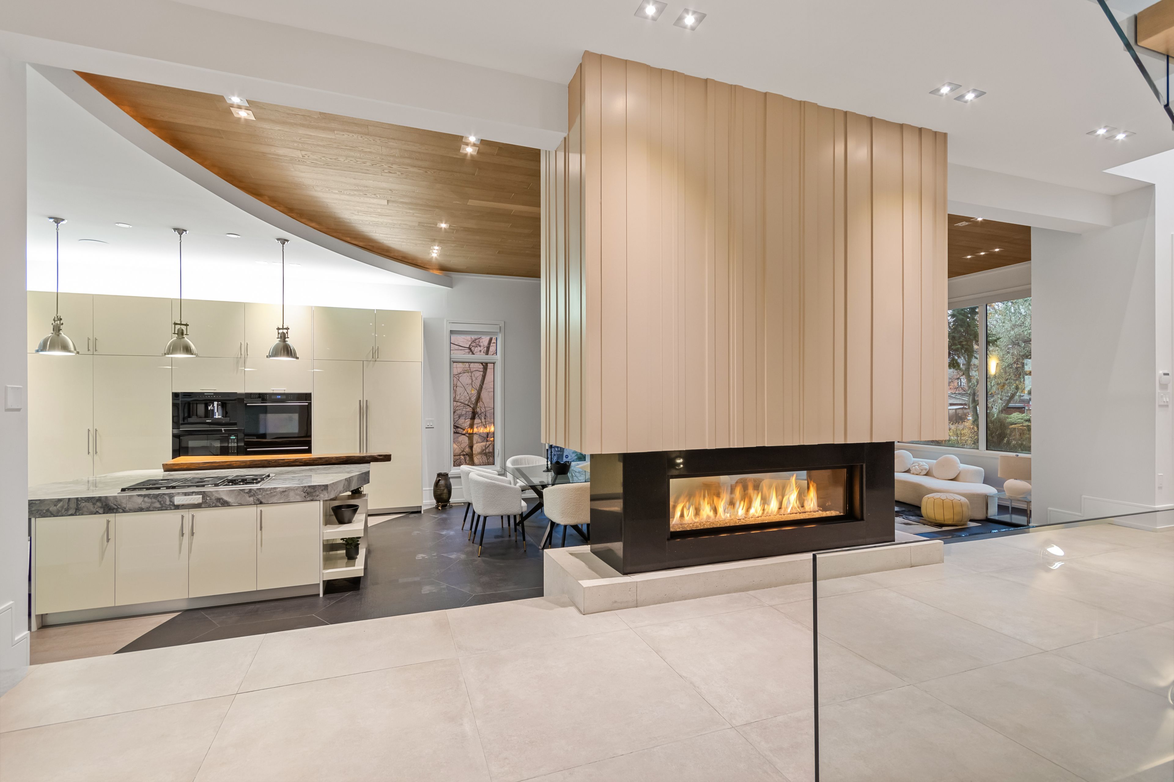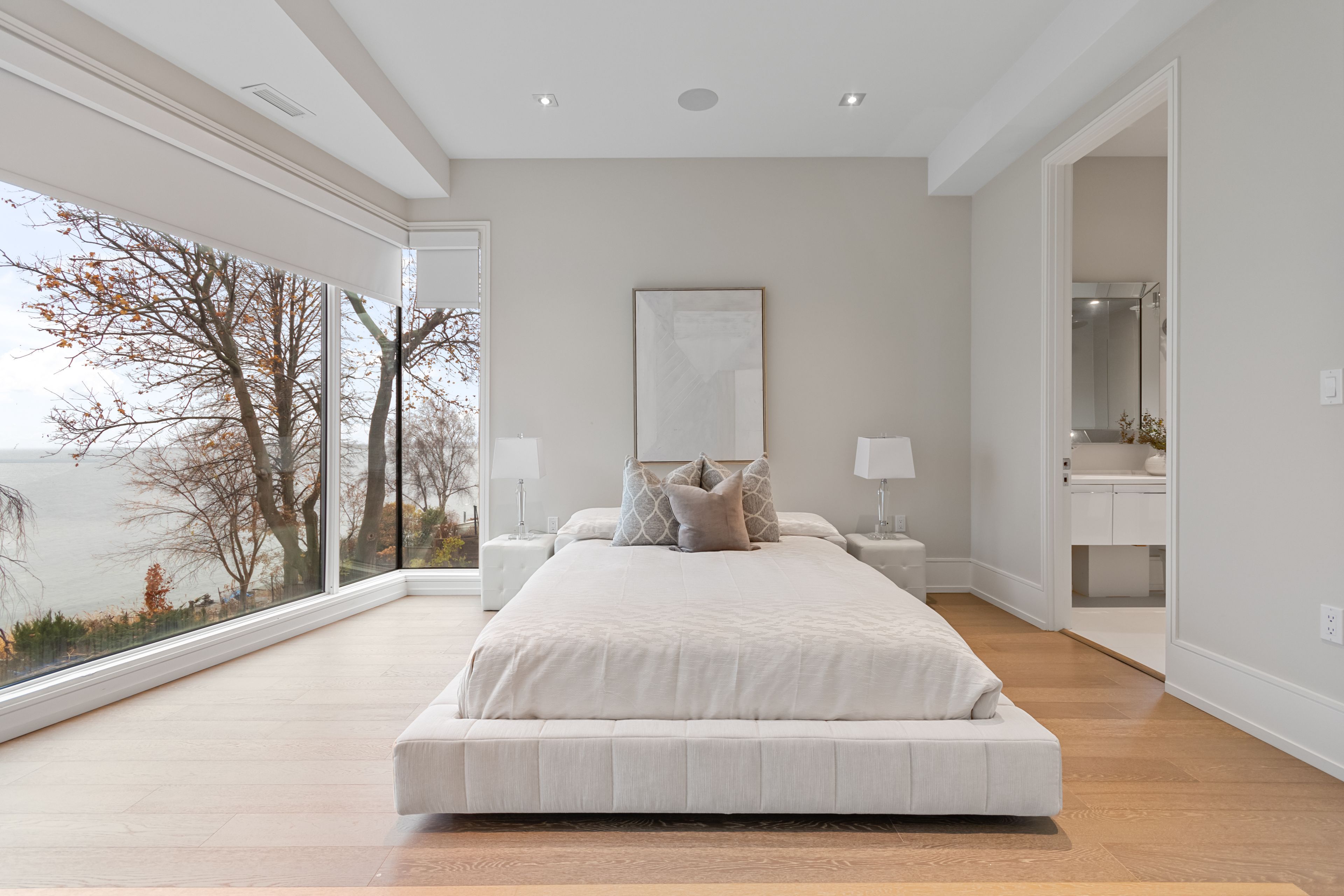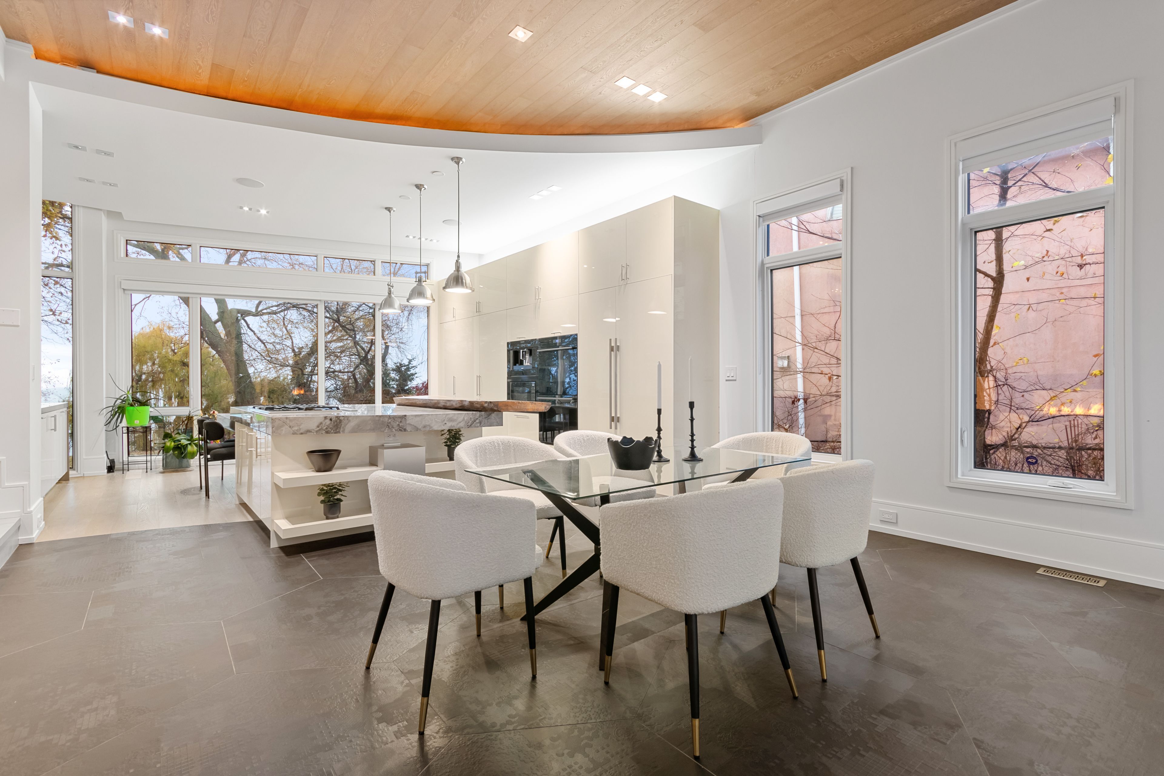 Set along South Etobicoke's prestigious lakefront corridor, this modern estate offers over 6,200 SF of refined interiors paired with resort-style amenities seldom available. Bold in presence and uncompromising in design, it sits behind mature trees with an architectural profile that frames uninterrupted Lake Ontario views. A dramatic open-to-above foyer introduces the home, featuring a floating glass staircase, overhead skylights, and a direct views of the water. The main level unfolds as a sequence of sophisticated living spaces defined by warm wood ceilings, gallery-like walls, and a sculptural double-sided linear fireplace. Near floor-to-ceiling windows wrap the home, inviting natural light and capturing the shoreline from every angle. The chef's kitchen delivers a magazine-worthy experience with Wolf and Sub-Zero appliances, bespoke cabinetry, a custom backsplash, and a striking central island. Adjacent living and dining zones create a fluid setting for elevated entertaining or intimate evenings. Above, 4 serene bedroom suites each offer a walk-in closet and ensuite. The lakefront primary retreat features a boutique dressing room, spa-calibre ensuite with heated floors and a freestanding tub overlooking the water, plus a private balcony for quiet reflections. The lower level extends the home's resort-like character with a recreation lounge, bar, gym, sauna, steam room, wine cellar, and an additional guest suite, opening seamlessly to the tiered backyard. Outdoors, multiple terraces, mature landscaping, a heated pool, a hot tub, and sweeping lake vistas create a breathtaking environment for year-round enjoyment. Additional comforts include a heated driveway, architectural millwork, integrated lighting, and a layout designed for both luxury living and effortless hosting. Moments from waterfront trails, marinas, golf, and downtown Toronto, this estate offers a rare opportunity to own an impeccably crafted lakefront home.