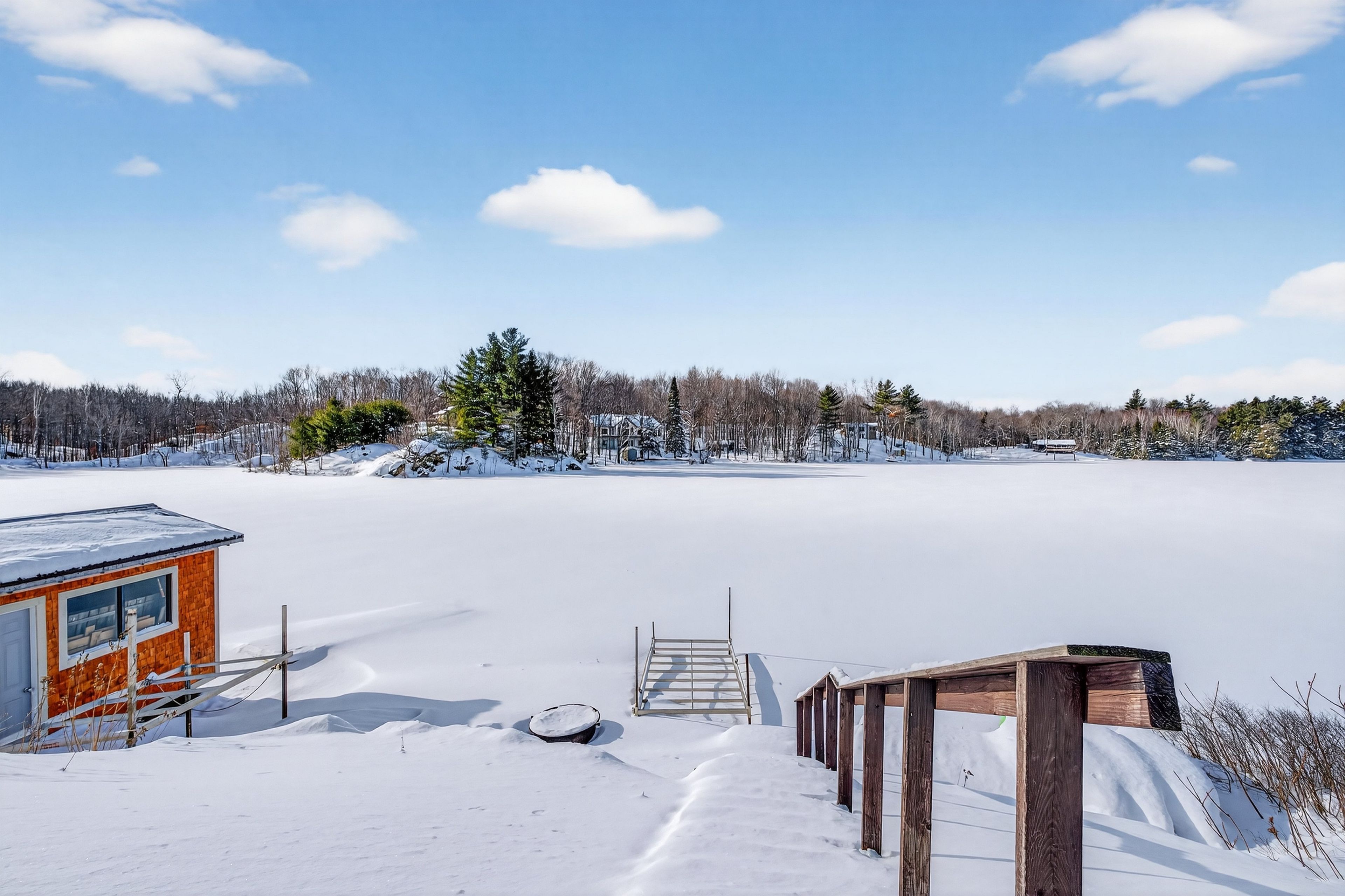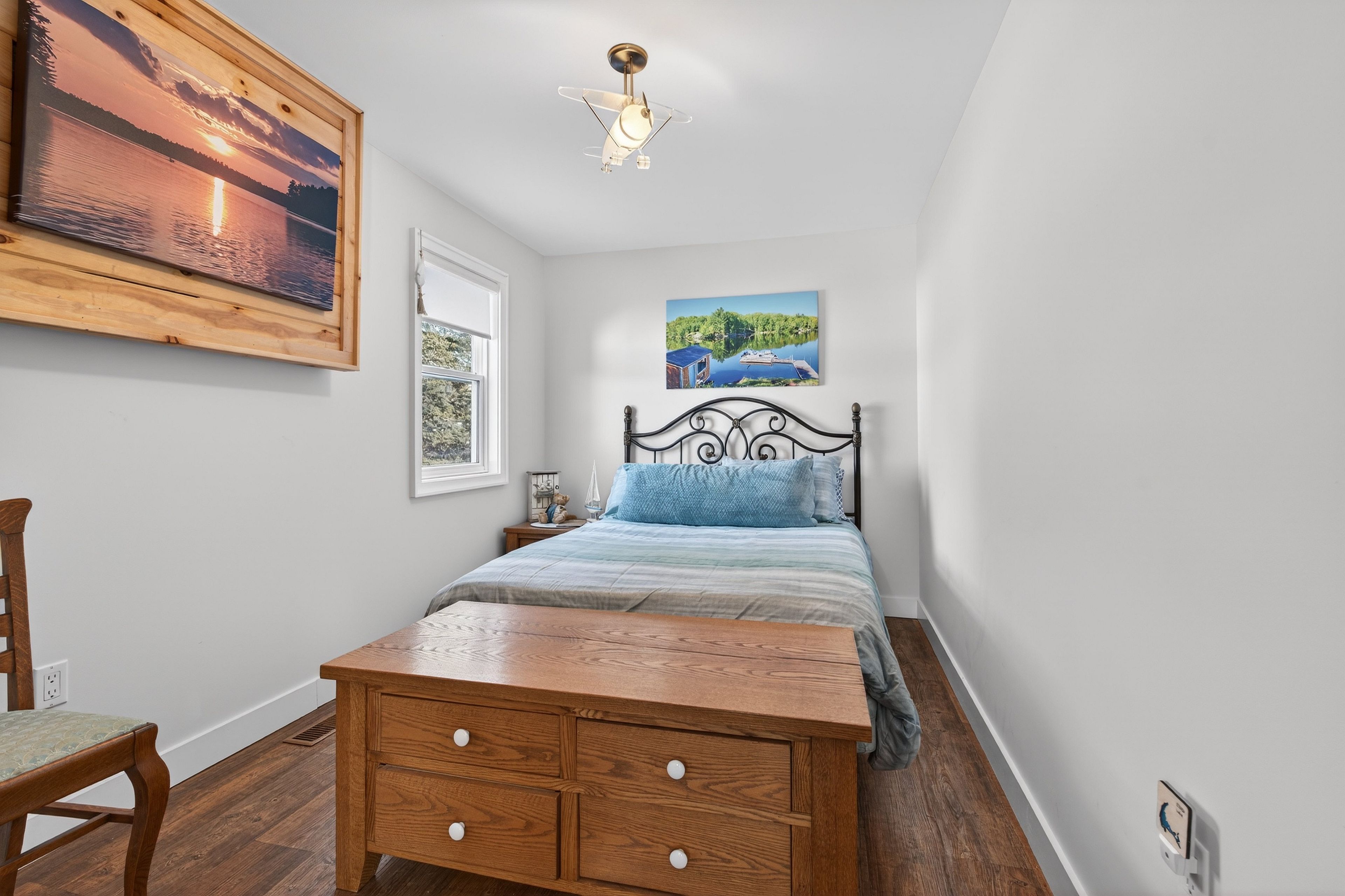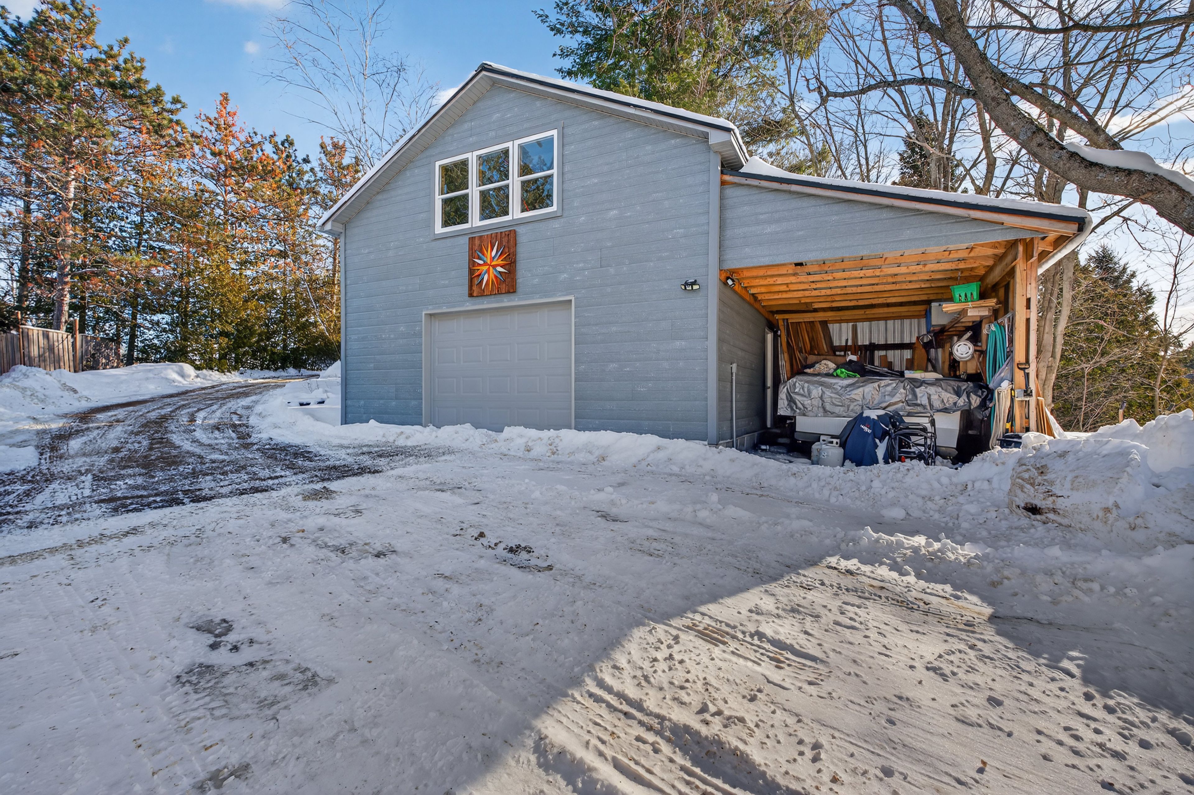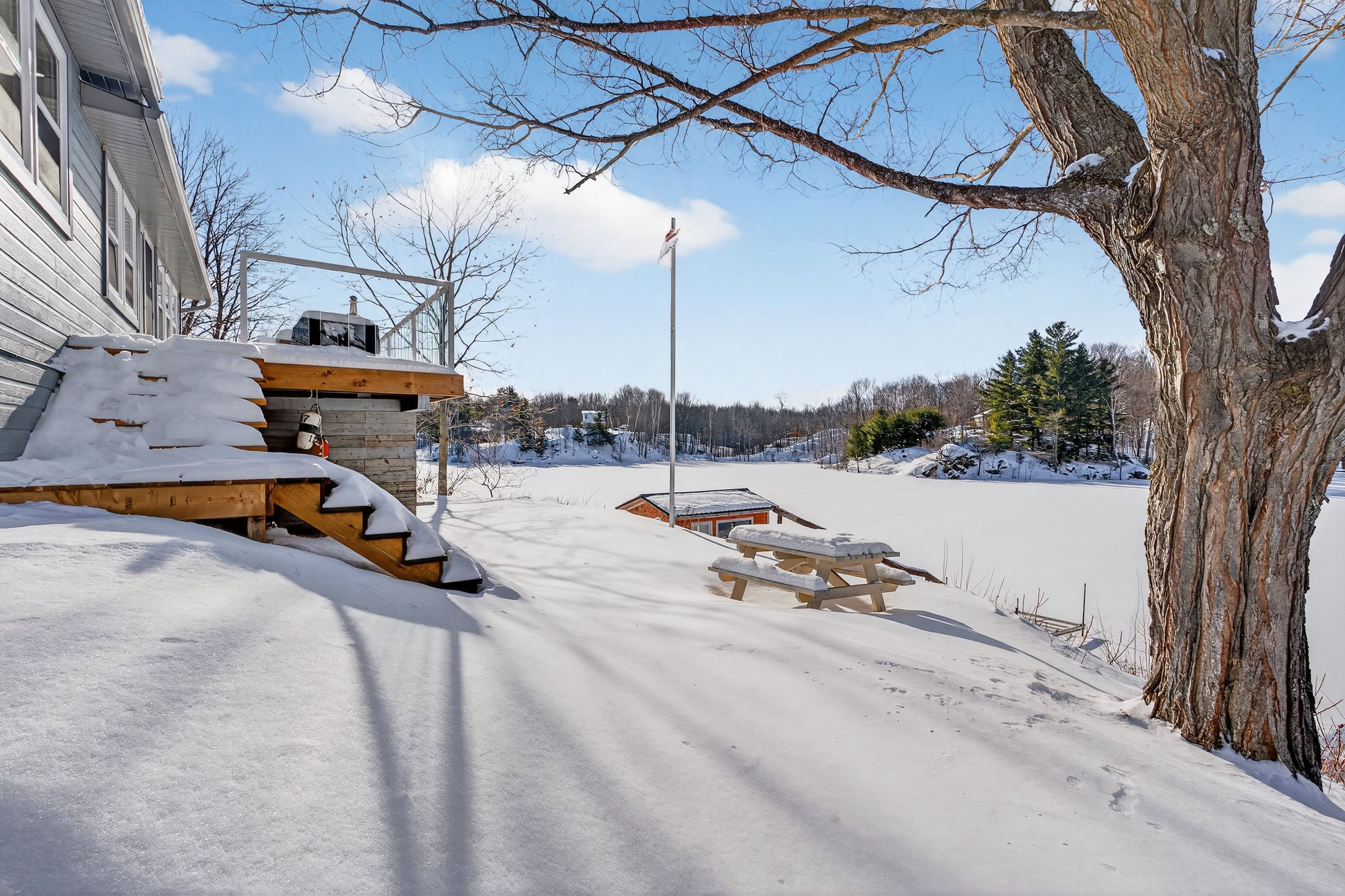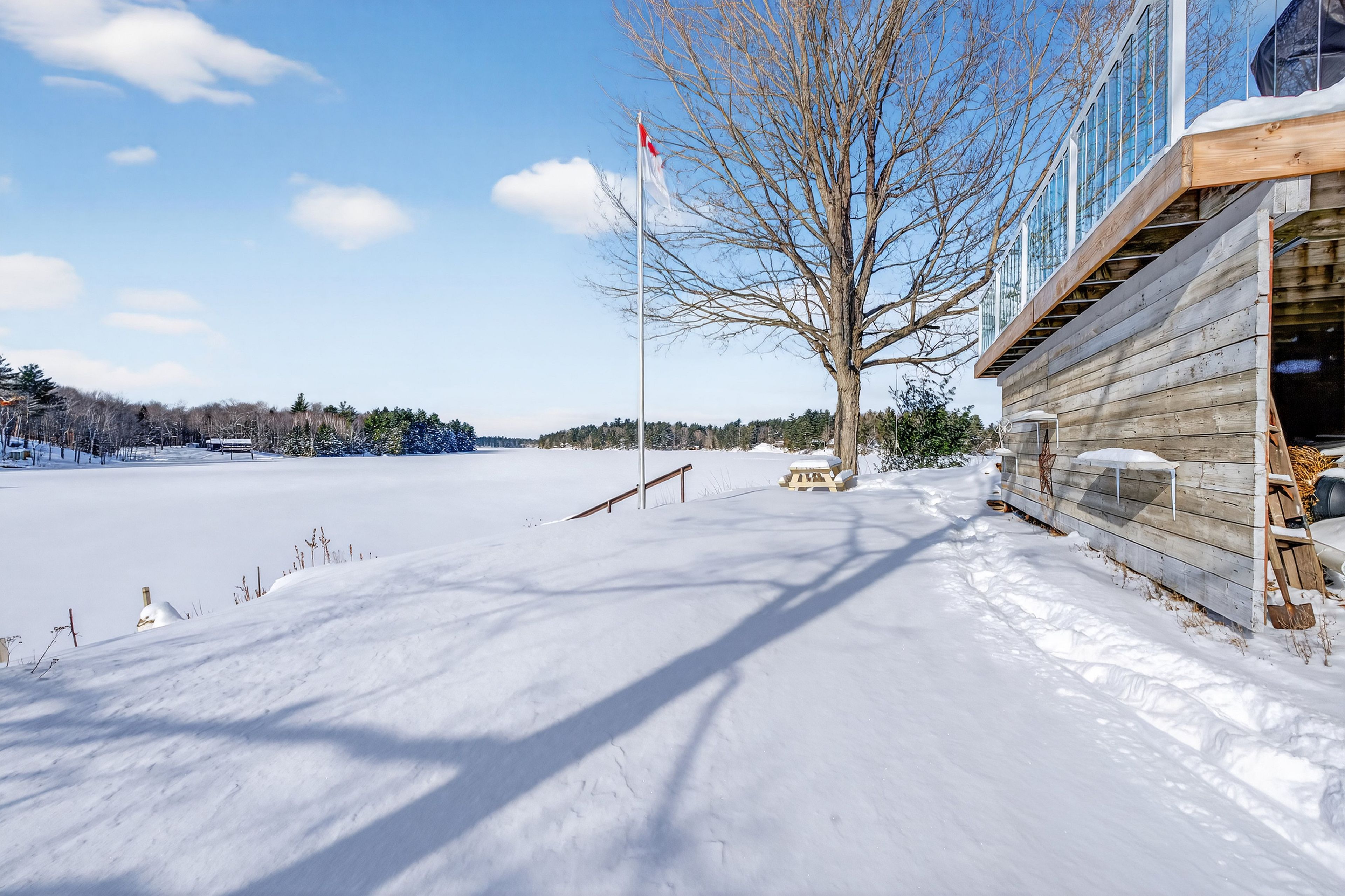 Welcome to year-round lake living on the tranquil shores of Elbow Lake, offering just over 180 feet of pristine waterfront with no public access-ensuring exceptional privacy, peaceful surroundings, outstanding fishing right off the dock, and unforgettable sunset views. This beautifully renovated bungalow is completely move-in ready and is complemented by an oversized detached two-car garage with an upper loft awaiting your finishing touches, plus an updated boathouse. Step inside to a generously sized mudroom, perfect for all seasons, which flows into a stunning sunroom featuring wraparound windows and patio doors that lead to a deck overlooking the water. The open-concept living and dining area is ideal for entertaining and seamlessly connects to a modern kitchen with elegant quartz countertops. The home offers a spacious Primary bedroom with a walk-in closet and 2-piece ensuite, a comfortable second bedroom, and a stylish 4-piece main bathroom. Conveniently located close to amenities, schools, and the popular K&P Trail, this exceptional property offers the perfect blend of comfort, convenience, and natural beauty-ready for you to settle in and start enjoying the very best of lakefront living.
