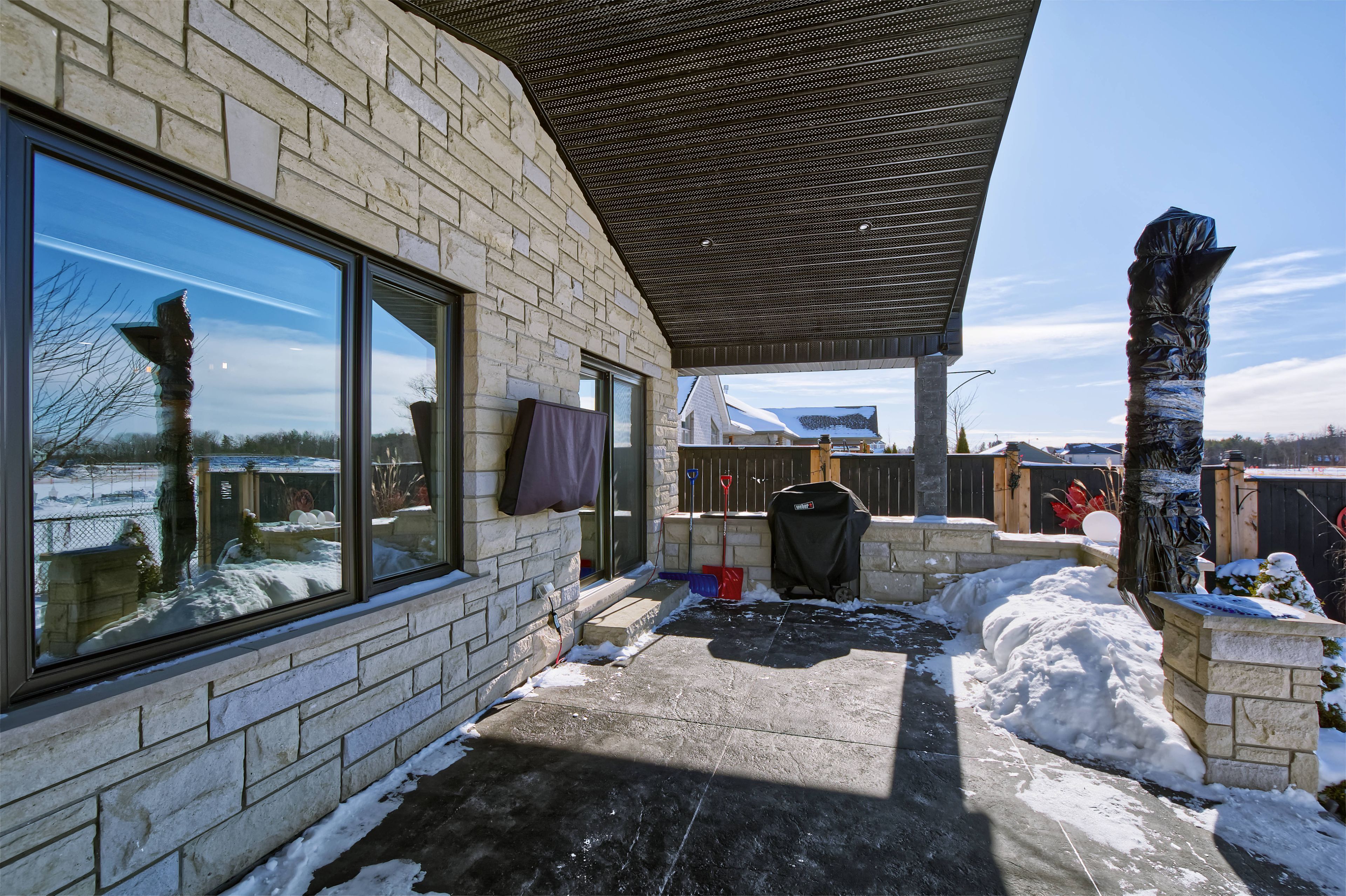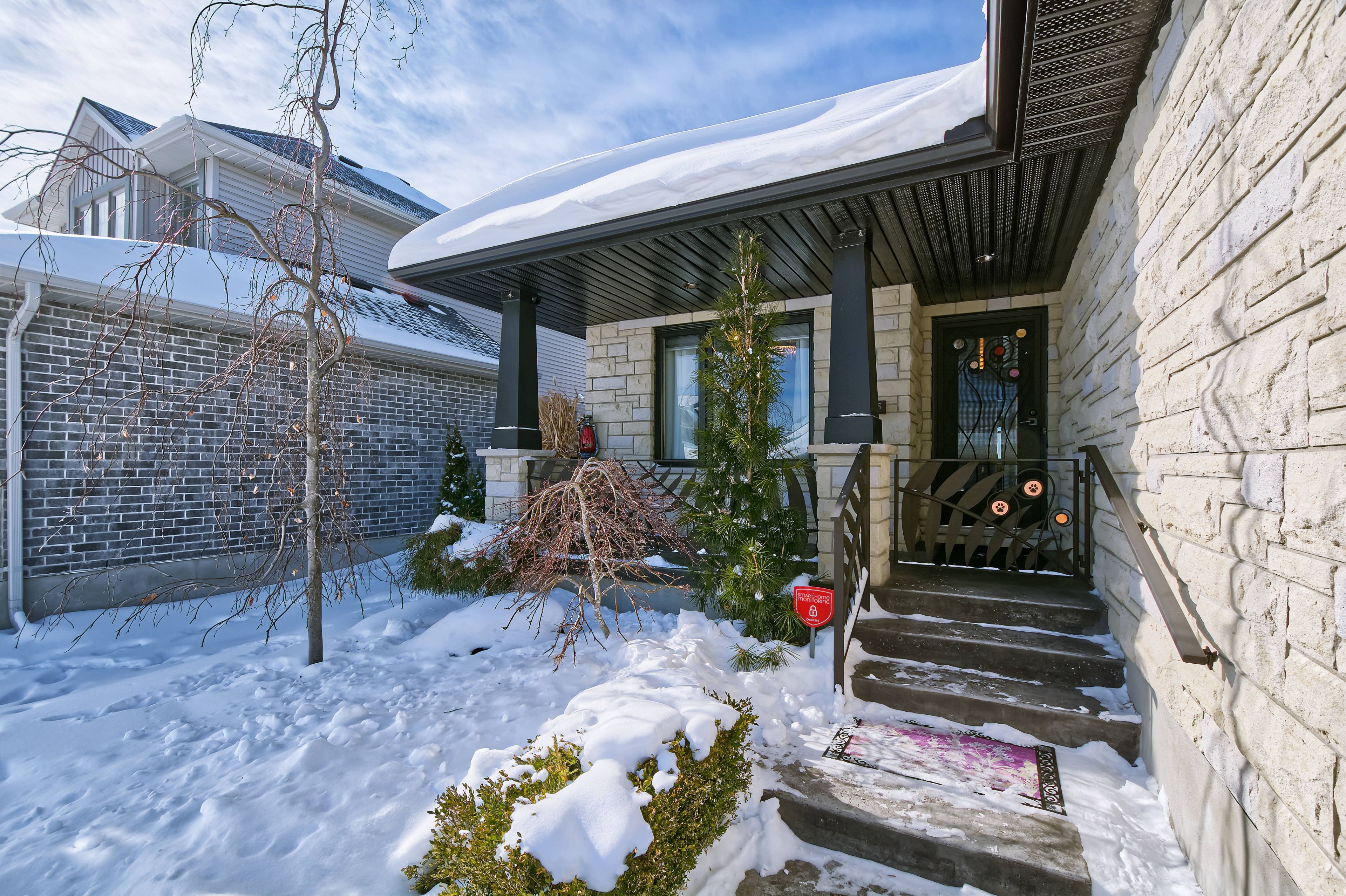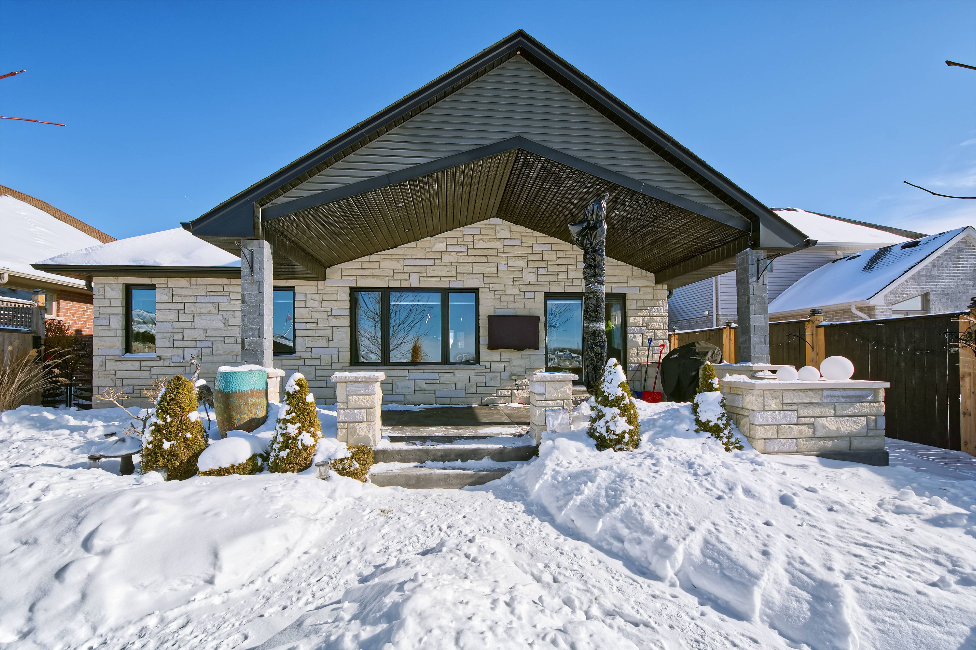 This stunning bungalow in sought after Shaw Valley is sure to impress. The curb appeal is exceptional featuring a beautiful stone exterior, custom wrought iron railings, professional landscaping and a concrete laneway with parking for 4. The heated double car garage has basement access into the home. The entrance has slate Versailles tile and wonderful sightlines through the home. The main level offers a well placed guest bedroom, custom full bathroom and a laundry with direct access to the garage. The bright open concept living area at the rear has amazing vistas of the backyard and greenspace and is anchored by a cozy fireplace perfect for daily living and entertaining. Enjoy a perfectly sized dining area plus a spacious kitchen with rich cherry cabinetry, stainless steel appliances, an over sized island and a corner pantry. Striking titanium black granite with dramatic black, gold, white veining and live edge finish is on the kitchen island, counters and fireplace mantle for a cohesive high end look. The luxurious finishes continue with walnut flooring, slate backsplash in the kitchen and on the fireplace, black hardware, island corbels and interior cabinet lighting. The breakfast nook includes a built in serving hutch with a bar fridge and patio access. More Upscale finishes include a curated lighting package including an Artika chandalier, Eglo Conrad fixtures, lovely pendant lighting all complemented by pot lights. Main level primary bedroom offers a peaceful retreat with tray ceilings, a walk in closet and exquisite private ensuite and bathrooms have gorgeous ceramic tile and Novatto Godere sinks. On lower level find a second fireplace on a custom feature wall, a third BDR and den/4th BDR all with large egress and custom window framing, and a tasteful 3pc bath with heat lamps. Amazing entertainer's dream backyard. Canopied stamped concrete patio and cooking area, built in BBQ and shed. Only 13 minutes to Port Stanley beaches, 15 minutes to 401