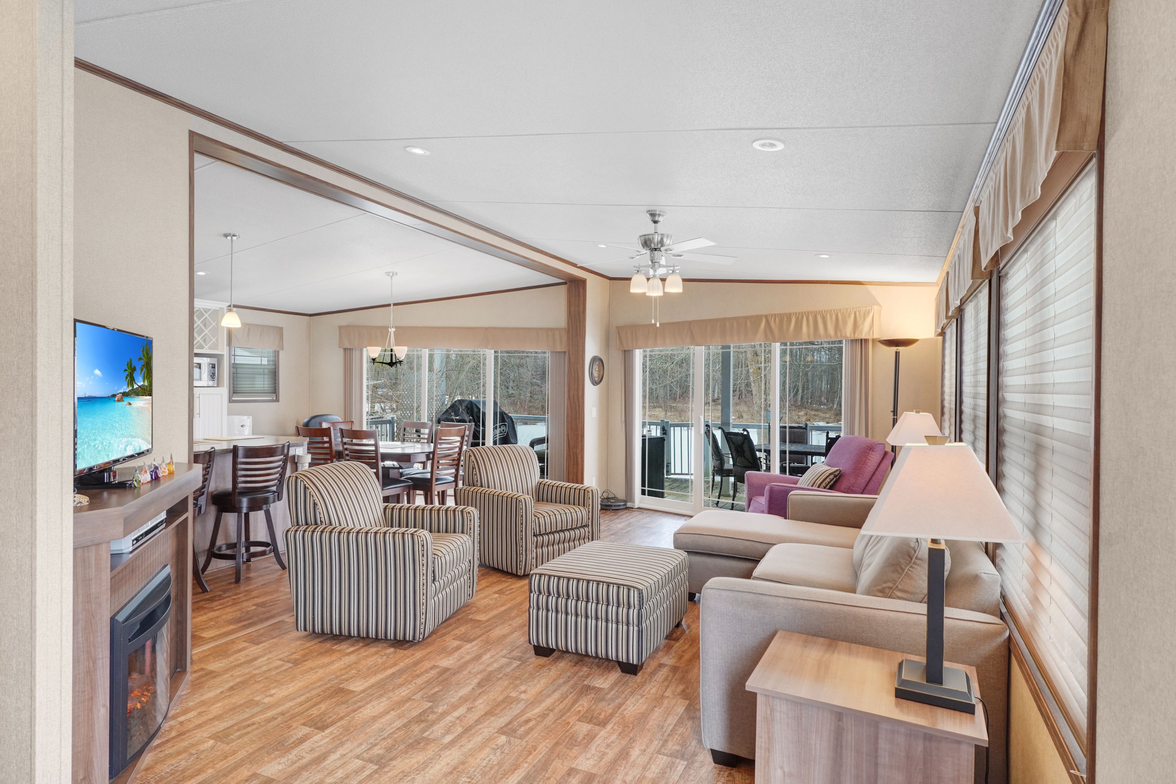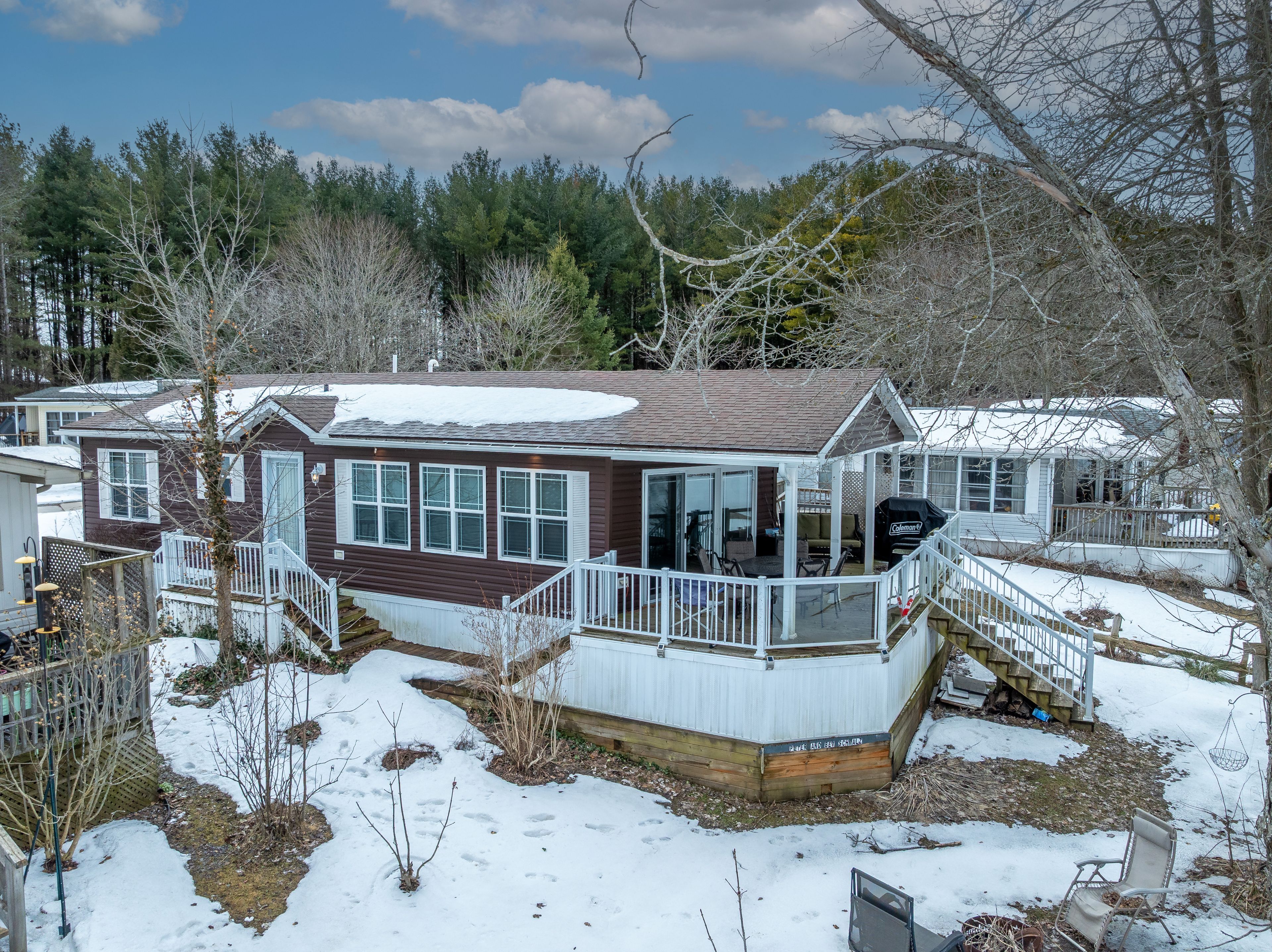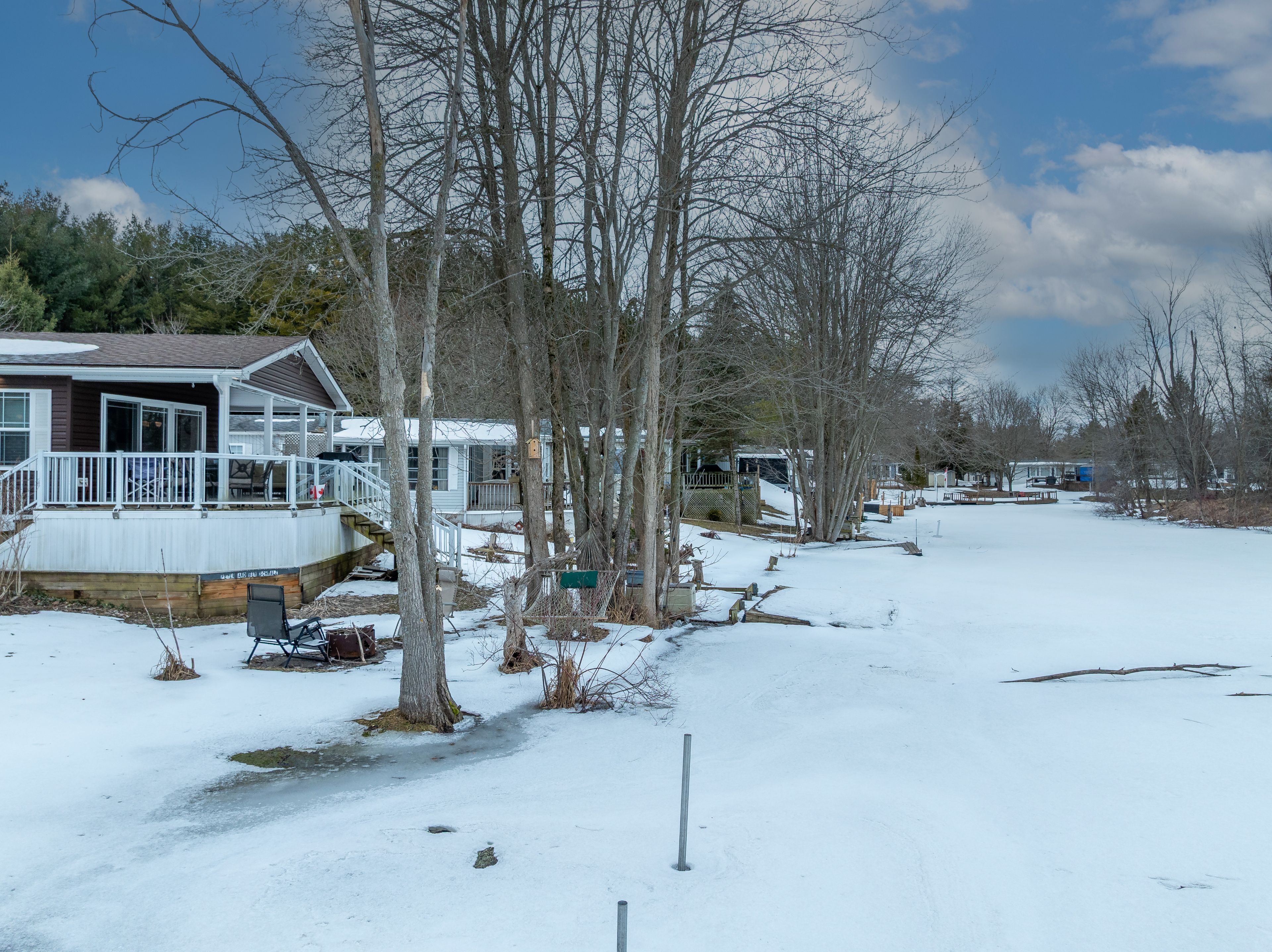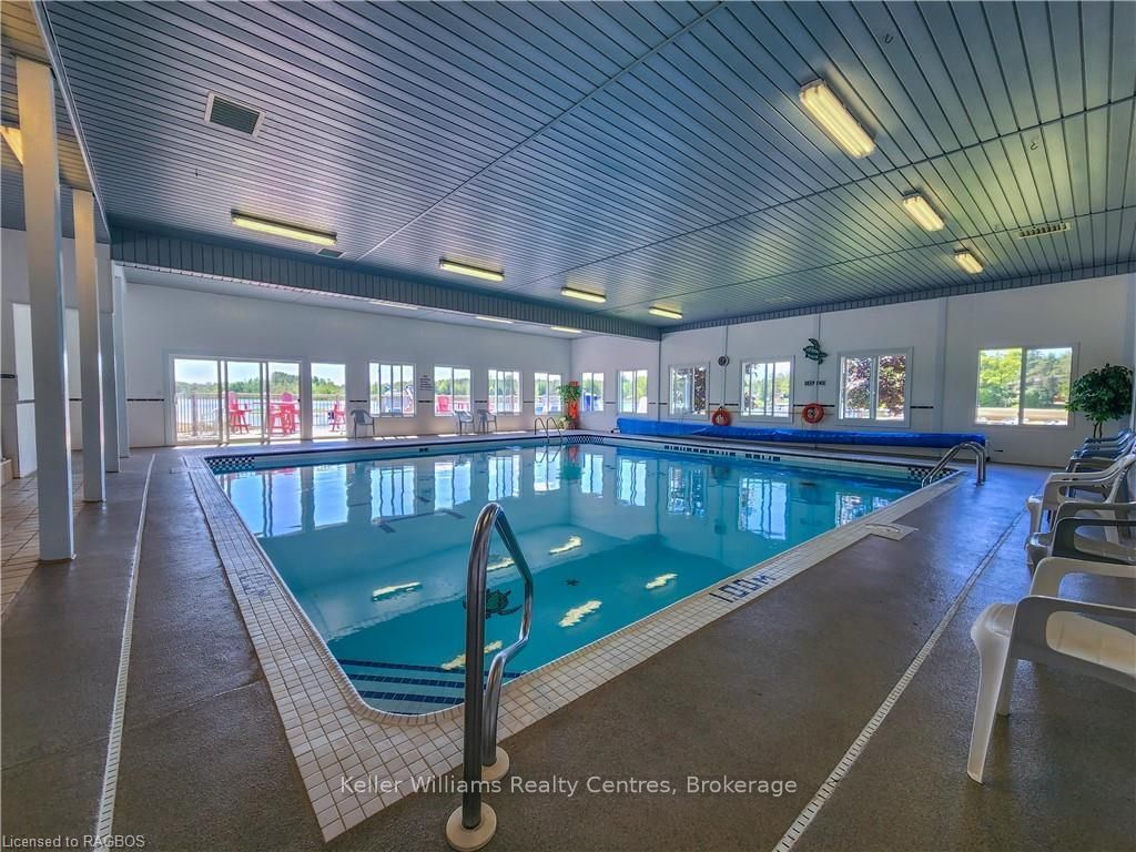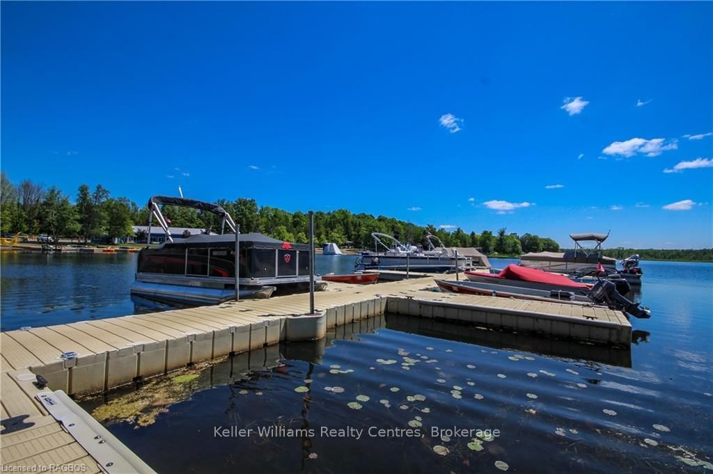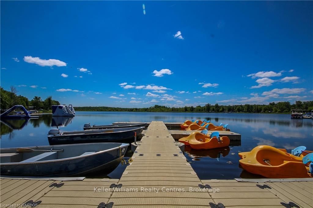 2026 park fees paid! This beautifully maintained 2016 Northlander Classic double wide park model offers exceptional direct waterfront living with a private dock in Fisherman's Cove, just minutes east of Kincardine. Situated on a private spring fed lake, it is only about 30 minutes from Port Elgin and the shores of Lake Huron.The spacious interior features two equal sized bedrooms, each with generous walk in closets. The master bedroom includes a private ensuite bathroom for added convenience. The open concept living and dining area is bright and inviting, highlighted by impressive full width (24') sliding glass doors that provide stunning panoramic water views and seamless access to a matching full width deck perfect for outdoor entertaining or simply relaxing by the water.The well equipped kitchen boasts modern stainless steel appliances, a large island with double sink, and ample counter space. Warm wood cabinetry and neutral tones create a welcoming cottage atmosphere throughout. Additional features include a second full bathroom and practical storage solutions.Ideal as a seasonal family retreat, this turnkey waterfront home combines comfort, style, and unbeatable lake access in a popular resort community with amenities including a beach, pools, and more. A rare opportunity-contact us today to schedule a private viewing!