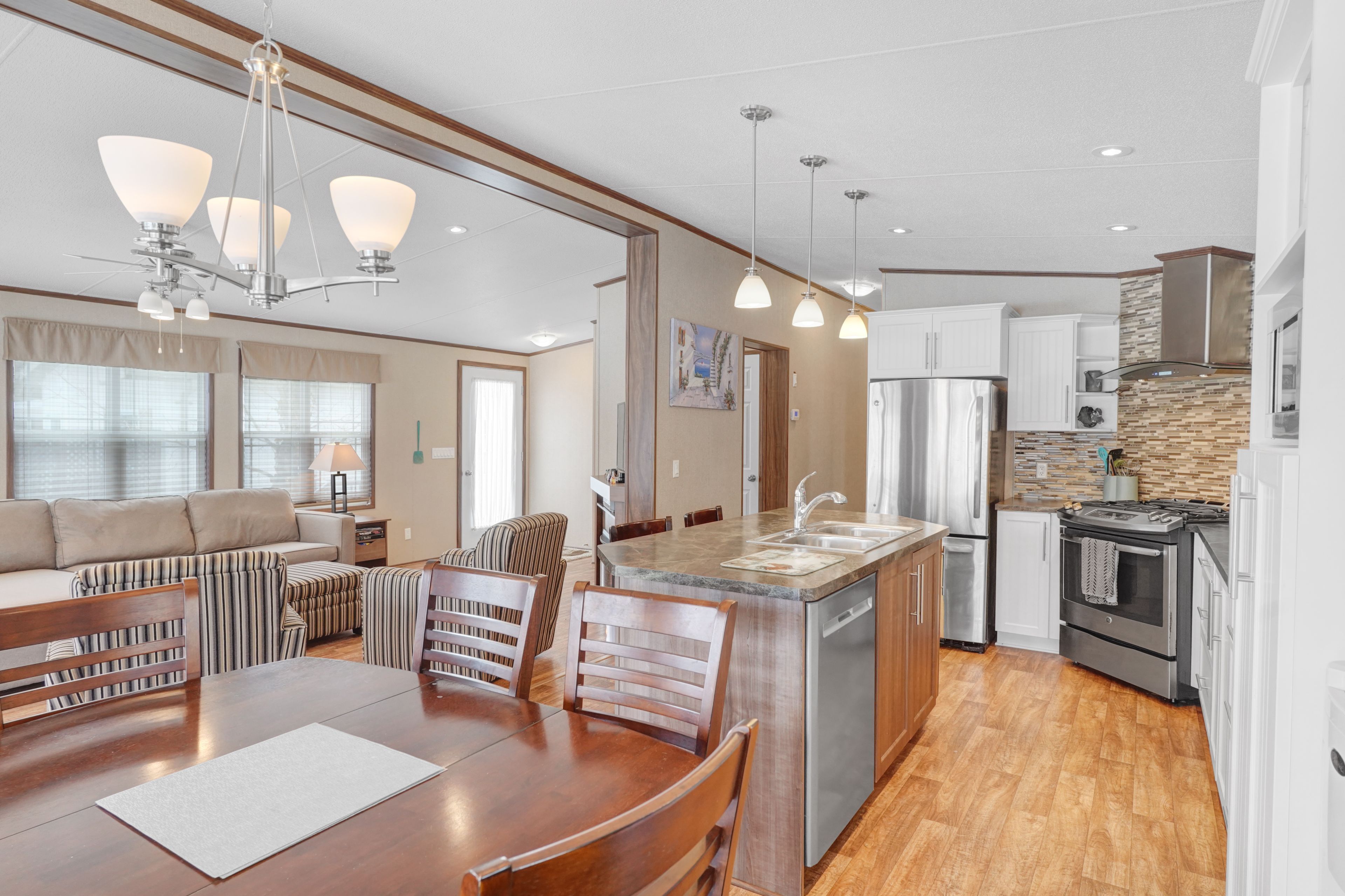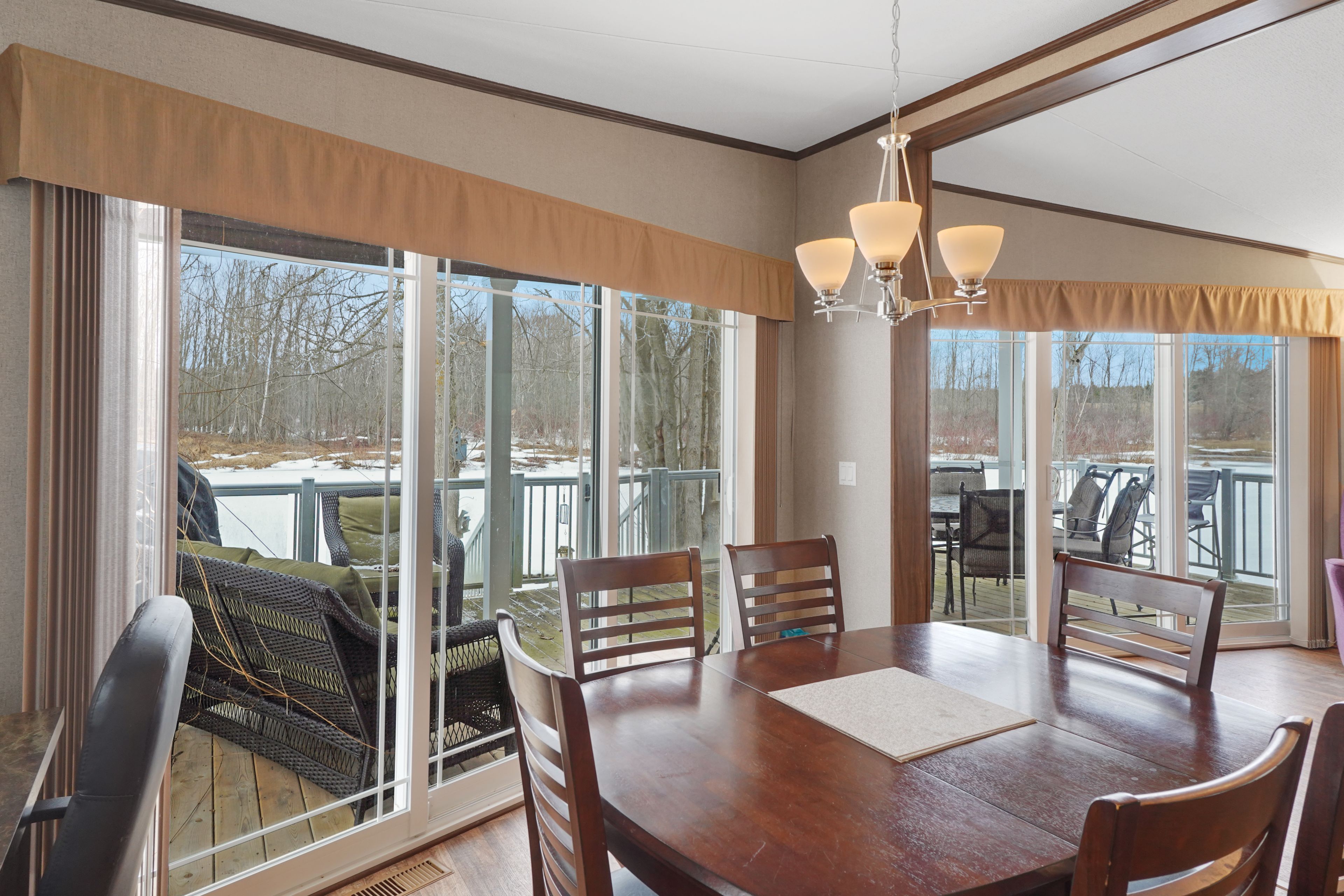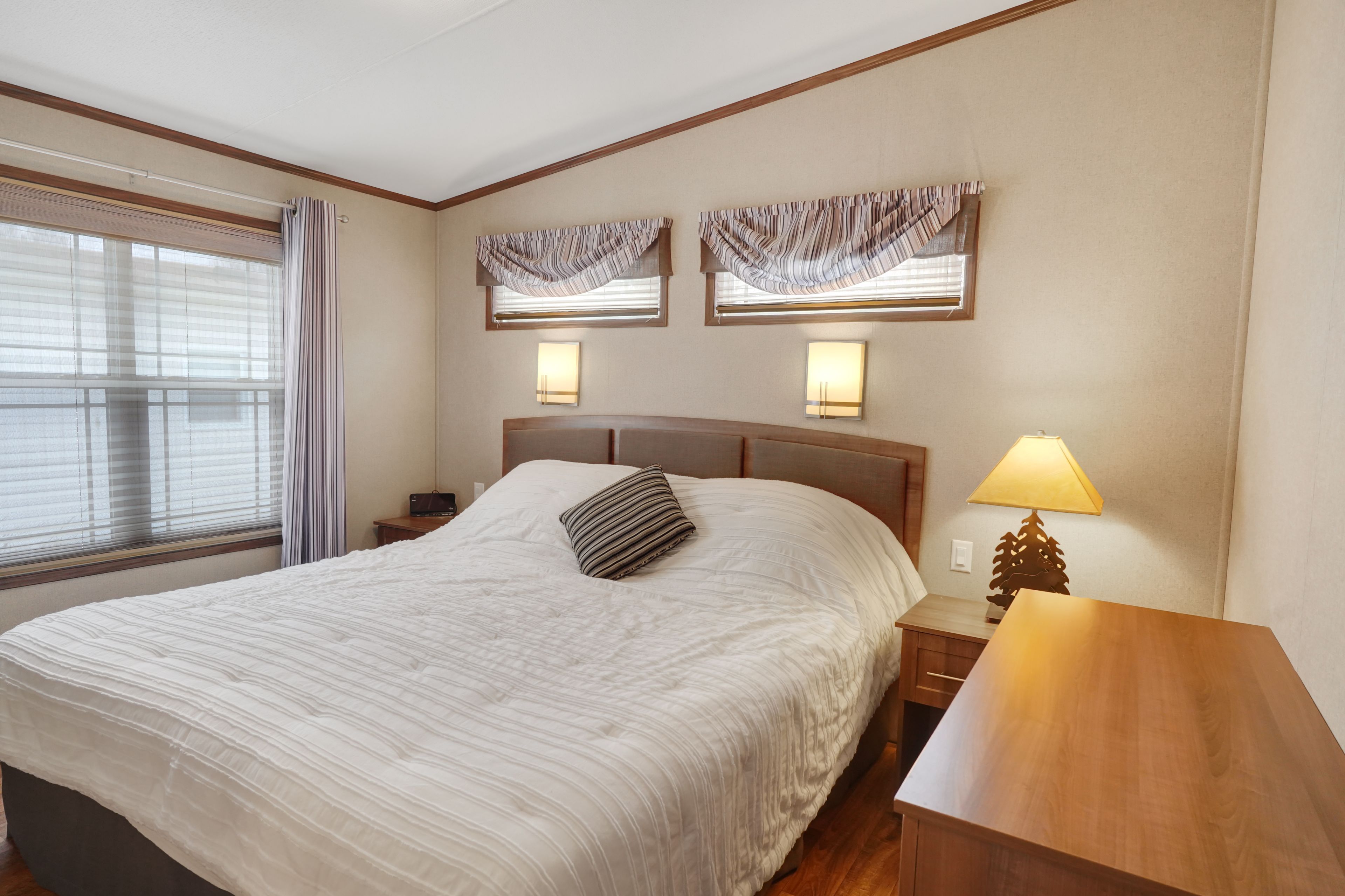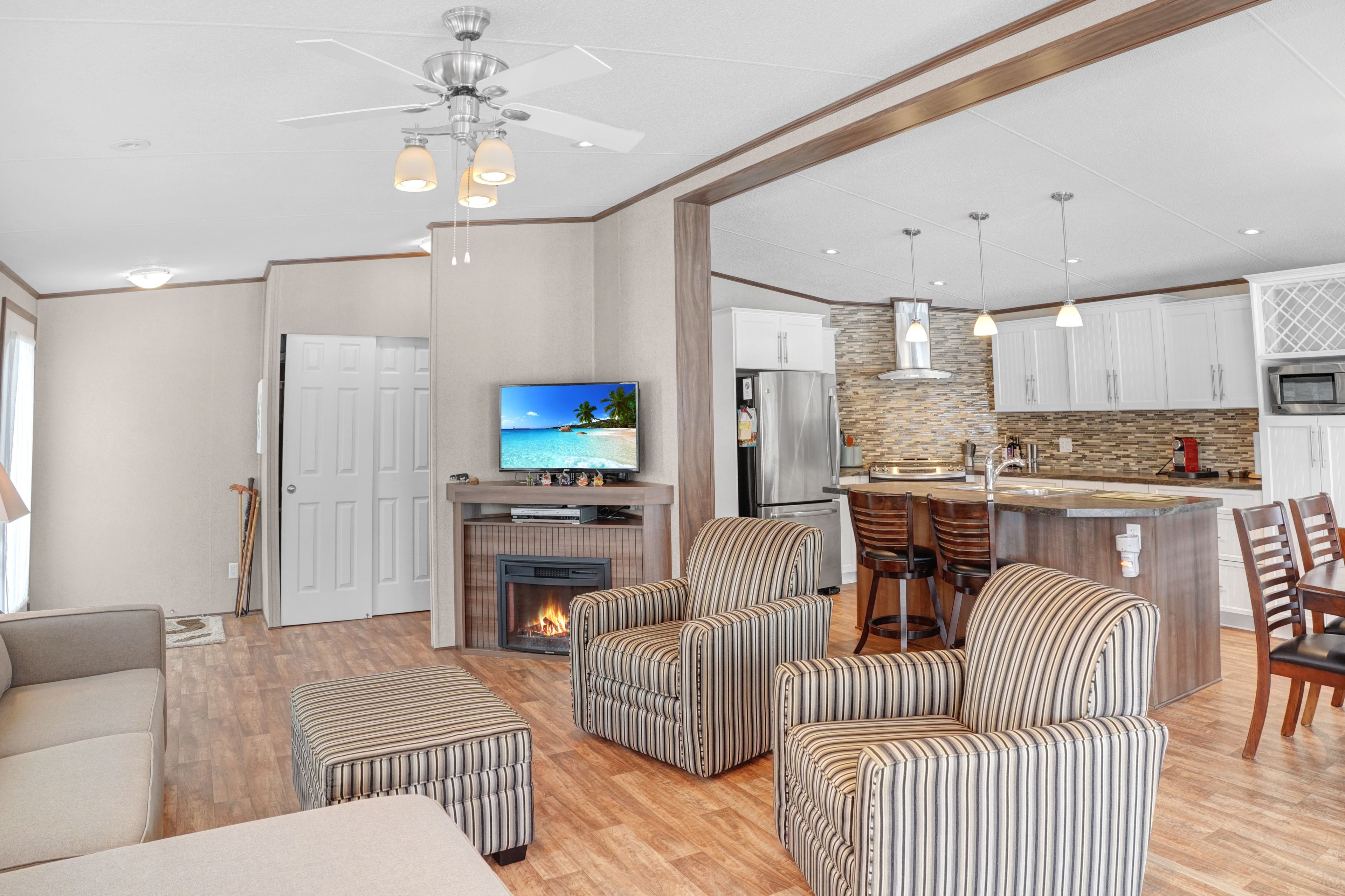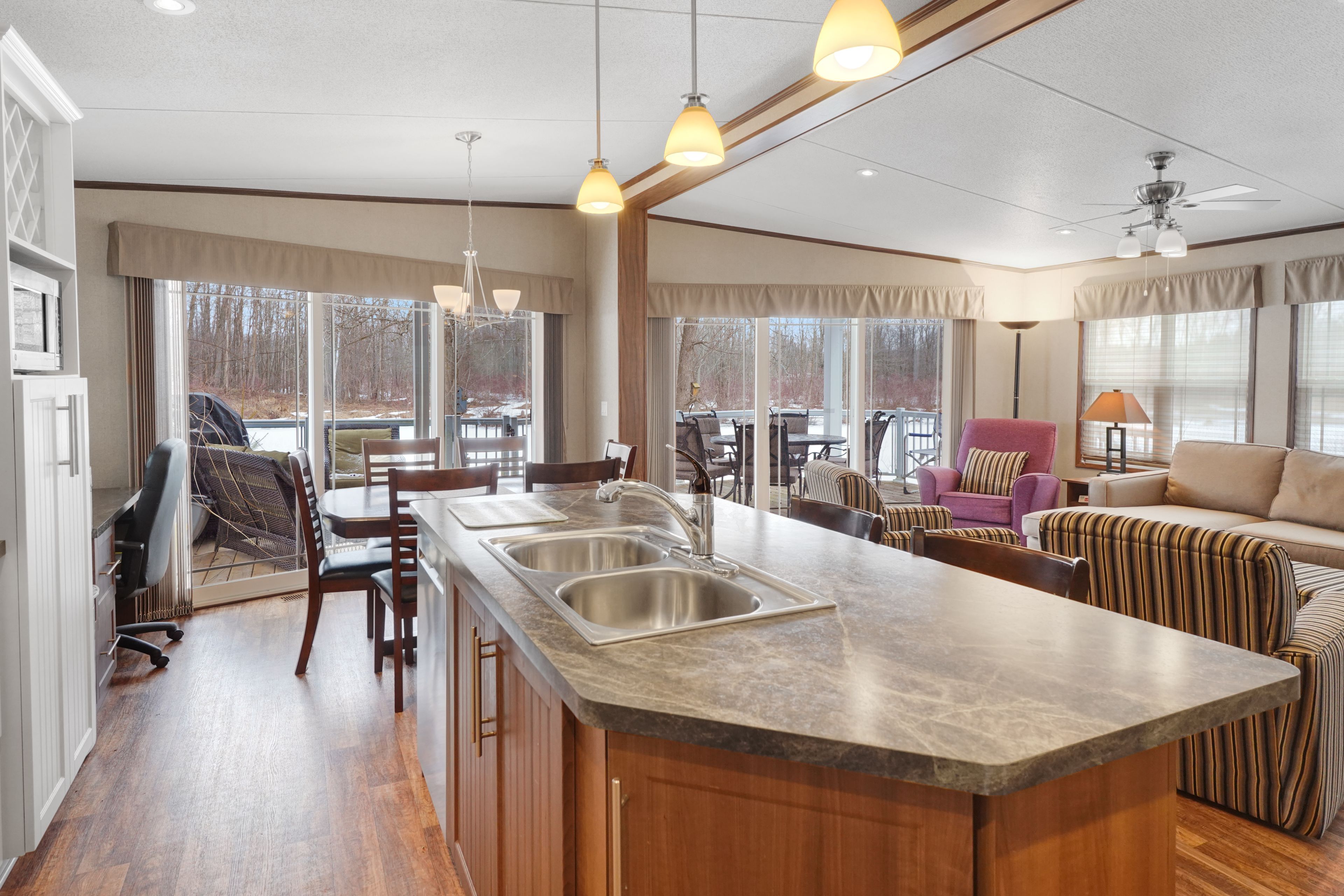 2026 park fees paid! This beautifully maintained 2016 Northlander Classic double wide park model offers exceptional direct waterfront living with a private dock in Fisherman's Cove, just minutes east of Kincardine. Situated on a private spring fed lake, it is only about 30 minutes from Port Elgin and the shores of Lake Huron.The spacious interior features two equal sized bedrooms, each with generous walk in closets. The master bedroom includes a private ensuite bathroom for added convenience. The open concept living and dining area is bright and inviting, highlighted by impressive full width (24') sliding glass doors that provide stunning panoramic water views and seamless access to a matching full width deck perfect for outdoor entertaining or simply relaxing by the water.The well equipped kitchen boasts modern stainless steel appliances, a large island with double sink, and ample counter space. Warm wood cabinetry and neutral tones create a welcoming cottage atmosphere throughout. Additional features include a second full bathroom and practical storage solutions.Ideal as a seasonal family retreat, this turnkey waterfront home combines comfort, style, and unbeatable lake access in a popular resort community with amenities including a beach, pools, and more. A rare opportunity-contact us today to schedule a private viewing!