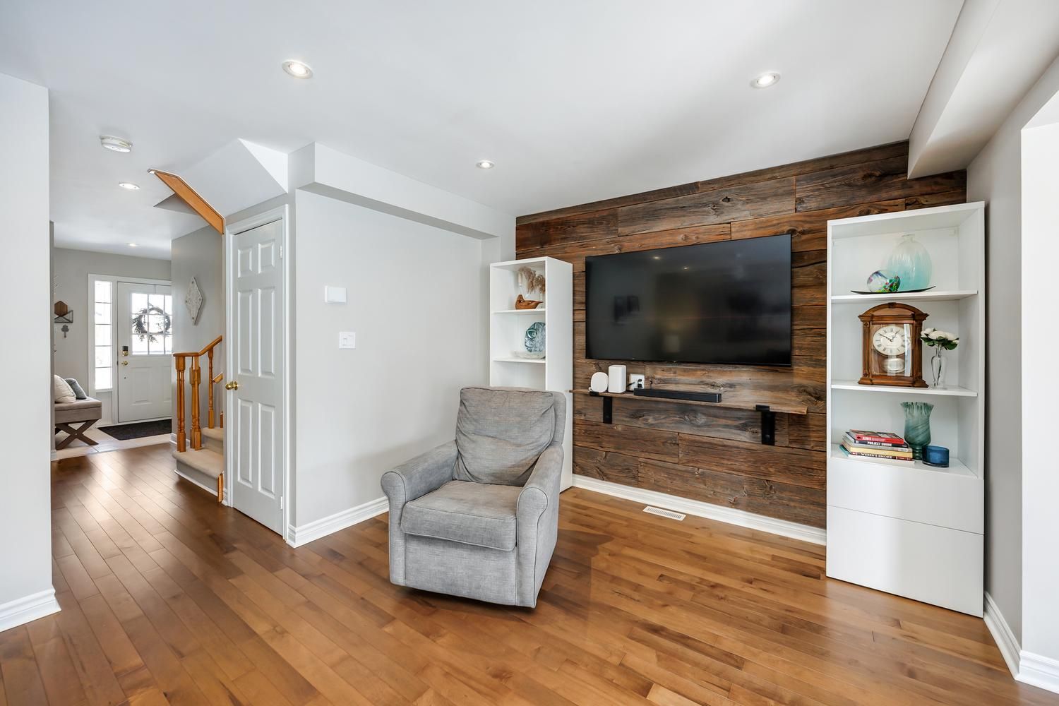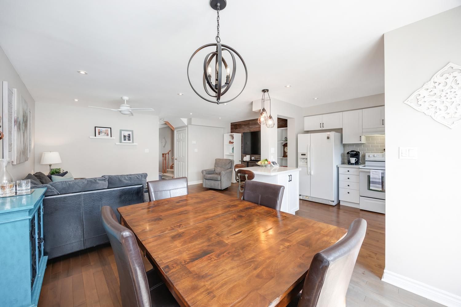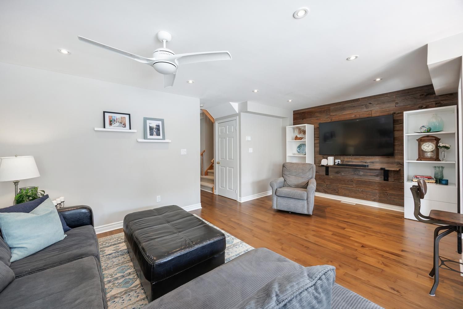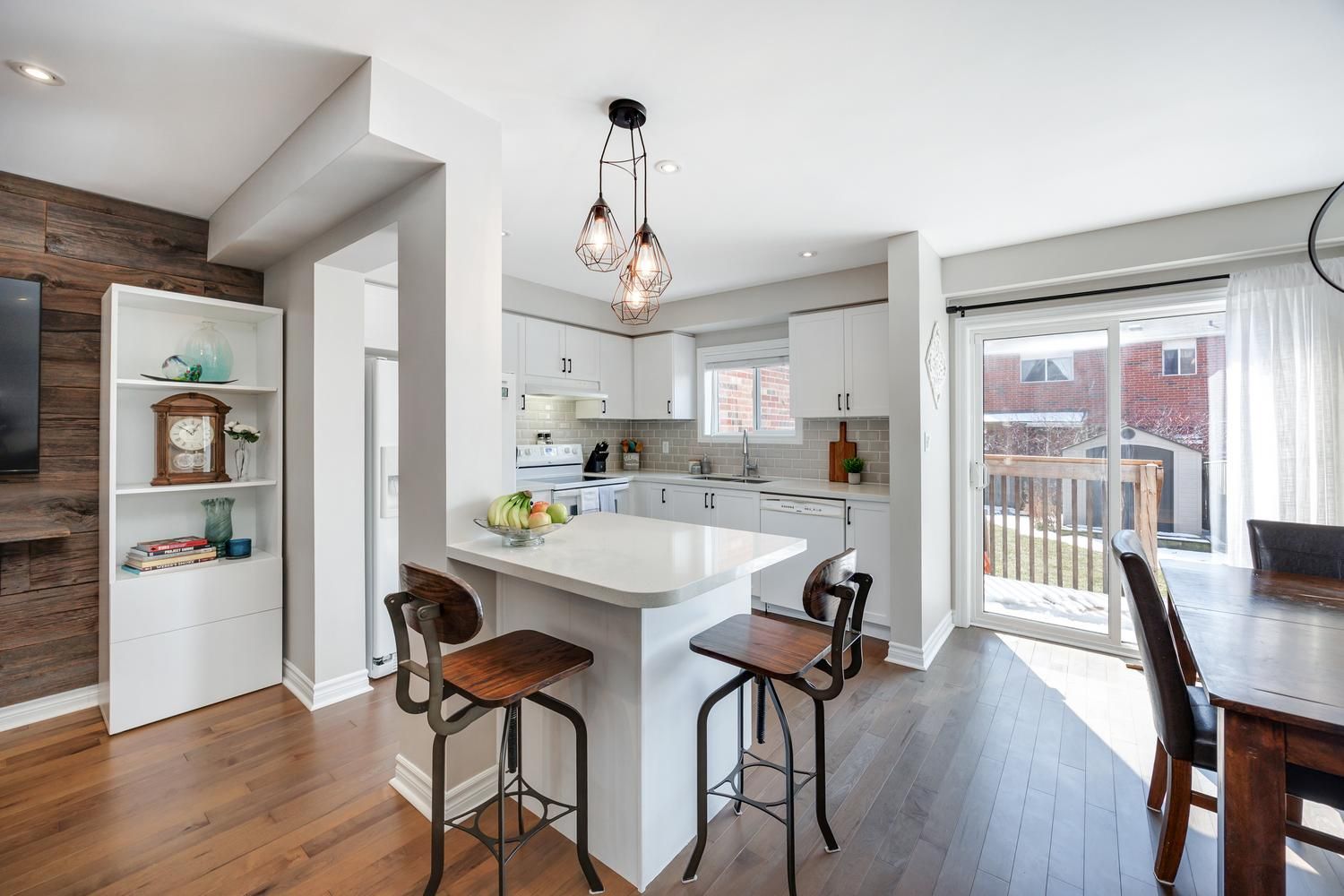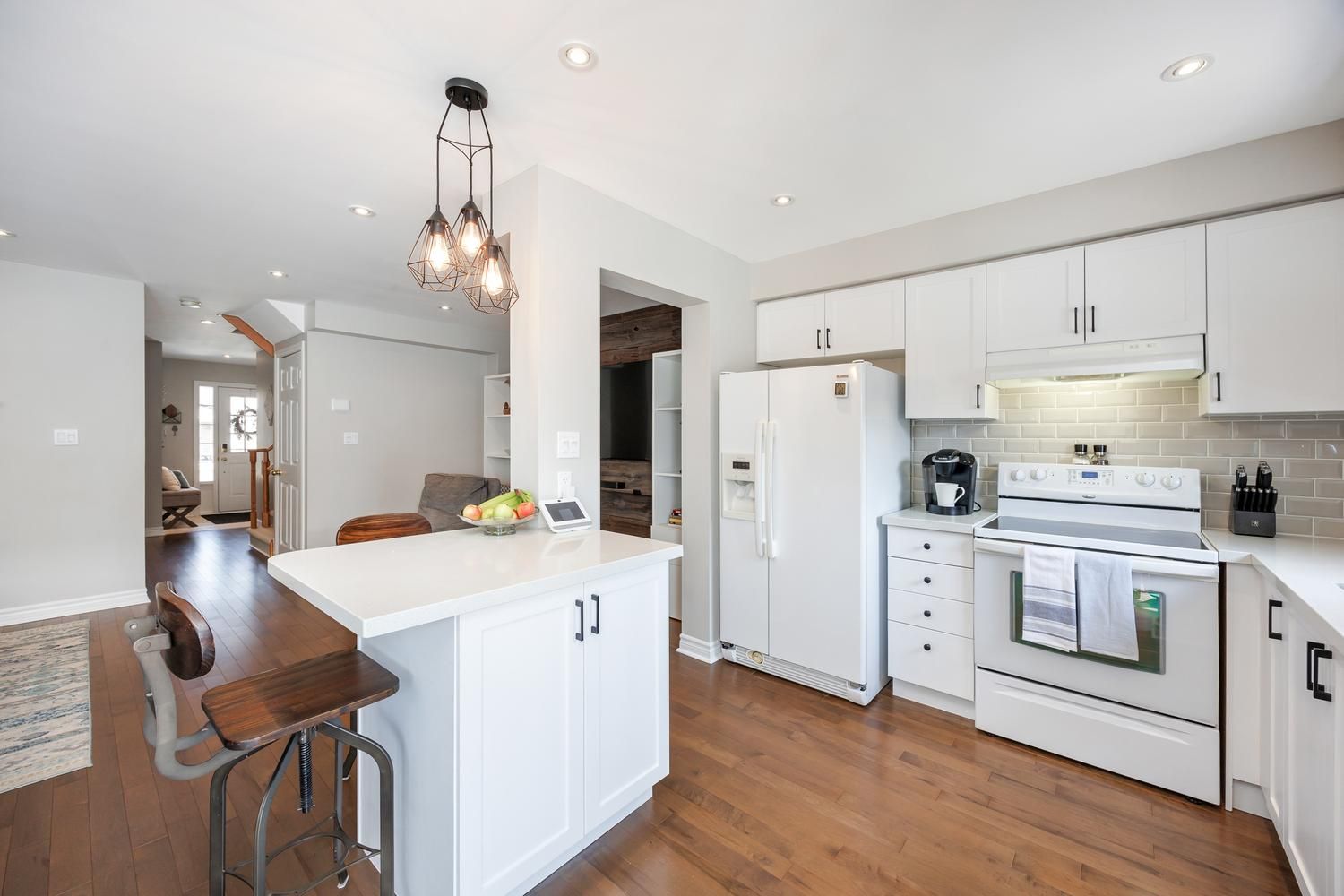 Come and check out this beautiful townhome, with great curb appeal, in a sought-after family-friendly neighbourhood, in south-east Ajax - you won't be disappointed! Convenient to both the 401, the 407, and the GO Train, for your commuting needs. This home exudes pride of ownership at every turn, as it has been tastefully upgraded and lovingly maintained by the current owners. Features include maple hardwood floors throughout the main level, a stylish barnboard feature wall in the living room, pot lights, new white kitchen with shaker style cabinets and classic black hardware, quartz counters, and a convenient sit-up island. Upgraded lighting fixtures throughout. The bright and spacious primary bedroom features a 4 piece ensuite bathroom, roomy his and her closets, 3 oversize windows, and an electric fireplace. Both of the other bedrooms are a generous size, one having a walk-in closet. The sliding glass door walk-out from the dining room opens up to a newer deck and a spacious paver stone patio for those great summer get togethers. Enjoy the additional living space that the professionally finished basement space provides for your family's needs, including pot lights, newer, durable carpet and a cozy electric fireplace! Your nicely fenced backyard will be the envy of the neighbourhood, with its lush green grass, and perennial gardens, thanks to the inground irrigation system. Convenient garden shed for your outdoor storage needs. Walking distance to several schools. Convenient access to most amenities, shopping, restaurants and parks.