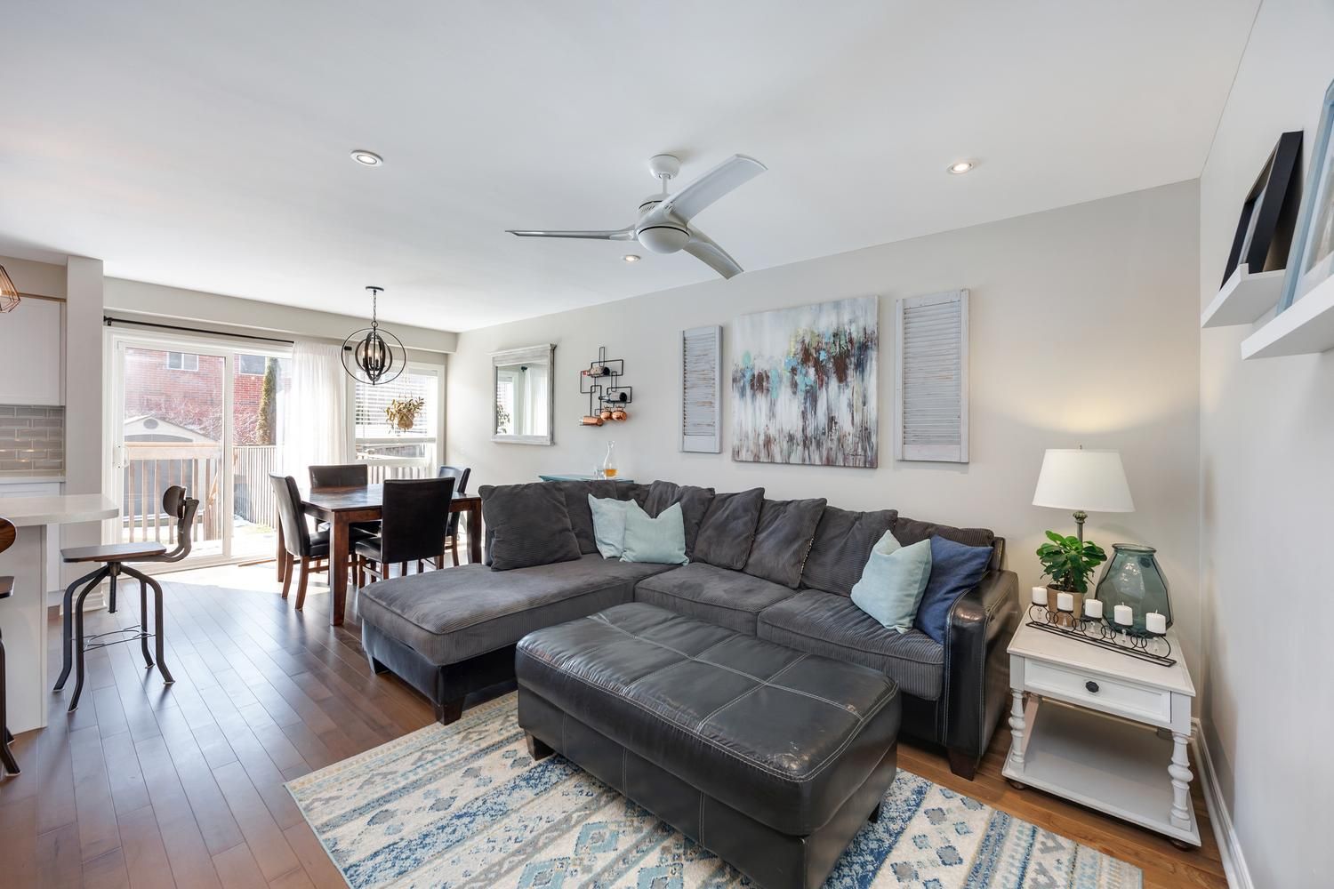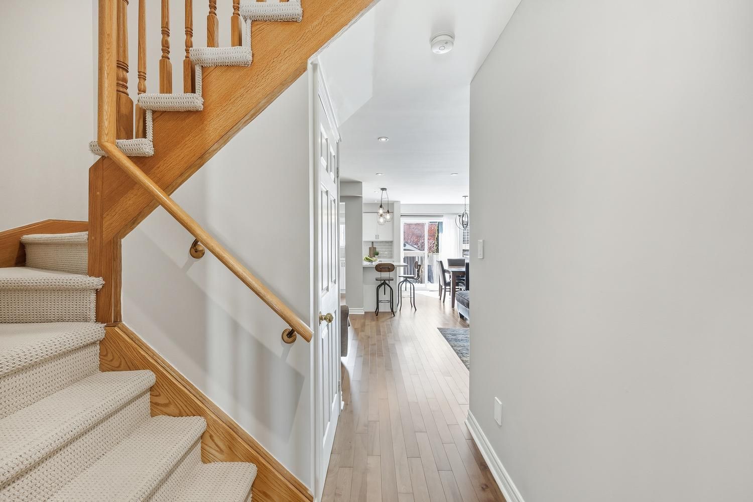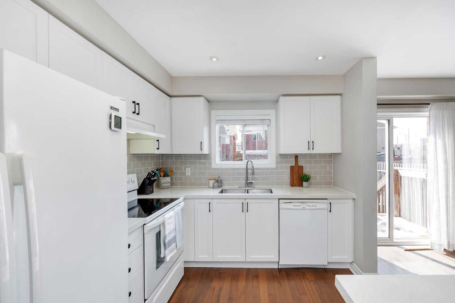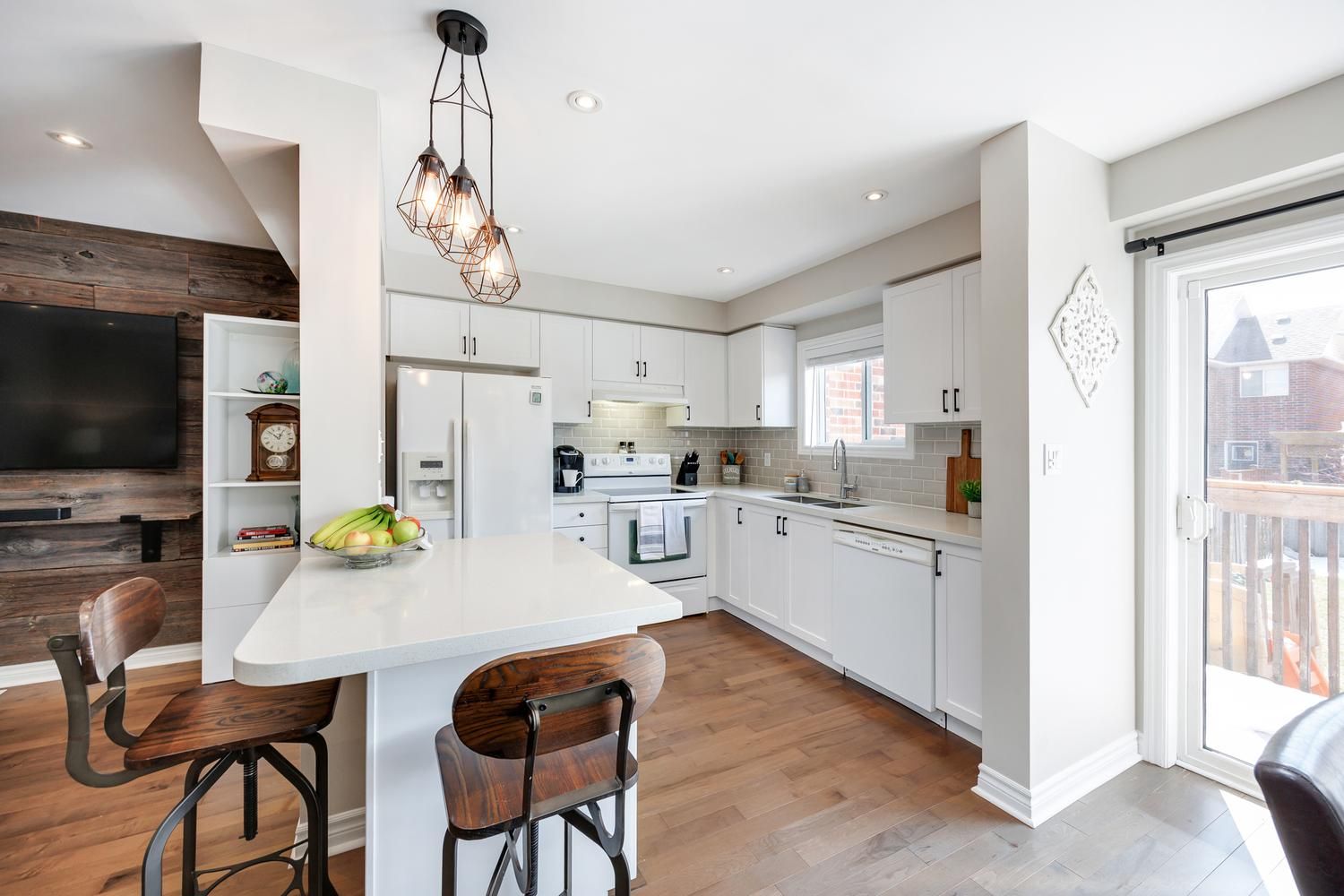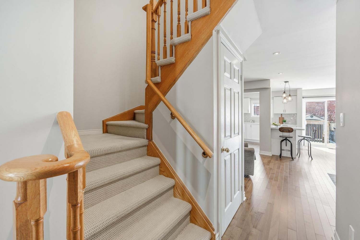 Come and check out this beautiful townhome, with great curb appeal, in a sought-after family-friendly neighbourhood, in south-east Ajax - you won't be disappointed! Convenient to both the 401, the 407, and the GO Train, for your commuting needs. This home exudes pride of ownership at every turn, as it has been tastefully upgraded and lovingly maintained by the current owners. Features include maple hardwood floors throughout the main level, a stylish barnboard feature wall in the living room, pot lights, new white kitchen with shaker style cabinets and classic black hardware, quartz counters, and a convenient sit-up island. Upgraded lighting fixtures throughout. The bright and spacious primary bedroom features a 4 piece ensuite bathroom, roomy his and her closets, 3 oversize windows, and an electric fireplace. Both of the other bedrooms are a generous size, one having a walk-in closet. The sliding glass door walk-out from the dining room opens up to a newer deck and a spacious paver stone patio for those great summer get togethers. Enjoy the additional living space that the professionally finished basement space provides for your family's needs, including pot lights, newer, durable carpet and a cozy electric fireplace! Your nicely fenced backyard will be the envy of the neighbourhood, with its lush green grass, and perennial gardens, thanks to the inground irrigation system. Convenient garden shed for your outdoor storage needs. Walking distance to several schools. Convenient access to most amenities, shopping, restaurants and parks.