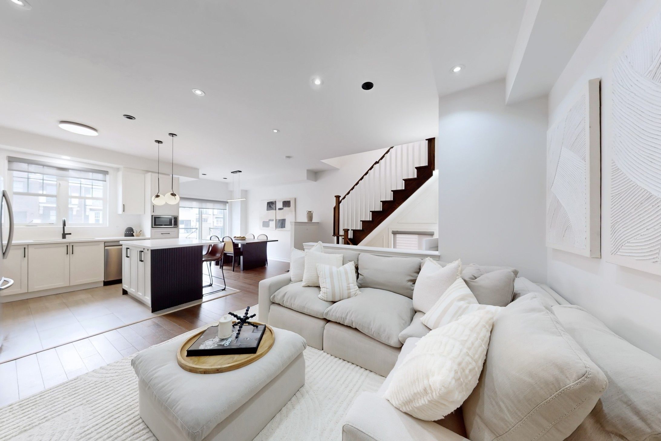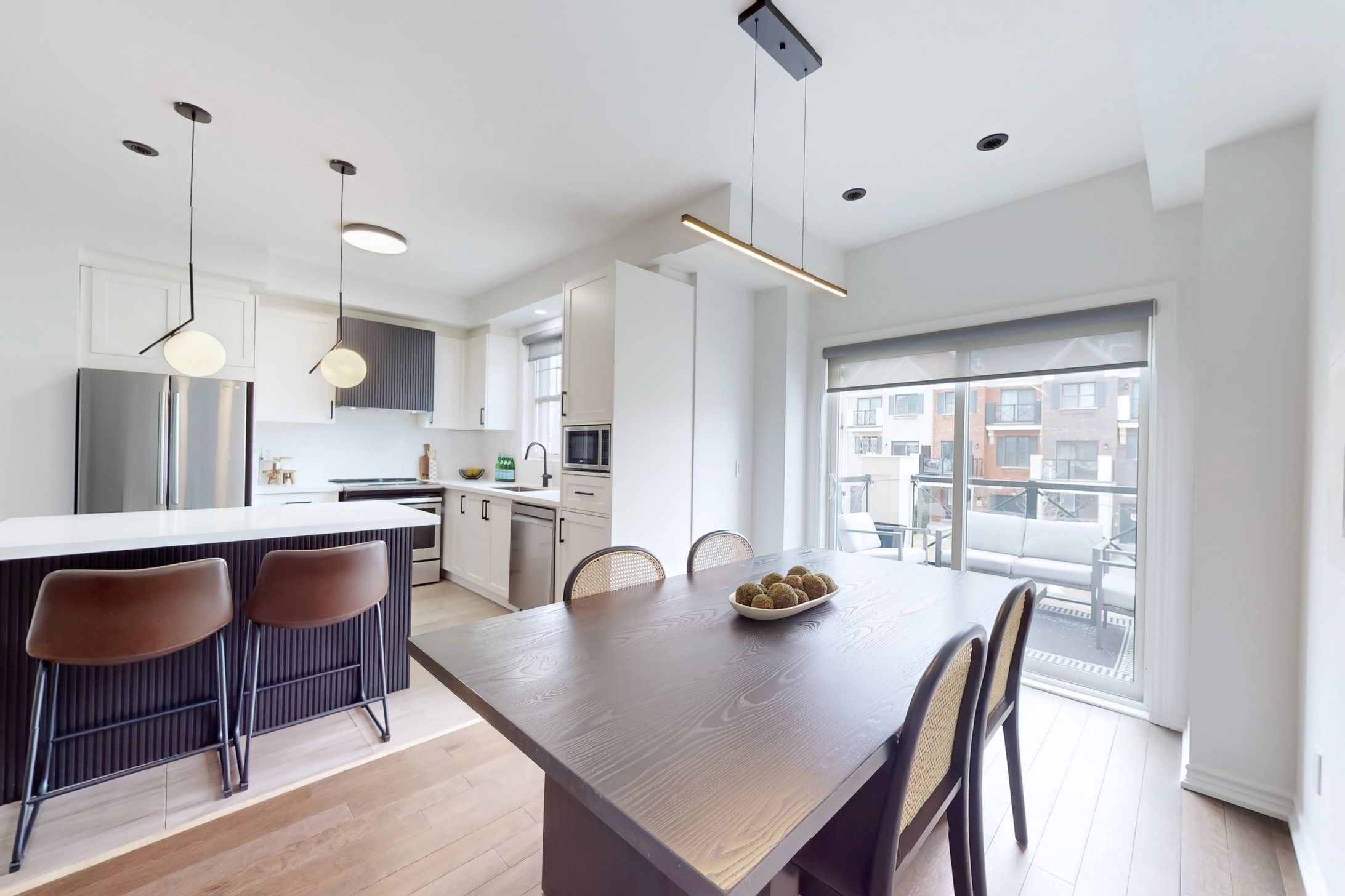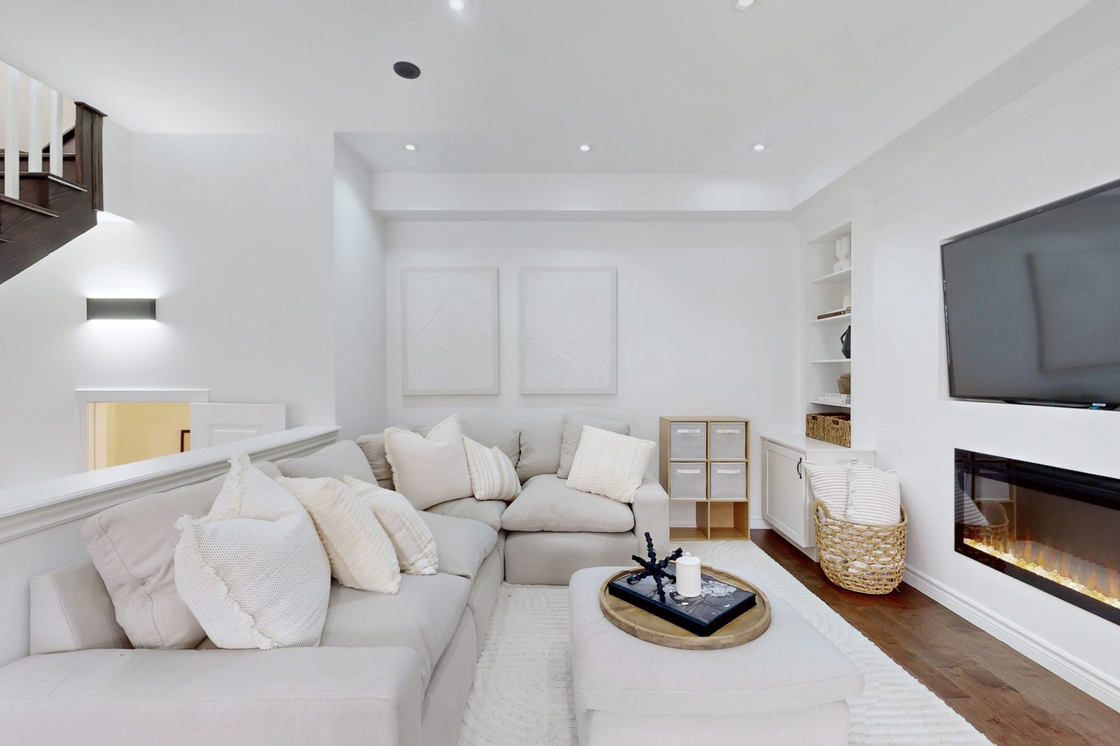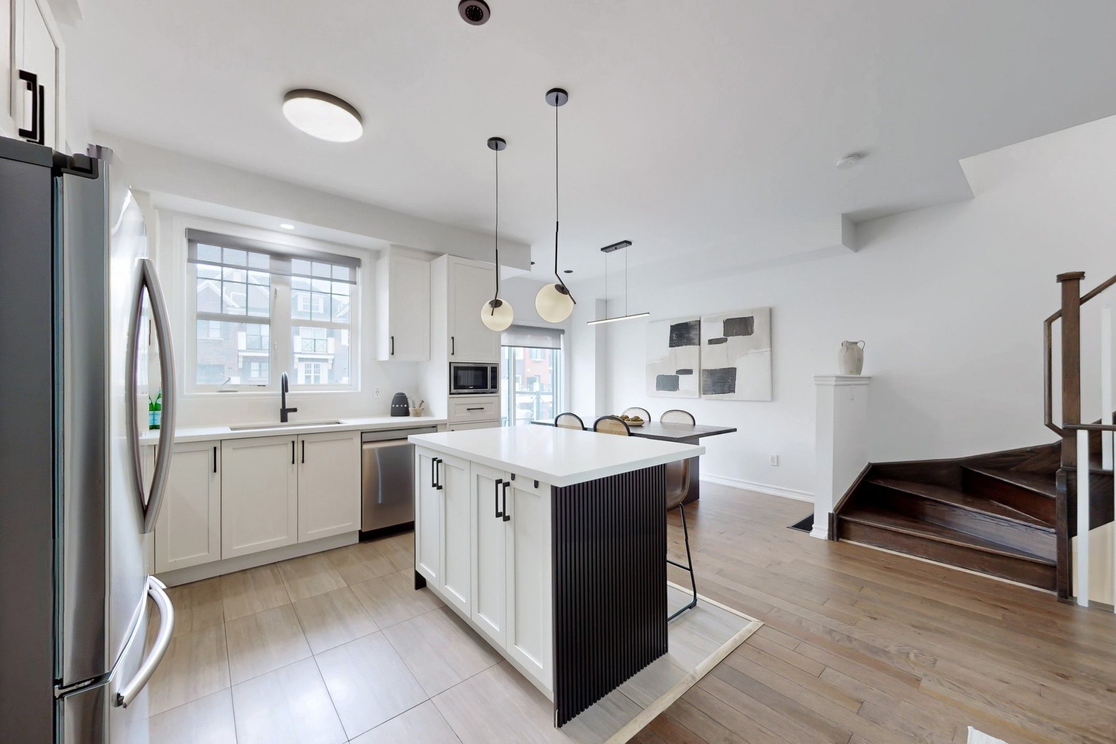 Welcome to 19 Wimshaw Lane. This beautifully upgraded 2-bedroom, 2-bathroom Minto freehold townhouse offers approximately 1,292 sq.ft. of thoughtfully designed, move-in-ready livingspace in the heart of Stouffville. The home features extensive upgrades throughout, beginning in the stunning kitchen. Enjoy a newly updated fluted range hood & matching island detail,quartz countertops w/ a seamless matching backsplash, upgraded S/S appliances including a sleekslide-in stove, added cabinetry w/ B/I microwave, upgraded tile flooring & stylish pendant lighting.The inviting living room is the perfect place to unwind, showcasing a flushwall-mounted electric fireplace ('25)& __"flush TV insert('25) surrounded by elegant built-inshelving for added storage. The dining area comfortably accommodates a six-person table, alongwith additional seating at the kitchen island-ideal for entertaining family andfriends.Upgraded hardwood flooring flows throughout the second and third floors, as well as thestaircase. Both upper-level bathrooms feature upgraded cabinetry, quartz countertops, modern mirrors, lighting, & upgraded fixtures. The primary bedroom offers dual custom closetsw/built-in shelving & a charming Juliette balcony that fills the room w/natural light. The 2nd bedroom features a large window & custom closet organizers. Elegant wainscoting accents thefoyer & second bedroom, adding timeless character. Additional highlights include a newly installed A/C unit ('24) relocated to the side of the home (freeing up valuable balconyspace).Ample storage is available in the crawl space and garage, which also features built-instorage solutions. The exterior boasts beautiful curb appeal w/modern interlock landscaping (2025) & parking for 2 vehicles in the driveway. Located close to the GO Station,shops, restaurants, parks,& more-this exceptional home truly has it all.Don't miss your opportunity to own this stylish, turnkey property w/all the extra touches you've been looking for.