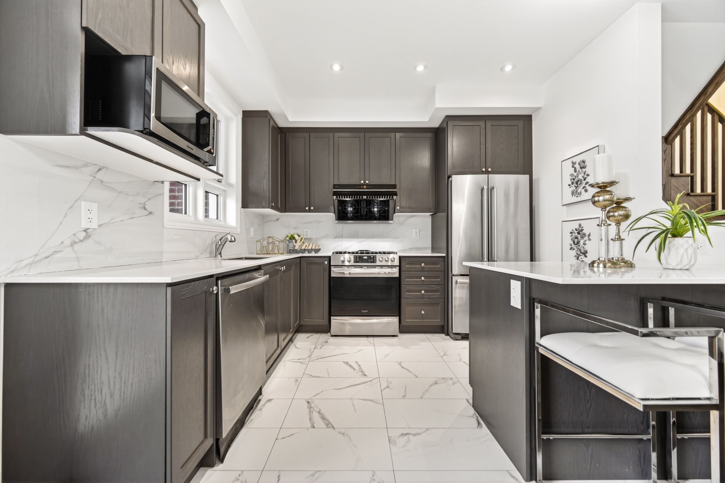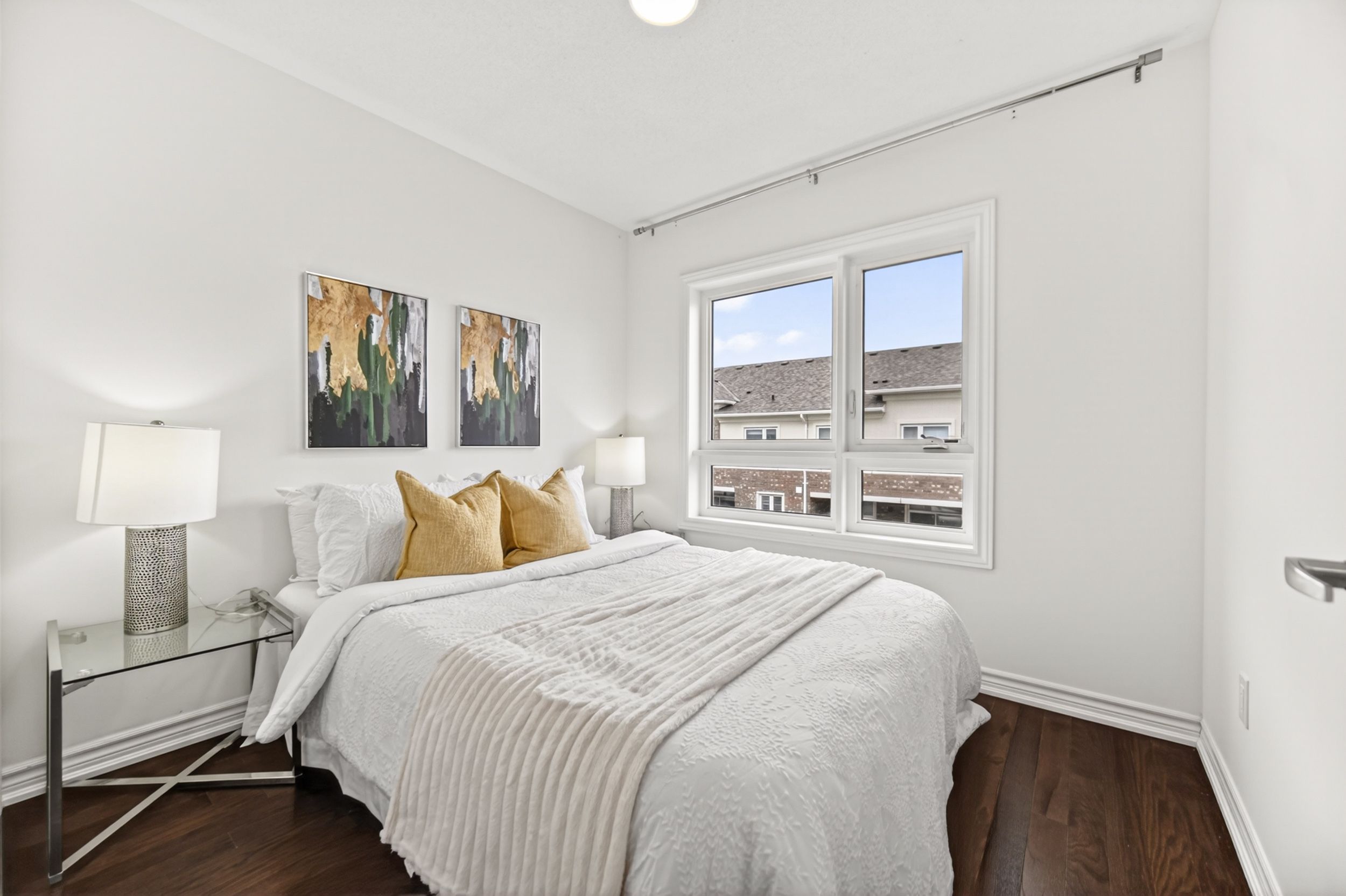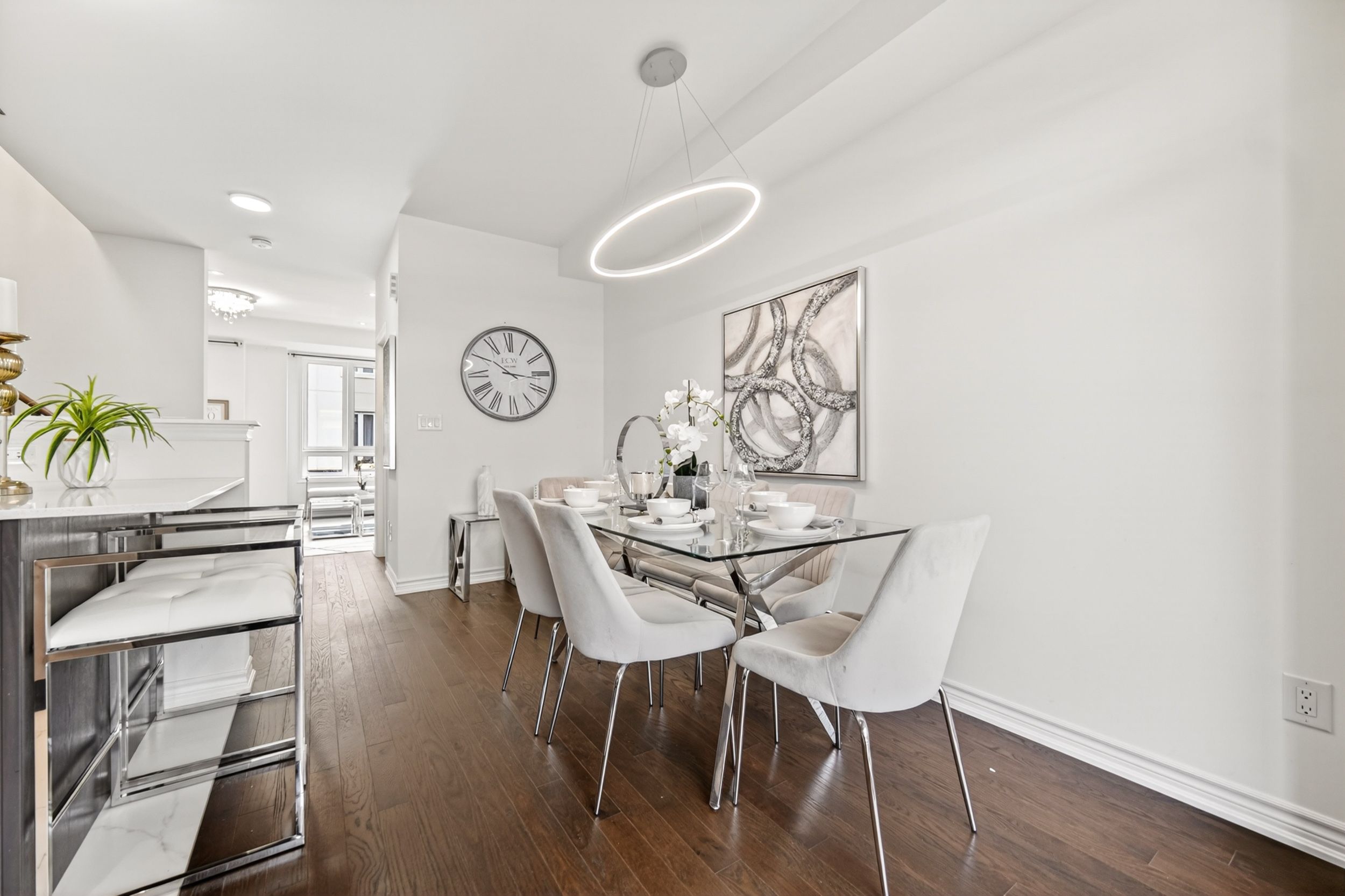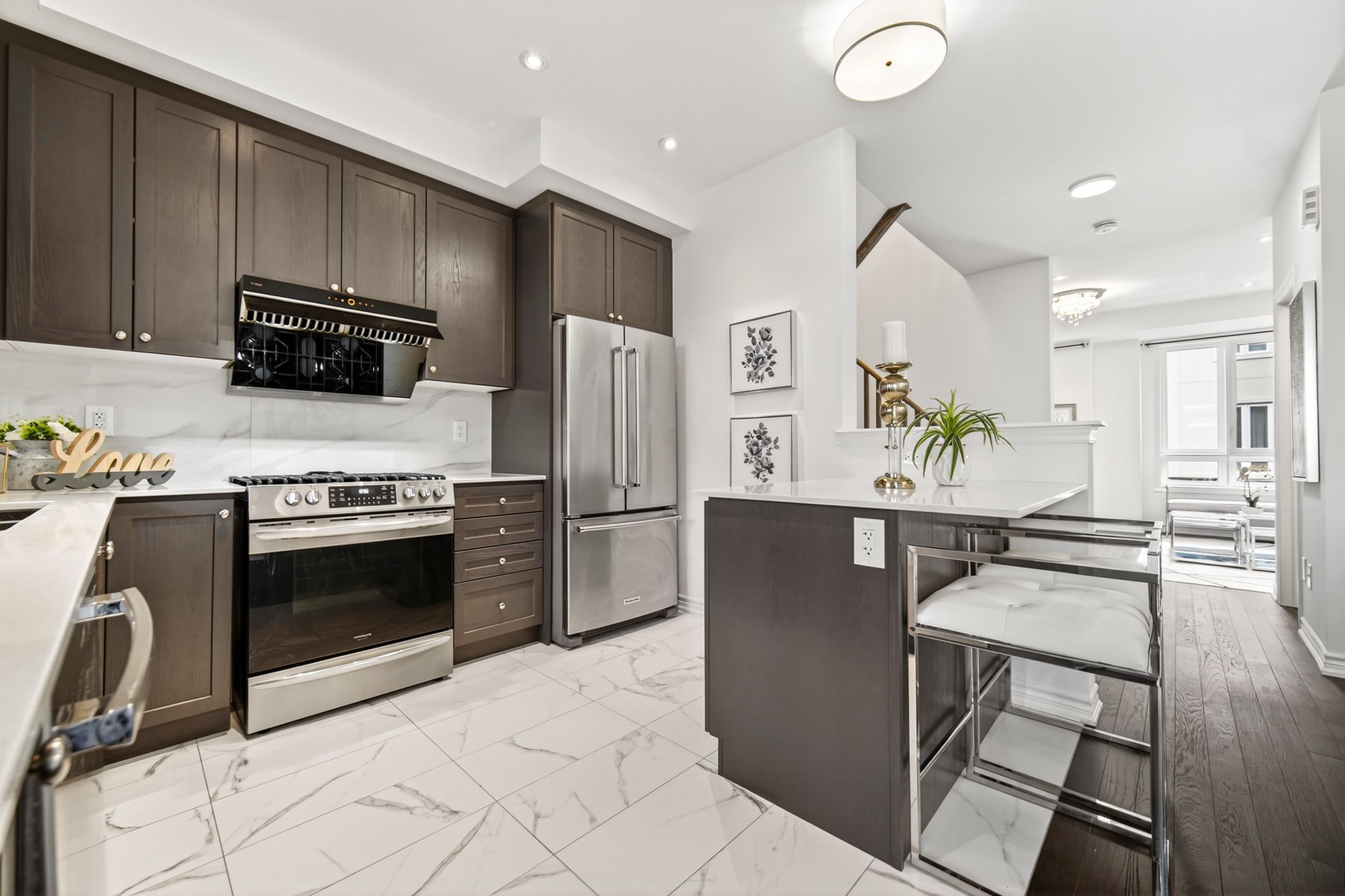 Gorgeous, Warm and Inviting Four Year Old 3 Bedroom Freehold Townhouse, flooded with natural light in the desirable Wismer Community. Meticulously Maintained with extensive upgrades throughout: 9' High W/Smooth Ceiling, Large Kitchen With Granite Counter, Centered Island! Hardwood Floor throughout, Waterline To Fridge, Gas Stove Rough-In. Ceiling Fixture Rough-In, Dining Room Walk Out To Balcony. Upgraded Floor Tiles, New Light Fixtures, Pot Light Fixtures, All Upgrade Washroom, Convenient Visitor Parking. Direct Access To Garage. Minutes To Park, Schools, Plaza, Restaurant, Supermarket, Mount Joy Go Station, Public Transit & More. Top Ranking Donald Cousens PS & Bur Oak SS. A Must See! **EXTRAS** Upgraded Centre Island and Counter In Kitchen, Upgraded Light Fixtures, Whole House Water Softener System Installed.POTL $133.24/Month (Snow Removal/Garbage)