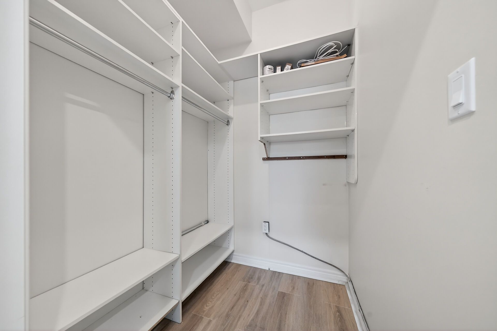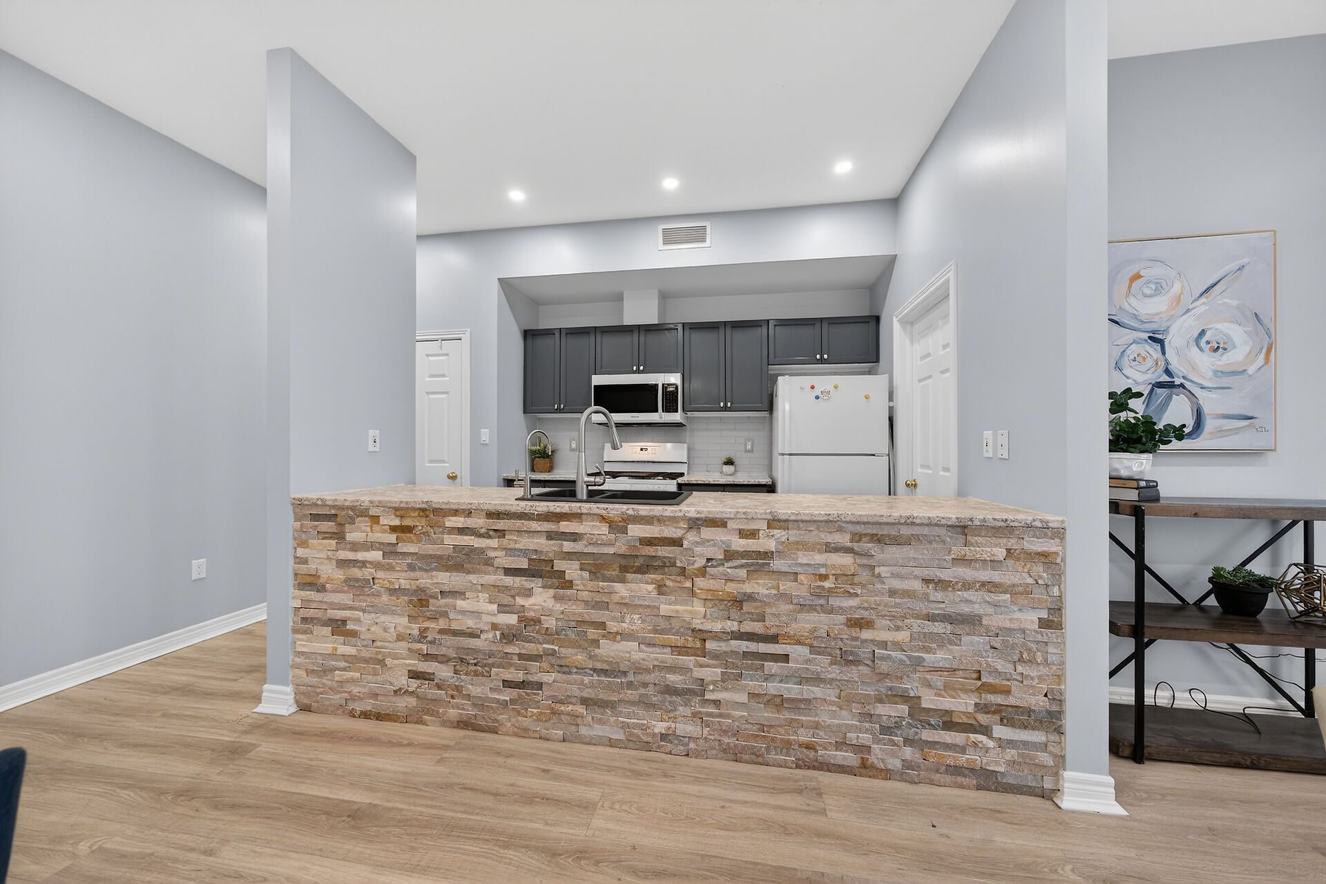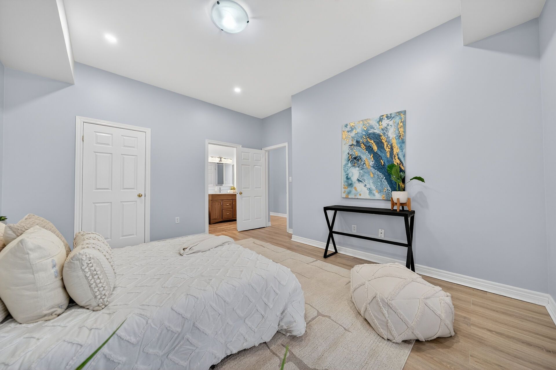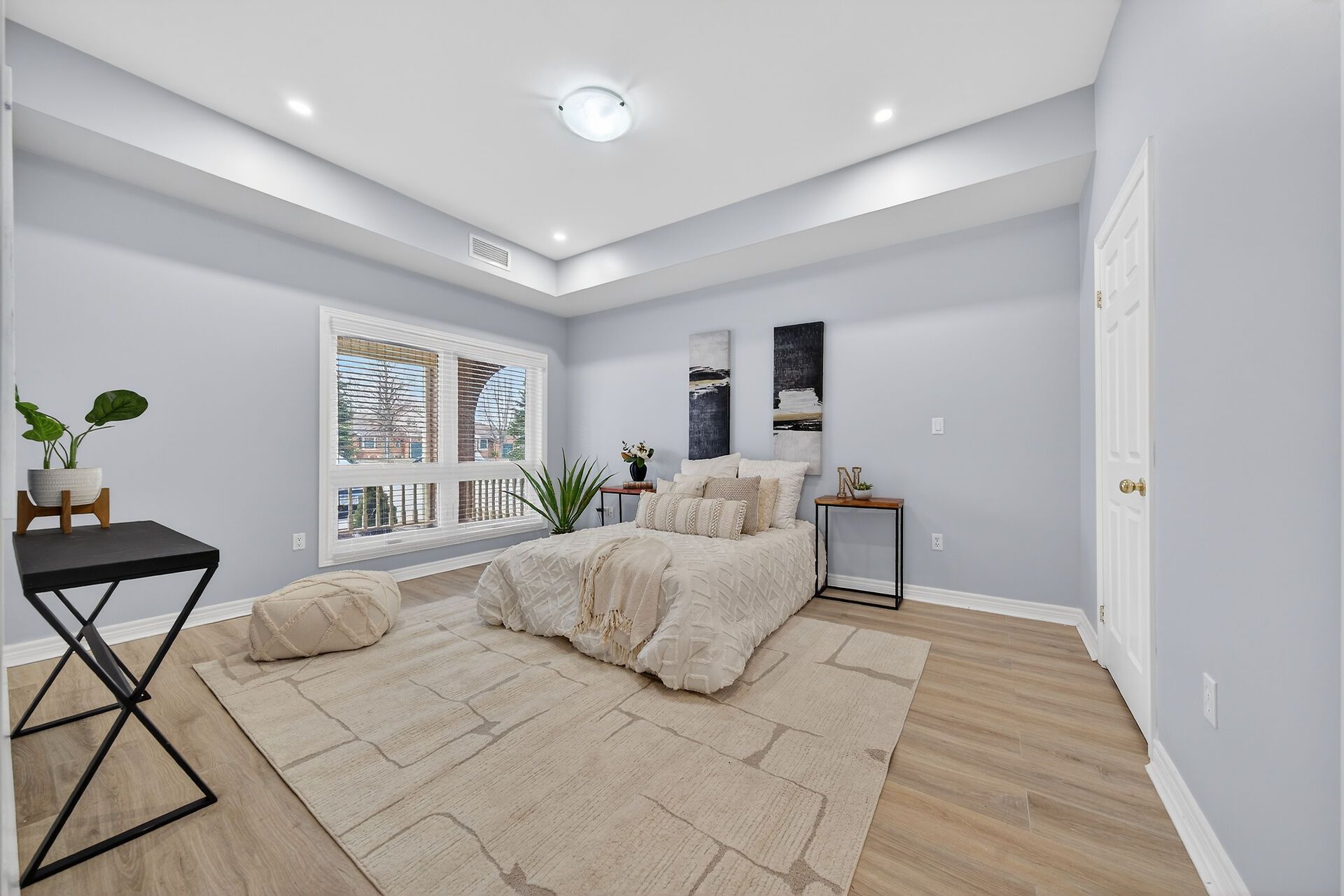Recently renovated and move-in ready! This stunning Twenty Place condominium features a complete modern transformation, including fresh paint and upgraded light-bleached laminate flooring throughout. The kitchen shines with contemporary grey cabinetry, updated counters, and a stylish backsplash, while the main ensuite boasts a premium full-glass shower, new tiling, and designer lighting. With 23 added pot lights, the space is bright and airy, leading out to a peaceful rear sitting area overlooking a scenic pond. Residents enjoy a reserved parking spot and easy access to the vibrant Community Centre with indoor pool and hot tub, offering daily activities like pickleball, tennis, and billiards. A perfect retreat for downsizers!