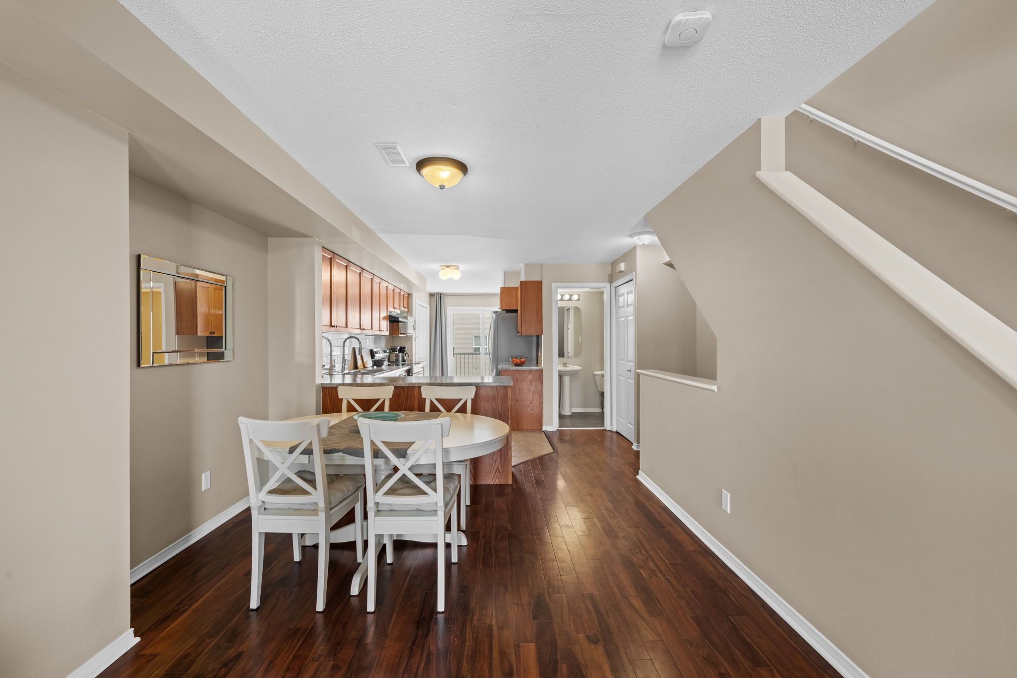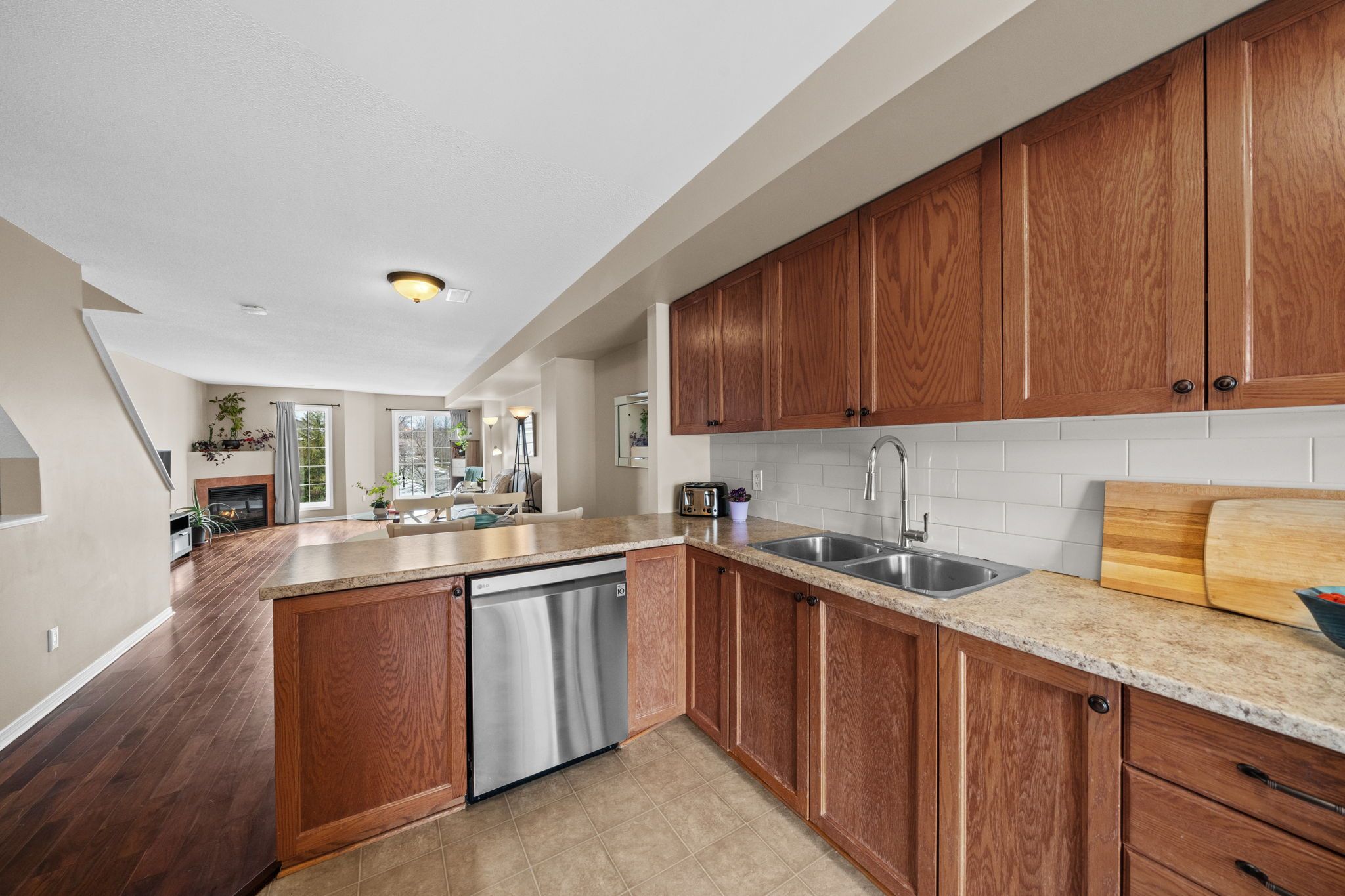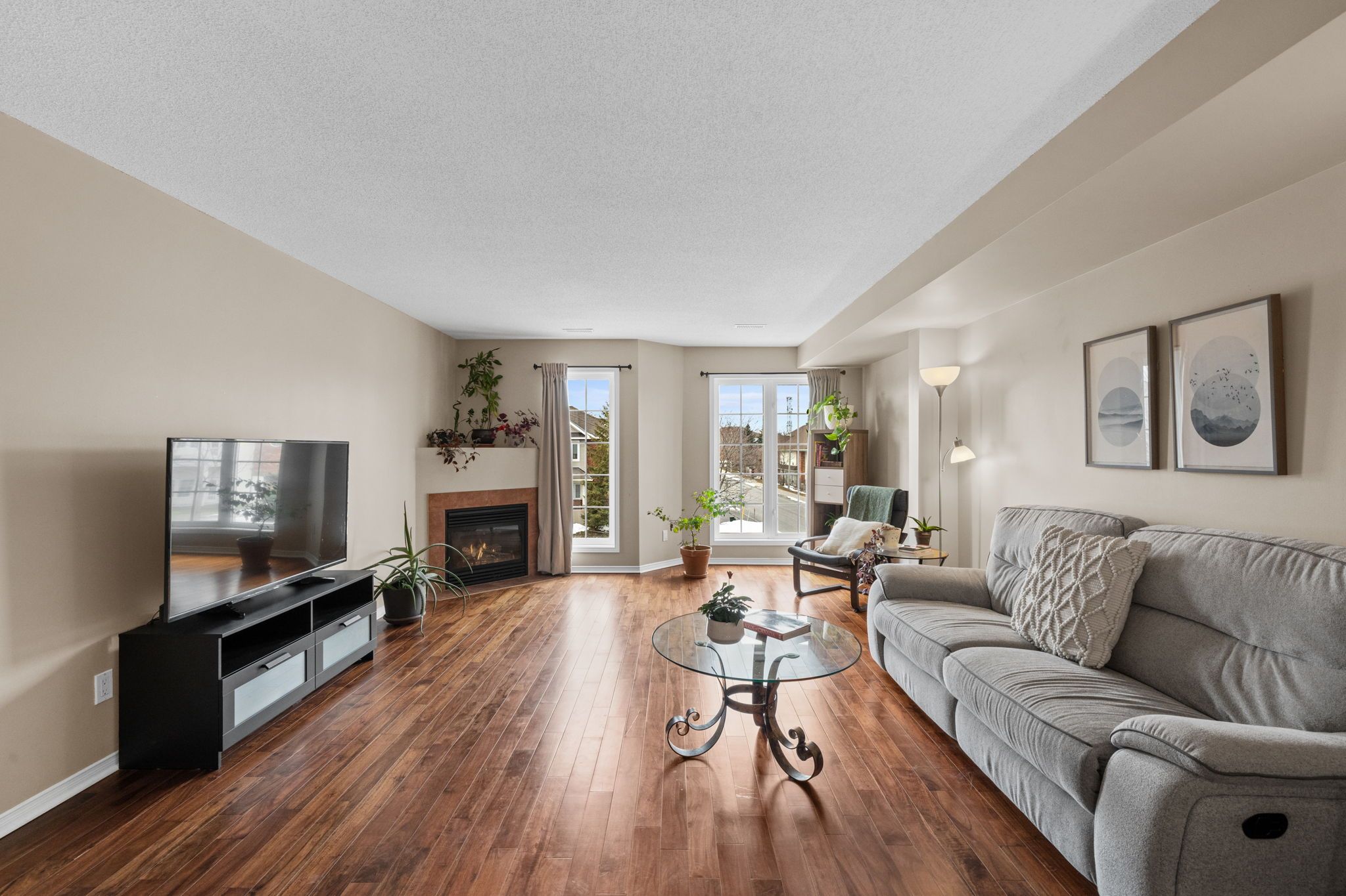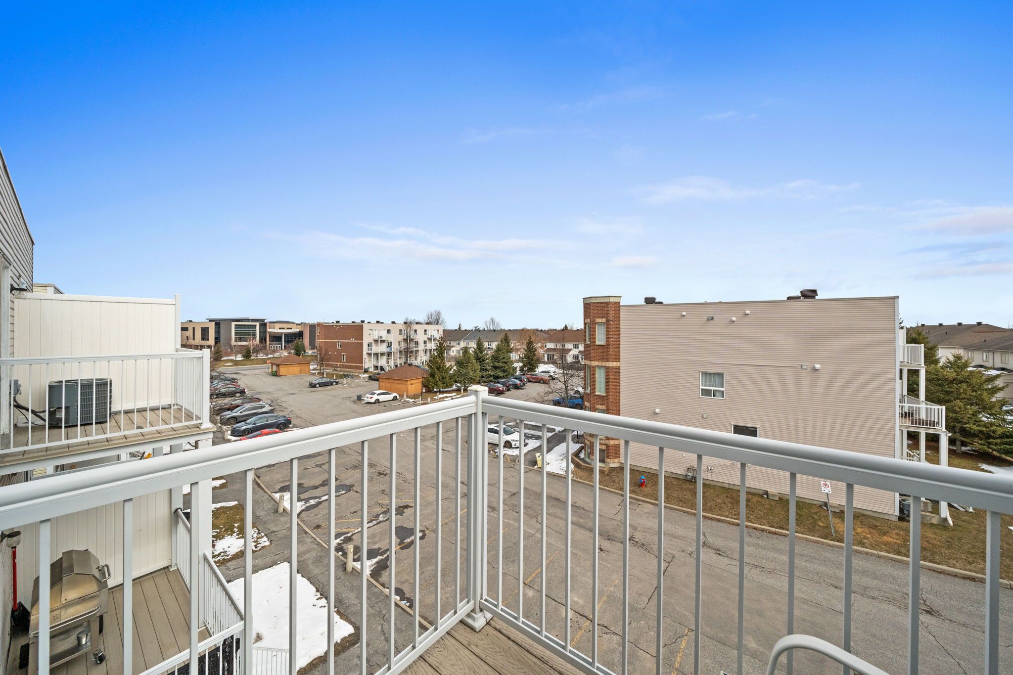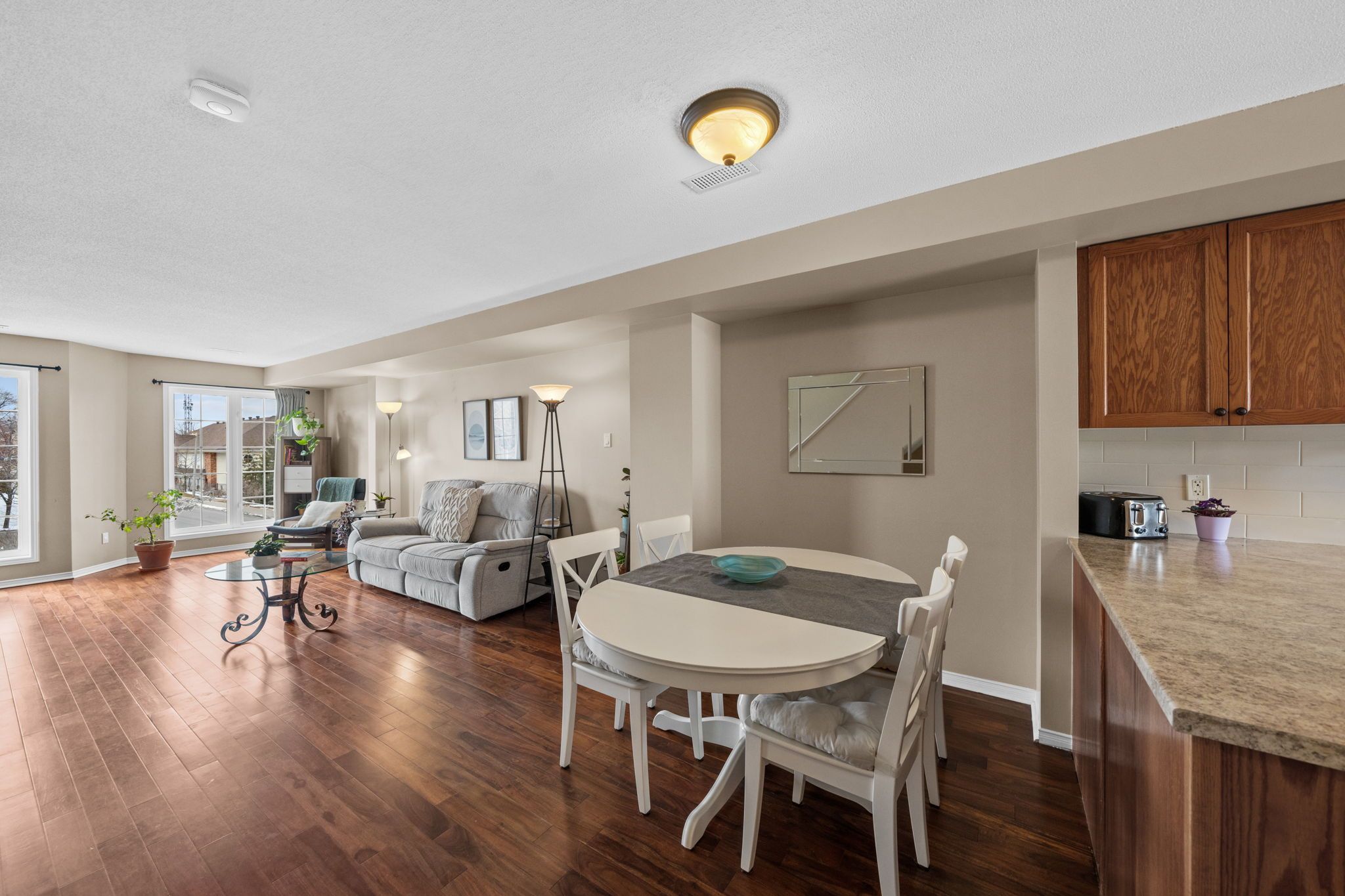 Well-maintained 2-bedroom, 3-bathroom two-level condo in Barrhaven offering approximately 1,358 sq ft of bright and functional living space. The main level features a spacious open-concept living and dining area with laminate flooring, large windows, and a gas fireplace, creating a comfortable and inviting space. The kitchen offers ample cabinetry, laminate countertops, a double sink, and a convenient eat-in area that can also function as a home office, with direct access to a private balcony. A 2-piece powder room and additional storage complete this level. The upper level provides excellent separation with two generously sized bedrooms, each featuring its own 3-piece ensuite. The primary bedroom includes two windows and access to a second private balcony, while the second bedroom offers a large closet and bright natural light. In-unit laundry is conveniently located on this level. Includes one parking space (#29). Ideally located close to schools, parks, transit, and everyday amenities in a well-established Barrhaven community.